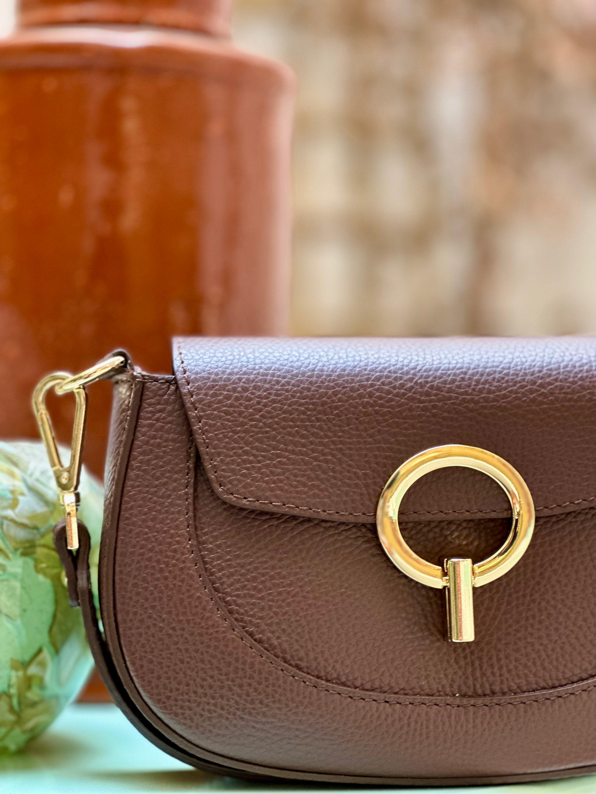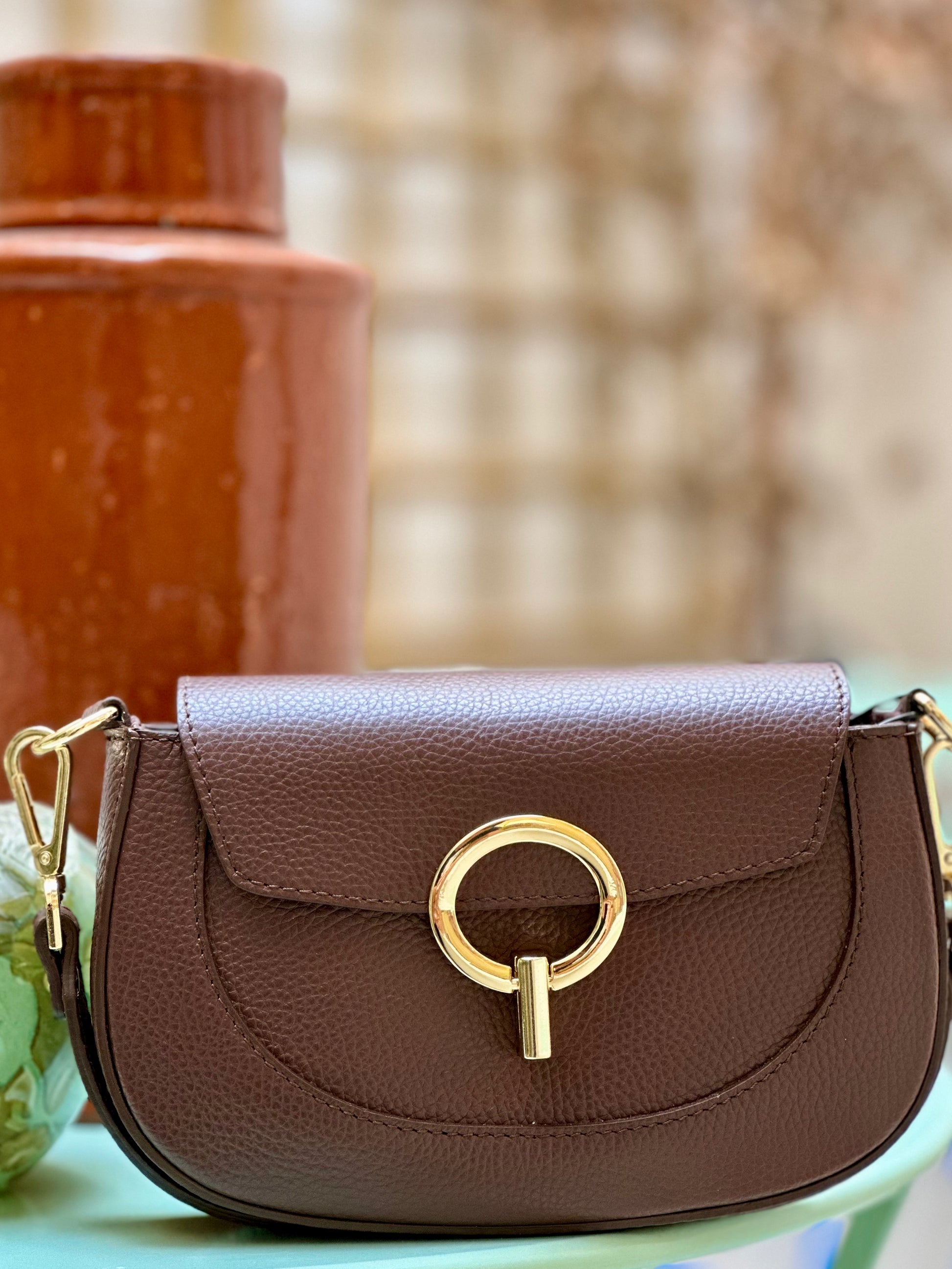 Bolso Alessandra Chocolate de piel elegante y con estilo es perfecto para cualquier ocasión. Su cierre dorado le da un toque de sofisticación y seguridad. Confeccionado con materiales de alta calidad, es duradero y resistente. ¡Complementa tu look con este bolso, es perfecto para cualquier momento!