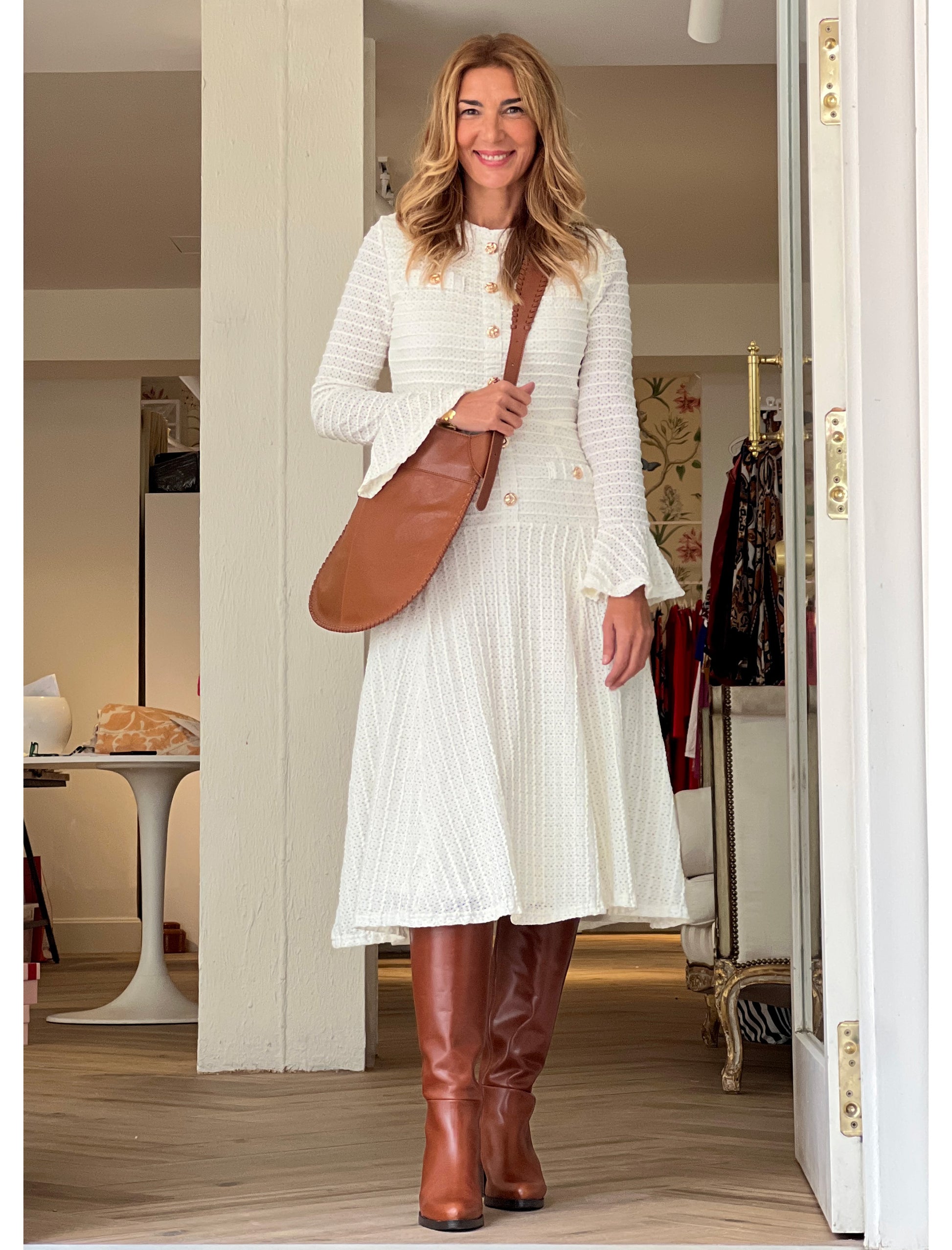La Bota Para Todo Cuero fabricada artesanalmente en España con piel serraje de primera calidad, su textura suave y su tono marrón cálido combinan con todo: vestidos, faldas o pantalones. Ofrece una pisada estable que estiliza la silueta sin renunciar al confort.