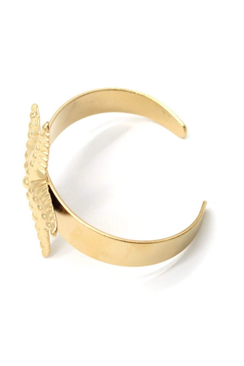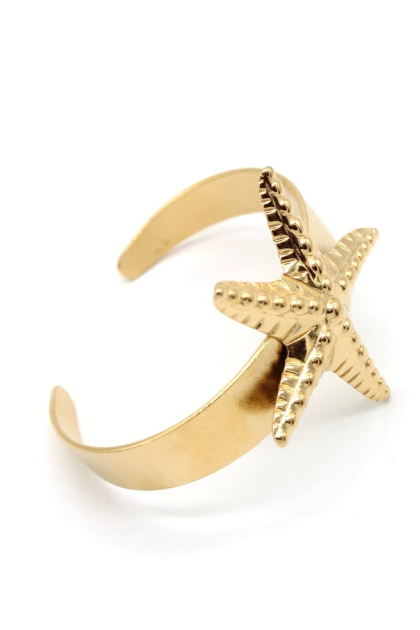Brazalete marino de acero inoxidable color oro, con un delicado adorno en forma de estrella de mar. Su diseño abierto permite adaptarlo fácilmente a tu muñeca. Ideal para combinar con vestidos vaporosos, camisas blancas o incluso jeans y tops, aportando siempre un aire fresco y sofisticado.
