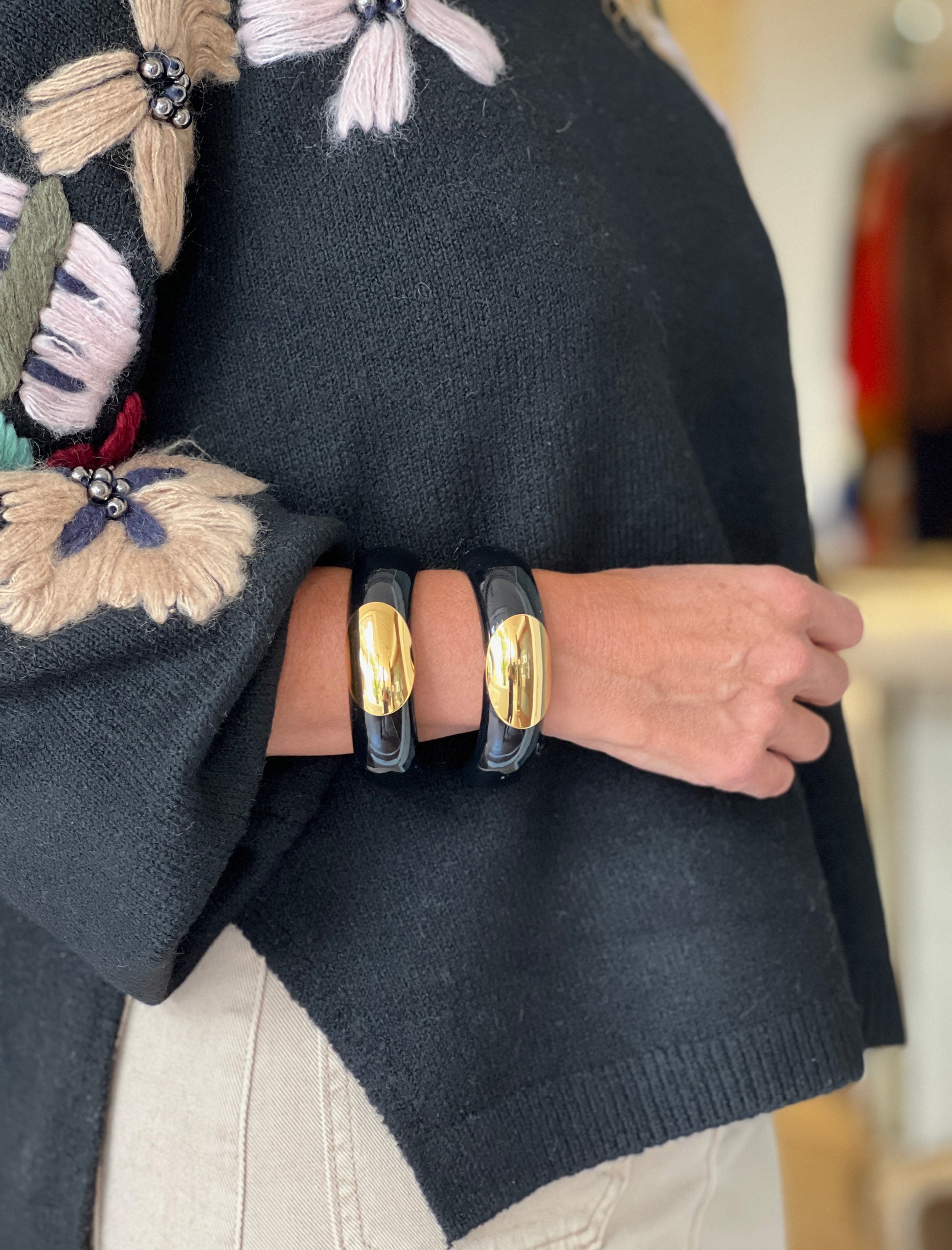 Brazalete oval negro rígido con detalle oval en dorado en el centro, una pieza que combina elegancia y carácter. Su diseño realza la muñeca y aporta un toque elegante a cualquier look. Ideal para combinar con camisas o jerséis de manga tres cuartos.