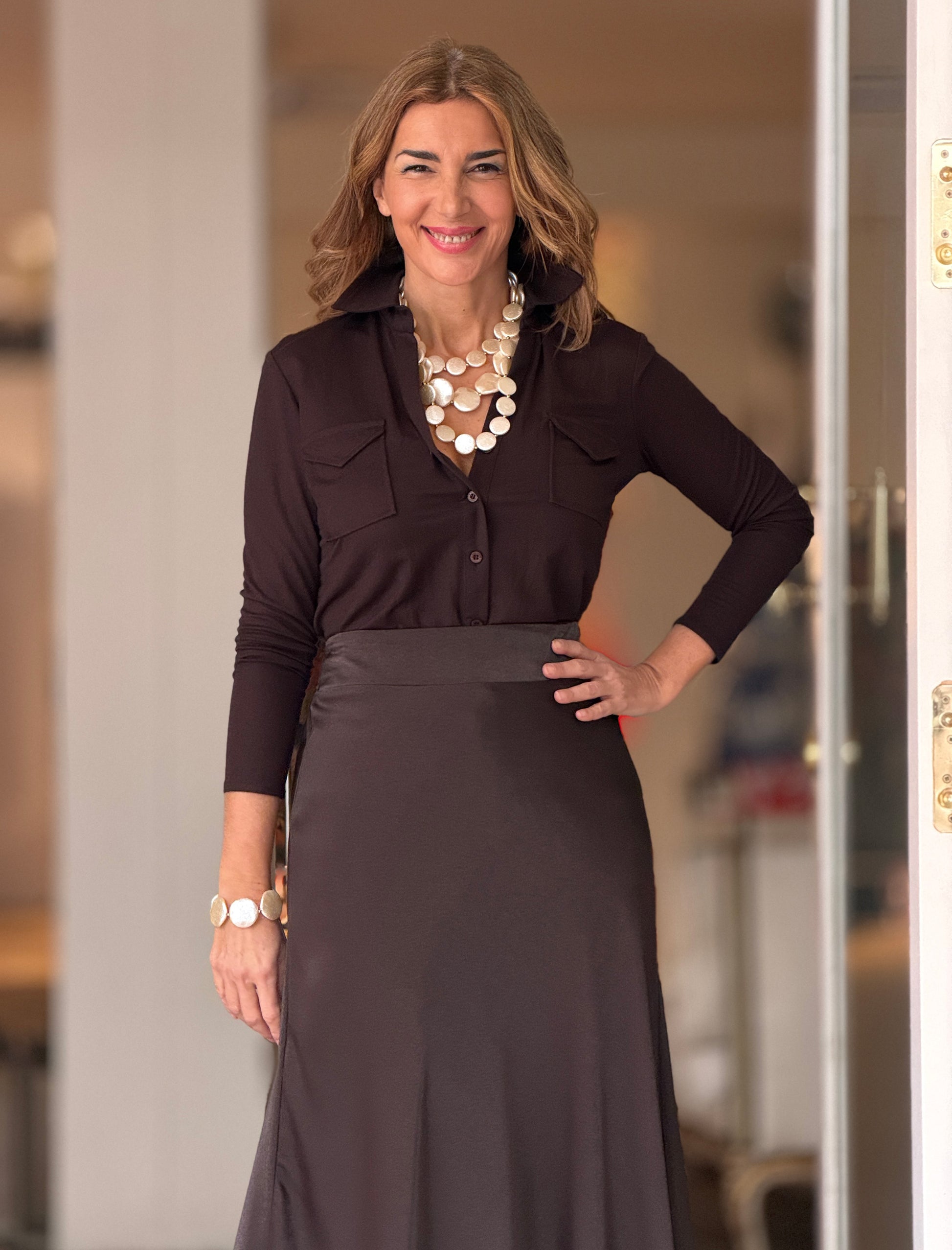 Camisa de viscosa para todo marrón chocolate confeccionada en un tejido suave, presenta un escote en pico, cuello abierto y bolsillos en el pecho que realzan la silueta y aportan un toque actual, convirtiéndola en una pieza muy versátil para tu fondo de armario.