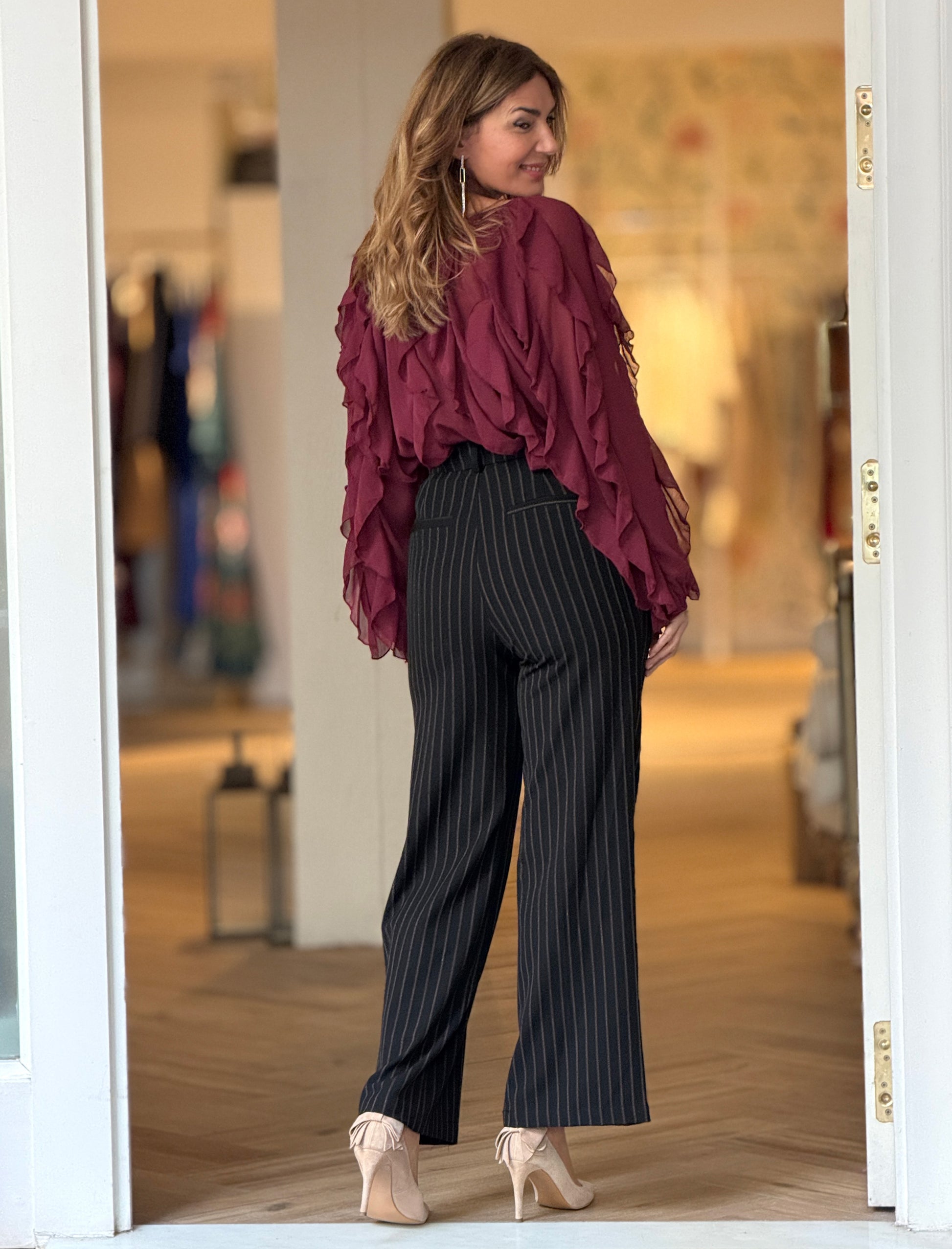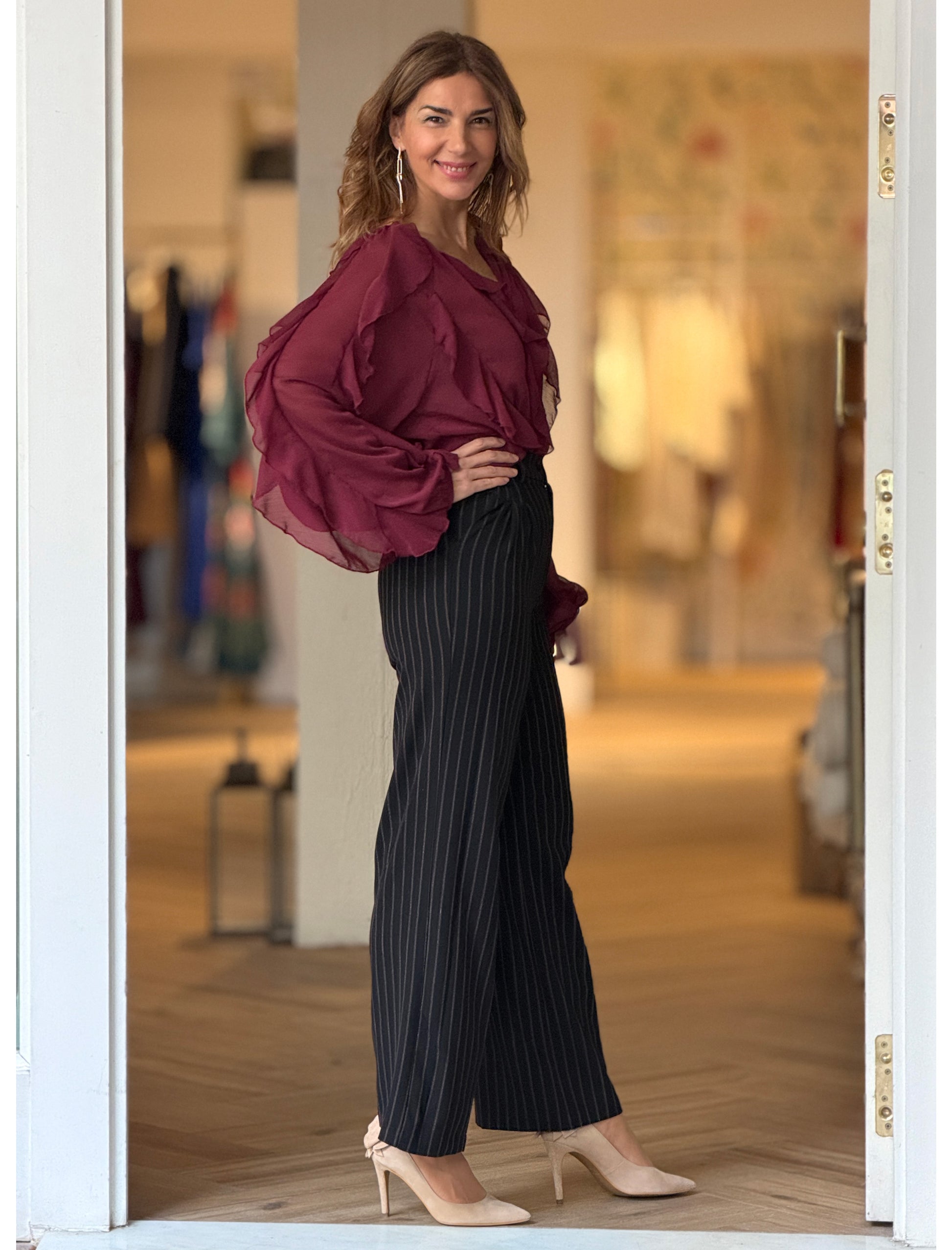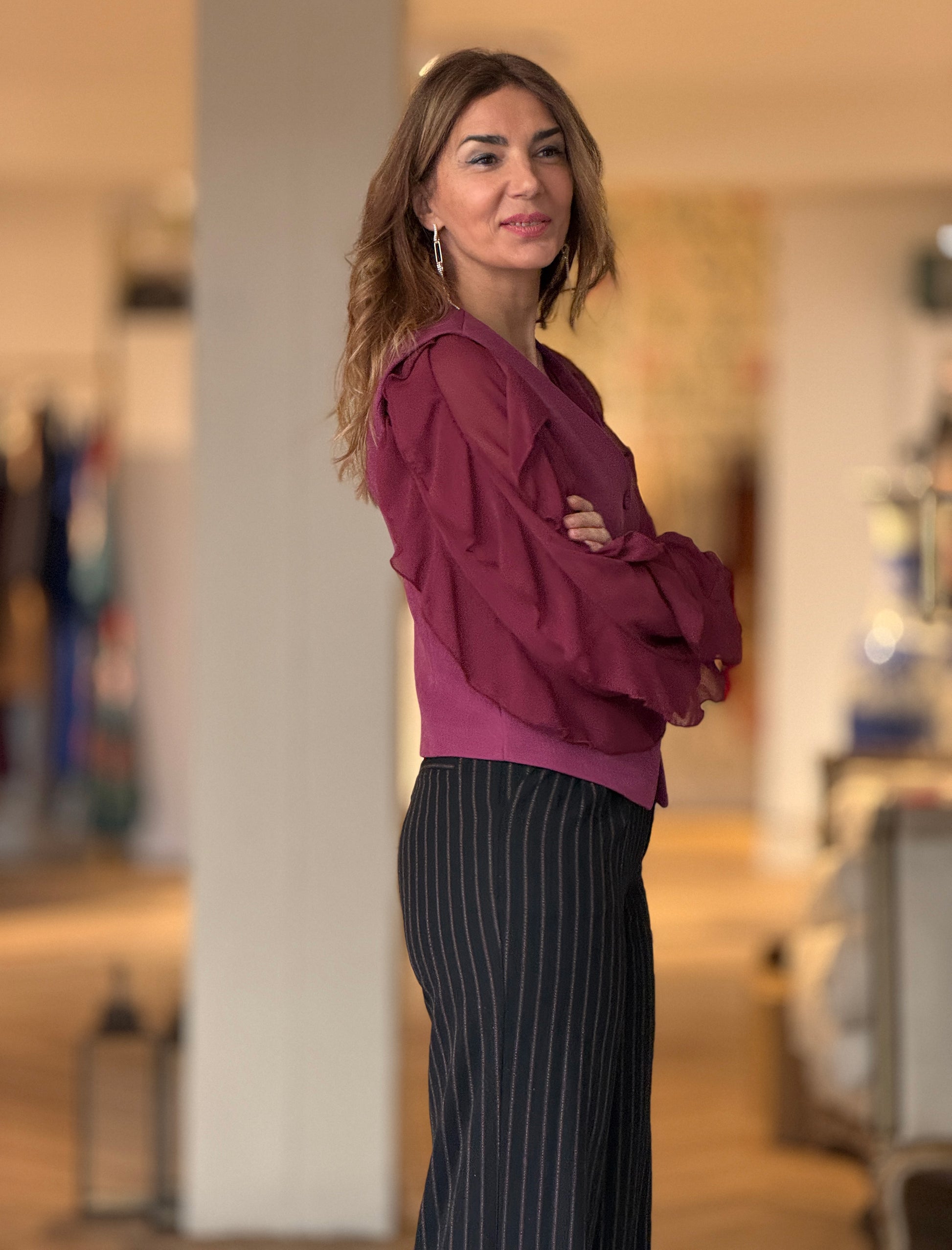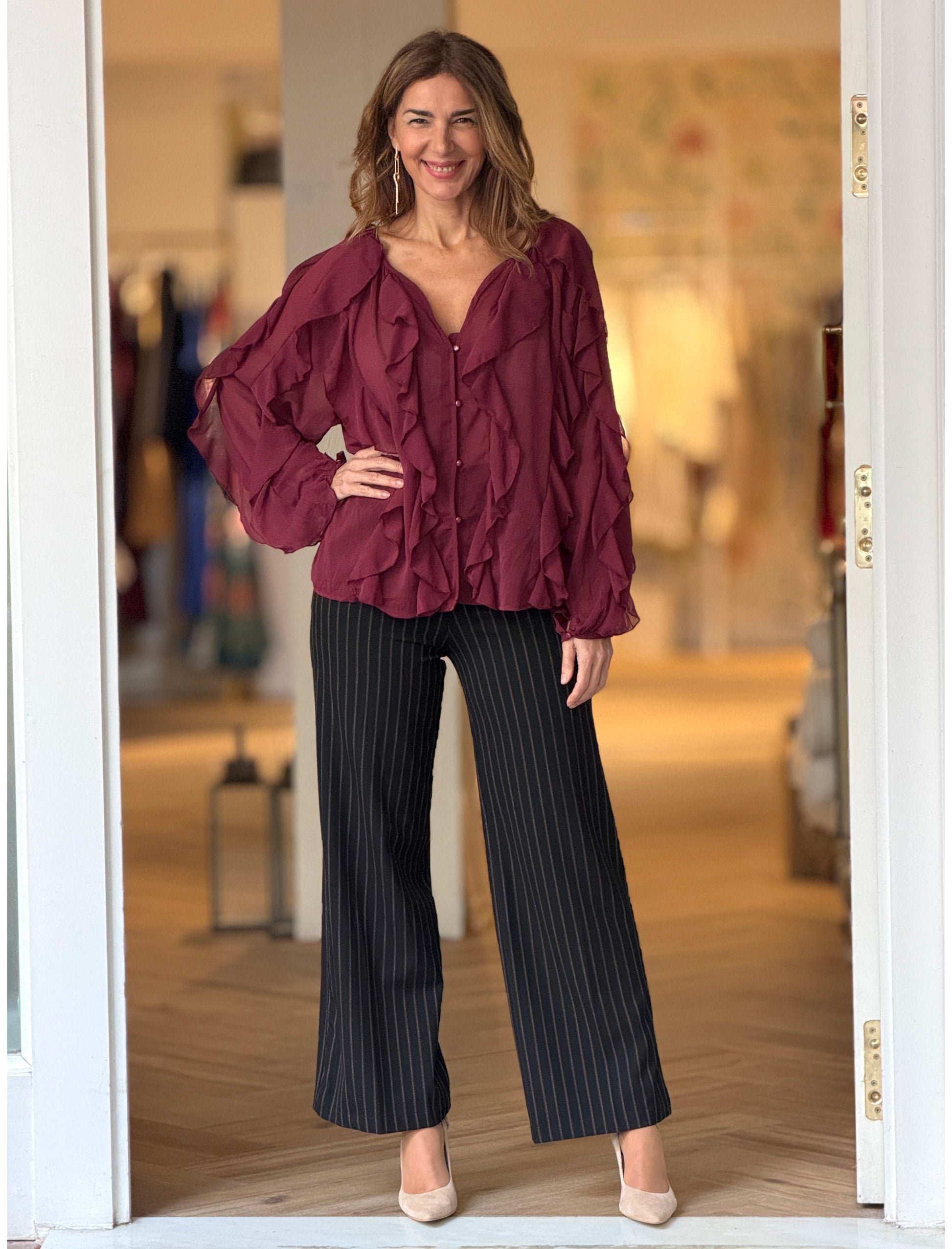 Camisa de volantes burdeos tiene un color burdeos precioso, muy favorecedor, que da luz al rostro y queda genial tanto de día como de noche. Lleva escote en pico con detalle de volantes, que aporta un toque chic. Es de esas camisas que te pones con un pantalón sencillo y ya tienes el look hecho. Perfecta para cenas, para trabajar o para cualquier plan en el que quieras ir un poco más especial.