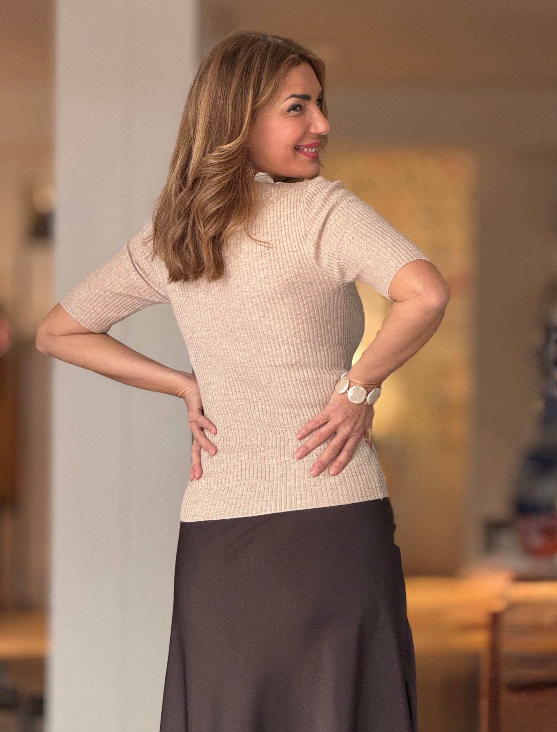 Esta camiseta beige de canalé suave es en toda regla un fondo de armario maravilloso. Tiene ese punto elegante que combina con absolutamente todo y marca la diferencia. El canalé se adapta al cuerpo sin apretar, estiliza y resulta comodísimo. El escote en pico con pequeño detalle de botones le da un toque muy chic, ideal para llevar con falda midi, pantalón fluido o tus jeans favoritos.