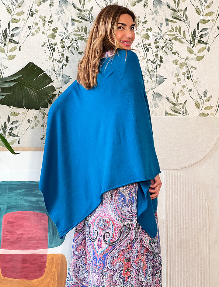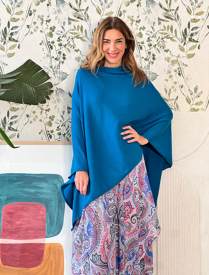 Capa Chic Deliciosa Azul Turquesa es la prenda perfecta para aportar color y estilo a tus looks de entretiempo. Su tejido suave y fluido envuelve con elegancia, ofreciendo un movimiento favorecedor en cada paso. Con su diseño versátil es ideal para combinar con vestidos, pantalones o faldas, creando conjuntos muy chic.