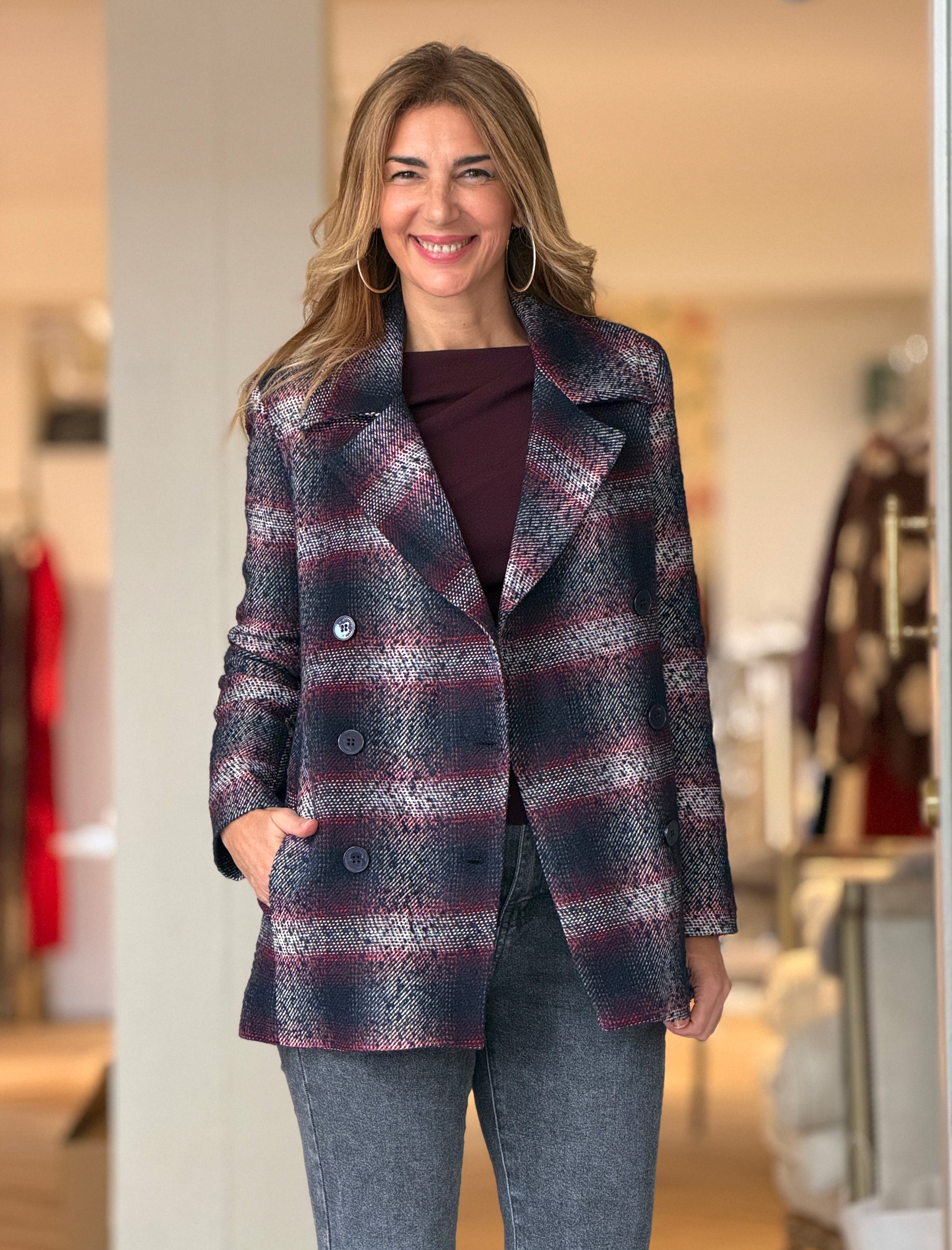 La Chaqueta Lobo de Mar Chic presenta un diseño tipo marinero con doble botonadura, que junto a su estampado en tonos burdeos, azul y blanco, crea una prenda elegante y atemporal. La textura suave y su estructura entallada aportan un efecto estilizador y elegante que realza la figura.