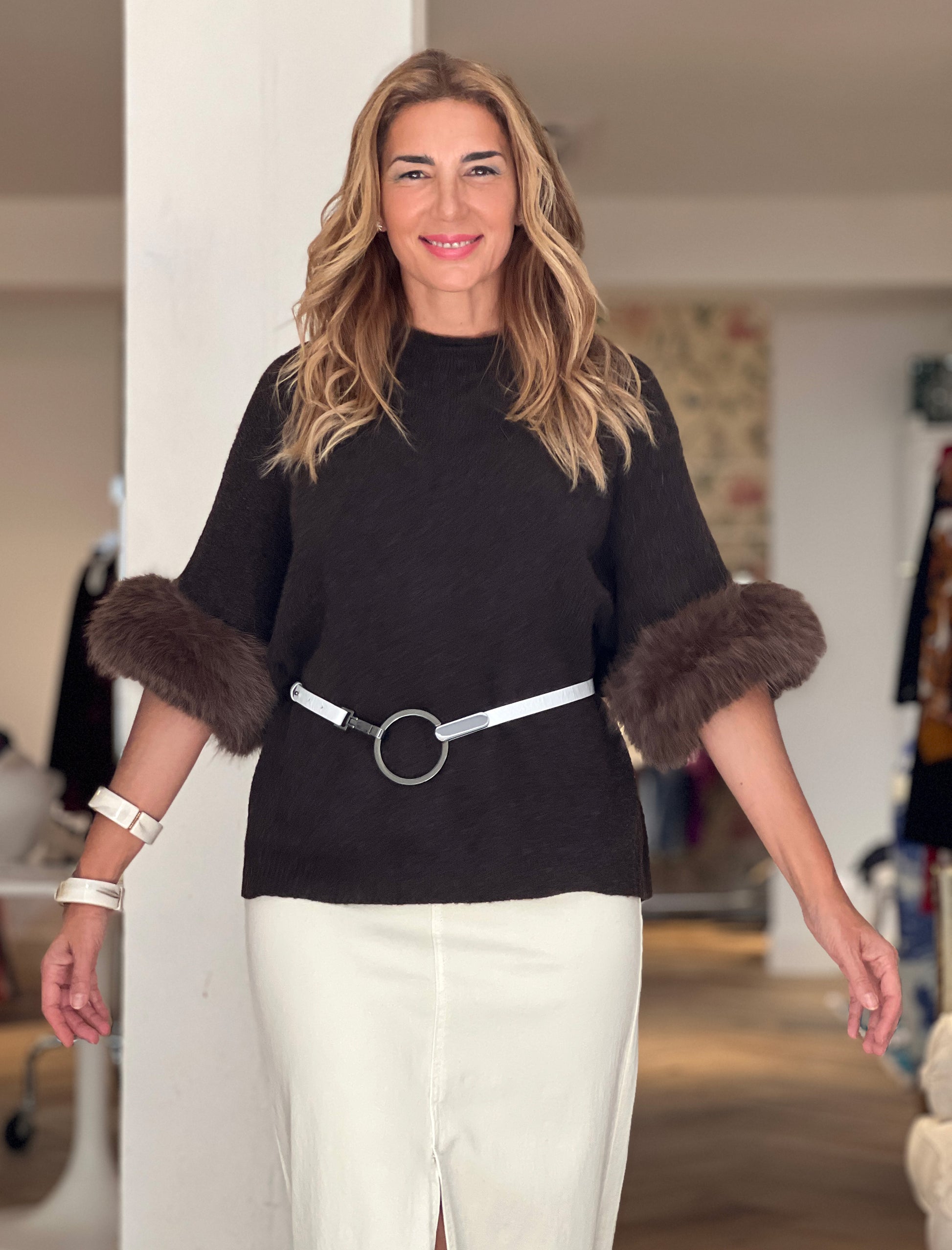 Cinturón especial blanco de piel con hebilla circular metálica. Una pieza que realza la silueta y aporta un toque sofisticado a vestidos, jerséis o blazers. Su acabado y su estilo versátil lo convierten en un accesorio imprescindible en tu armario.