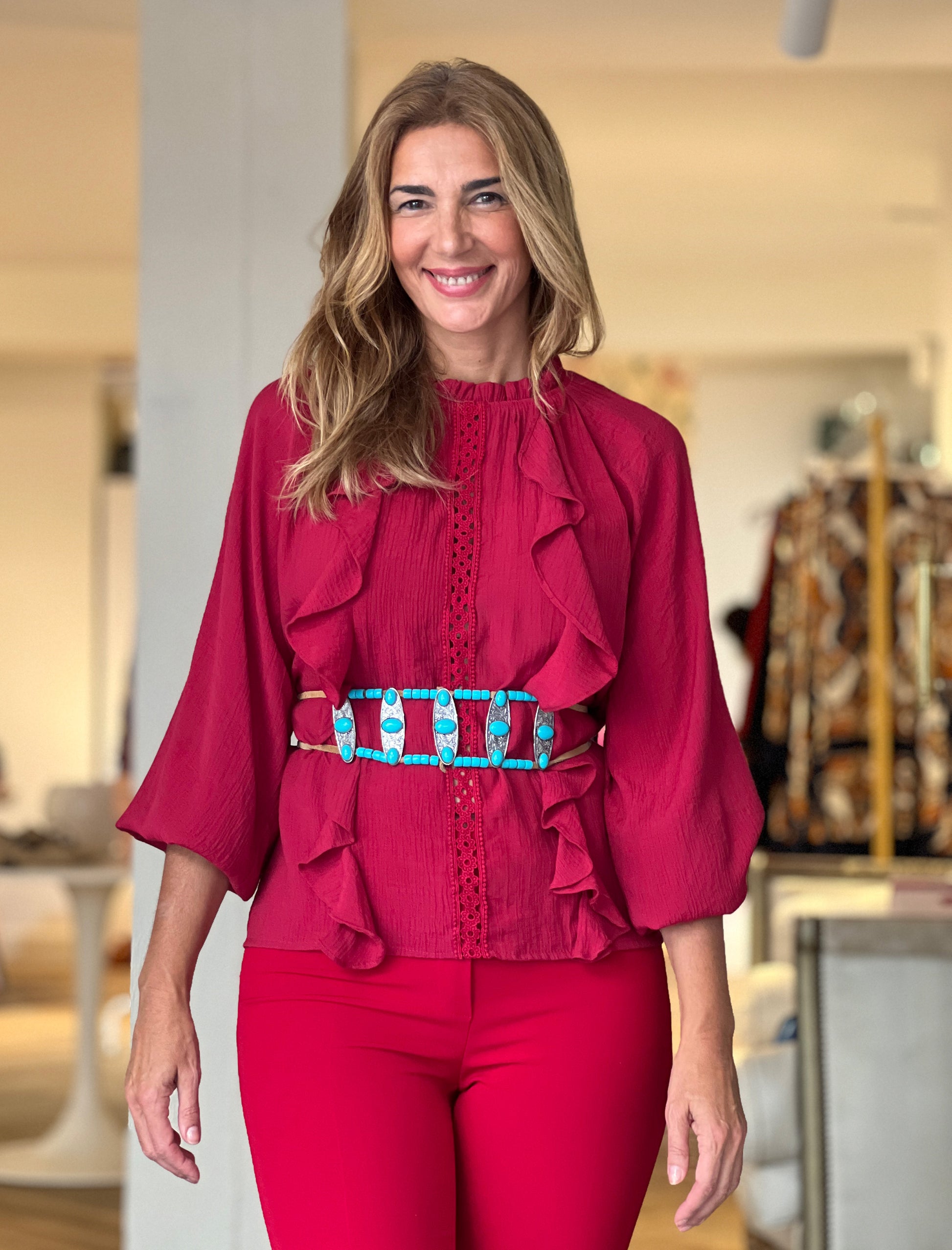 Cinturón étnico ovalado artesanal con piezas metálicas grabadas en color plata vieja y apliques azul turquesa. Con tiras de cuero que se adapta cómodamente a la cintura, aportando color y personalidad a vestidos, camisas o pantalones. Un accesorio único para transformar cualquier look con un toque boho-chic.