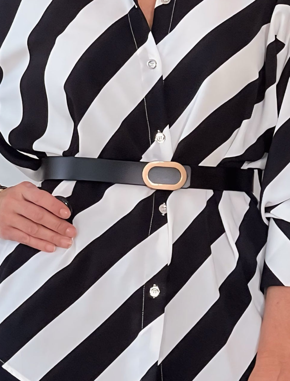 Cinturón Ideal Negro de piel es un complemento que transforma un conjunto sencillo en algo especial. Posee una hebilla ovalada en oro mate. Se ajusta mediante agujeros, adaptándose así a la cintura.