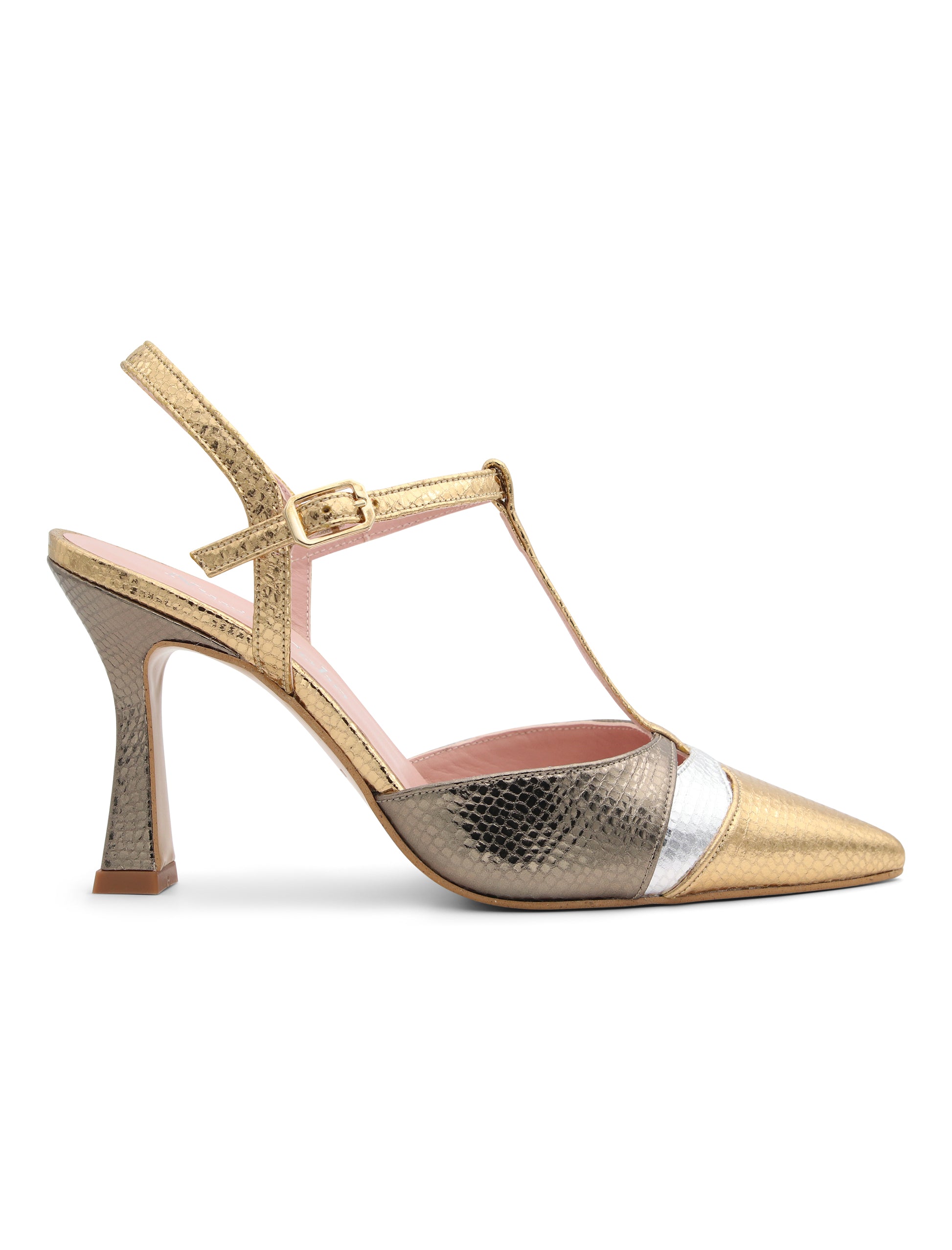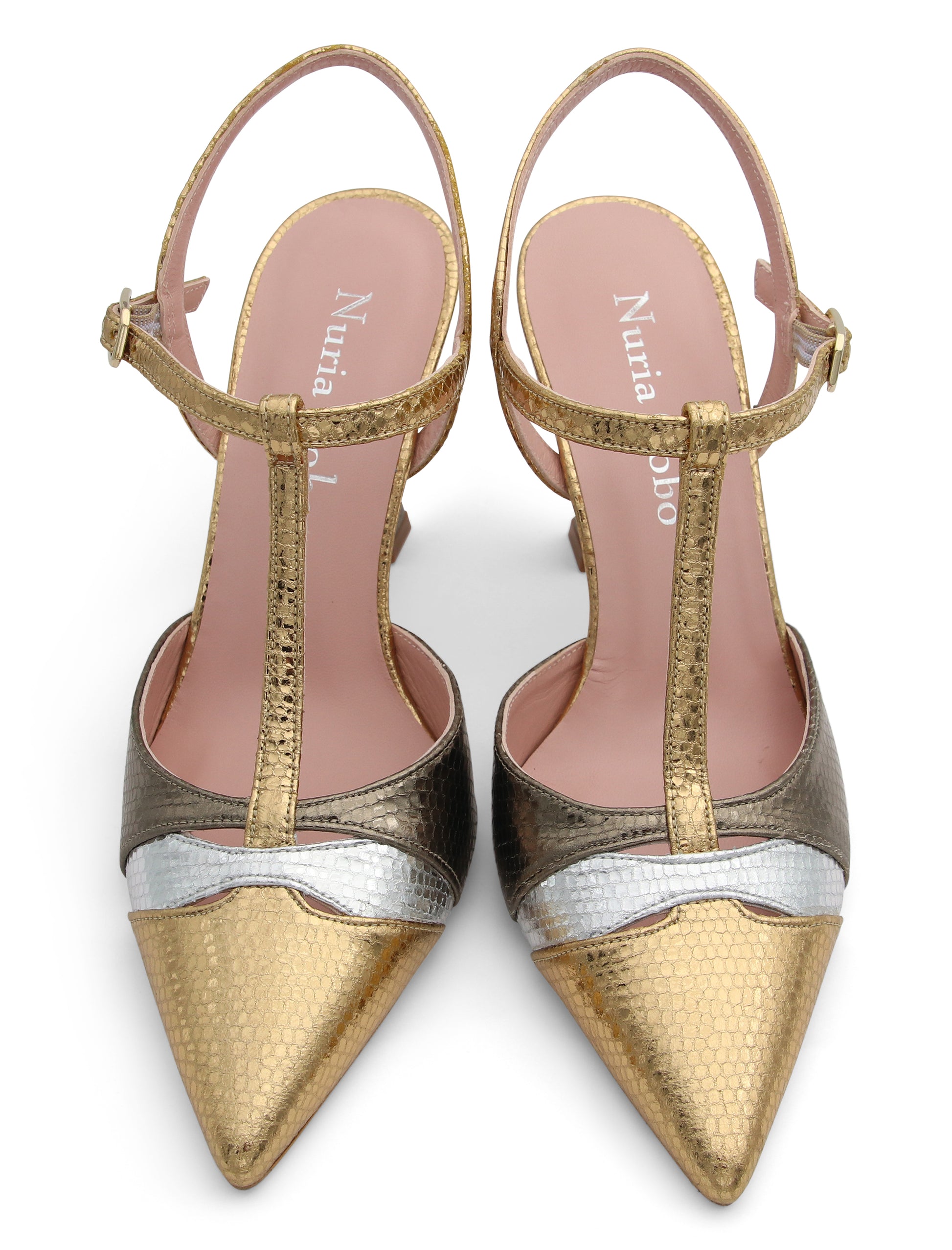 Salón destalonado en pieles metalizadas oro, bronce y plata,está fabricado artesanalmente con las mejores pieles y es especialmente cómodo ya que tiene piso de goma y planta acolchada y una horma que sujeta perfectamente el pie.