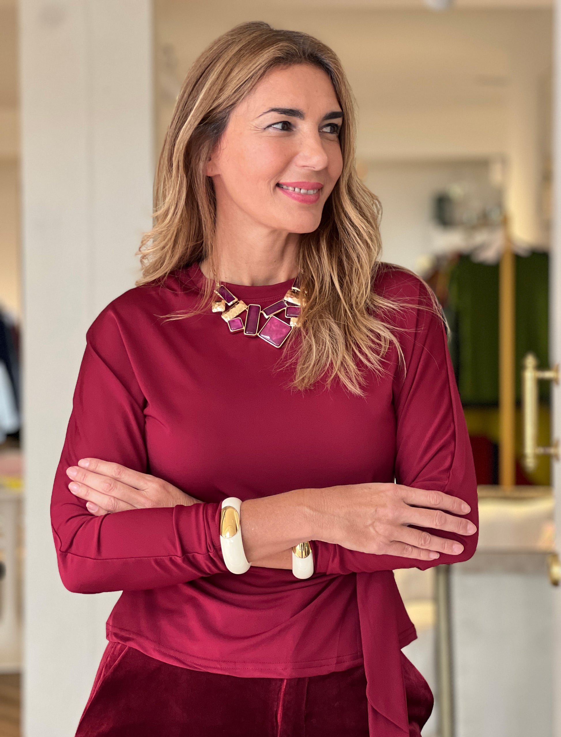 Cuerpo lazada burgundy con escote redondeado y una lazada en la parte lateral que aporta un toque muy favorecedor. Ideal para combinar con vaqueros o pantalones de vestir, y perfecto tanto para looks de diario como para ocasiones especiales.