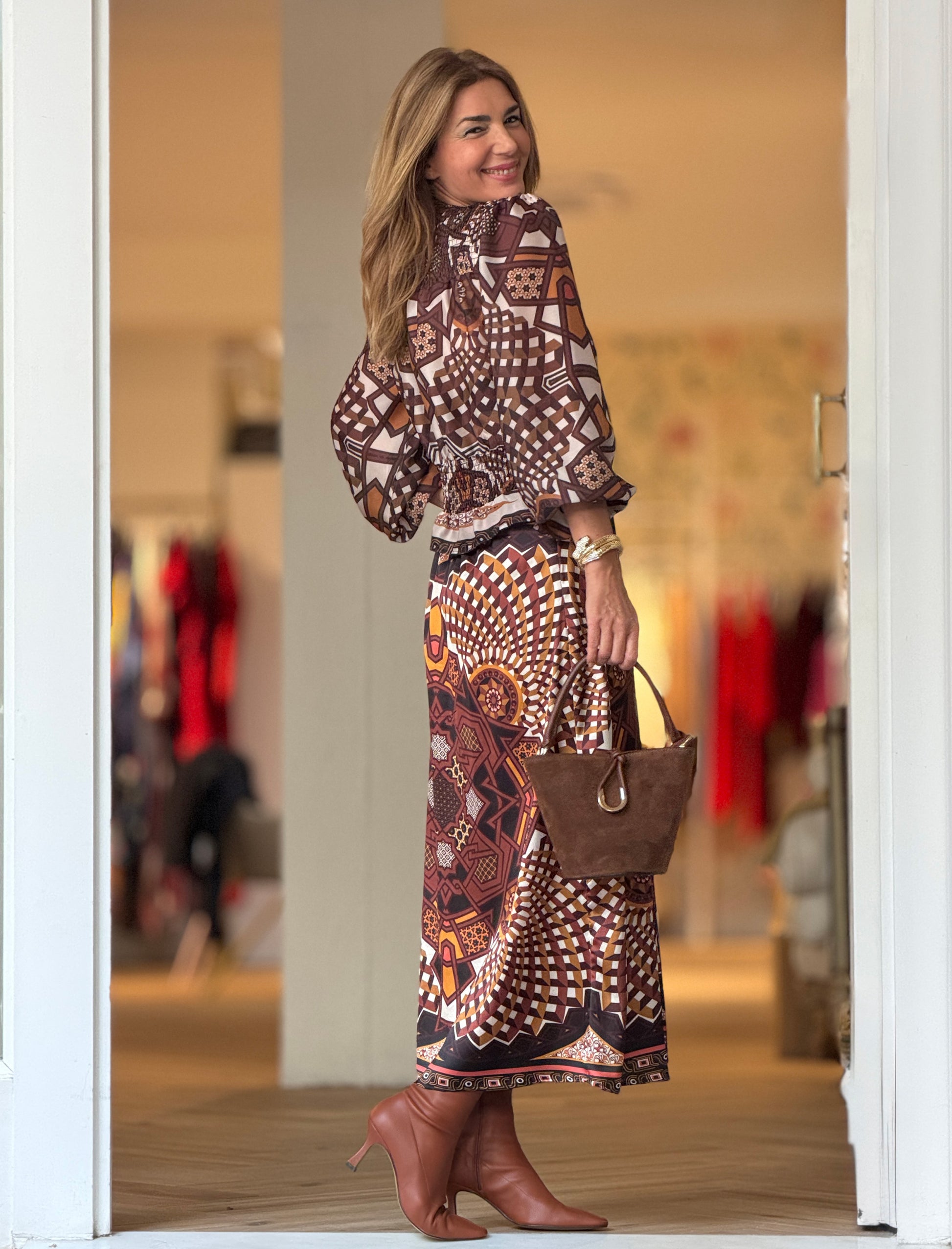 La Falda Maravillosa Mosaic combina un estampado geométrico tipo mosaico en tonos cálidos como marrones, ocres y teja, y está confeccionada en tejido fluido, que se adapta al cuerpo con una caída natural. Se puede combinar fácilmente tanto con blusas fluidas como con jerséis ajustados o camisas.