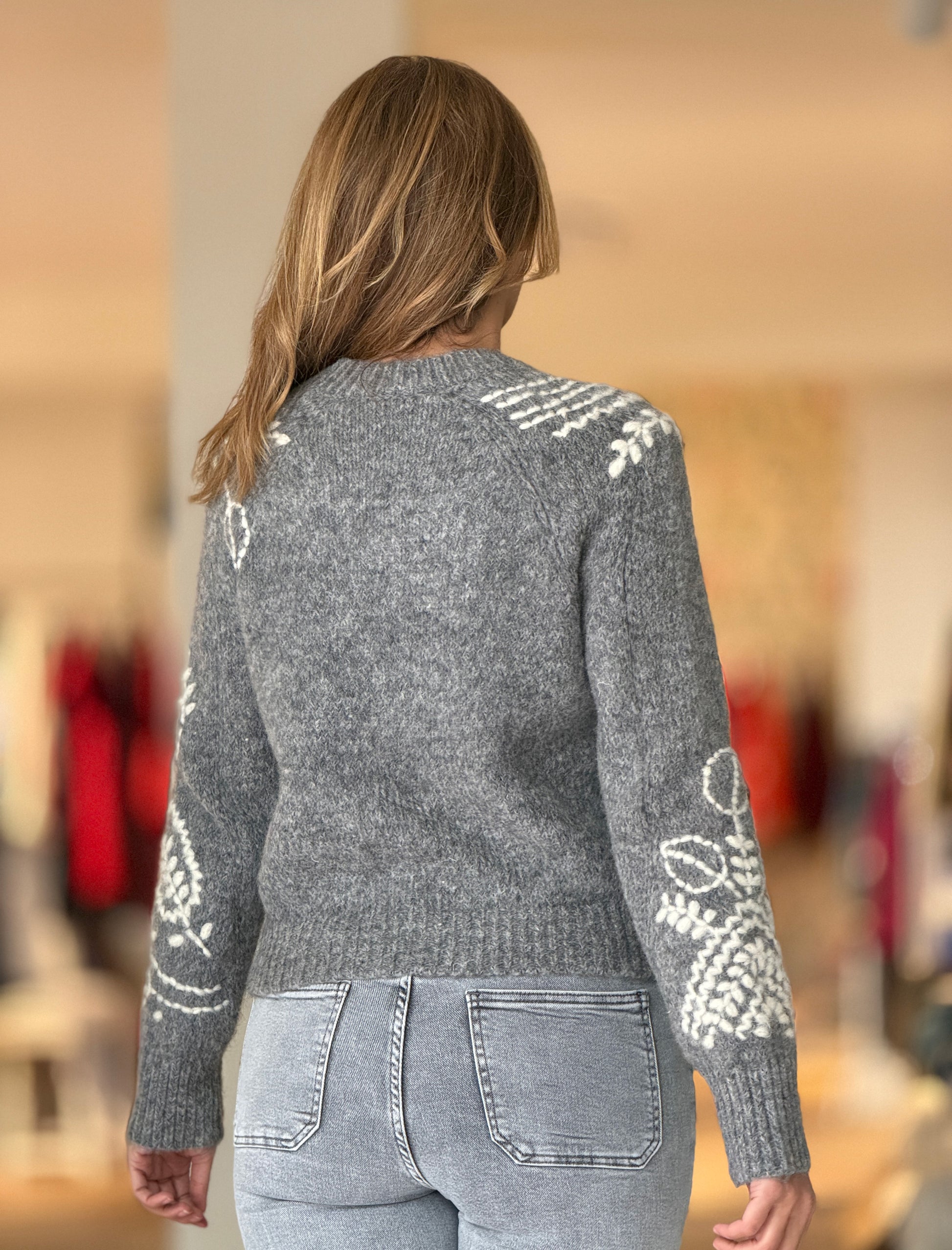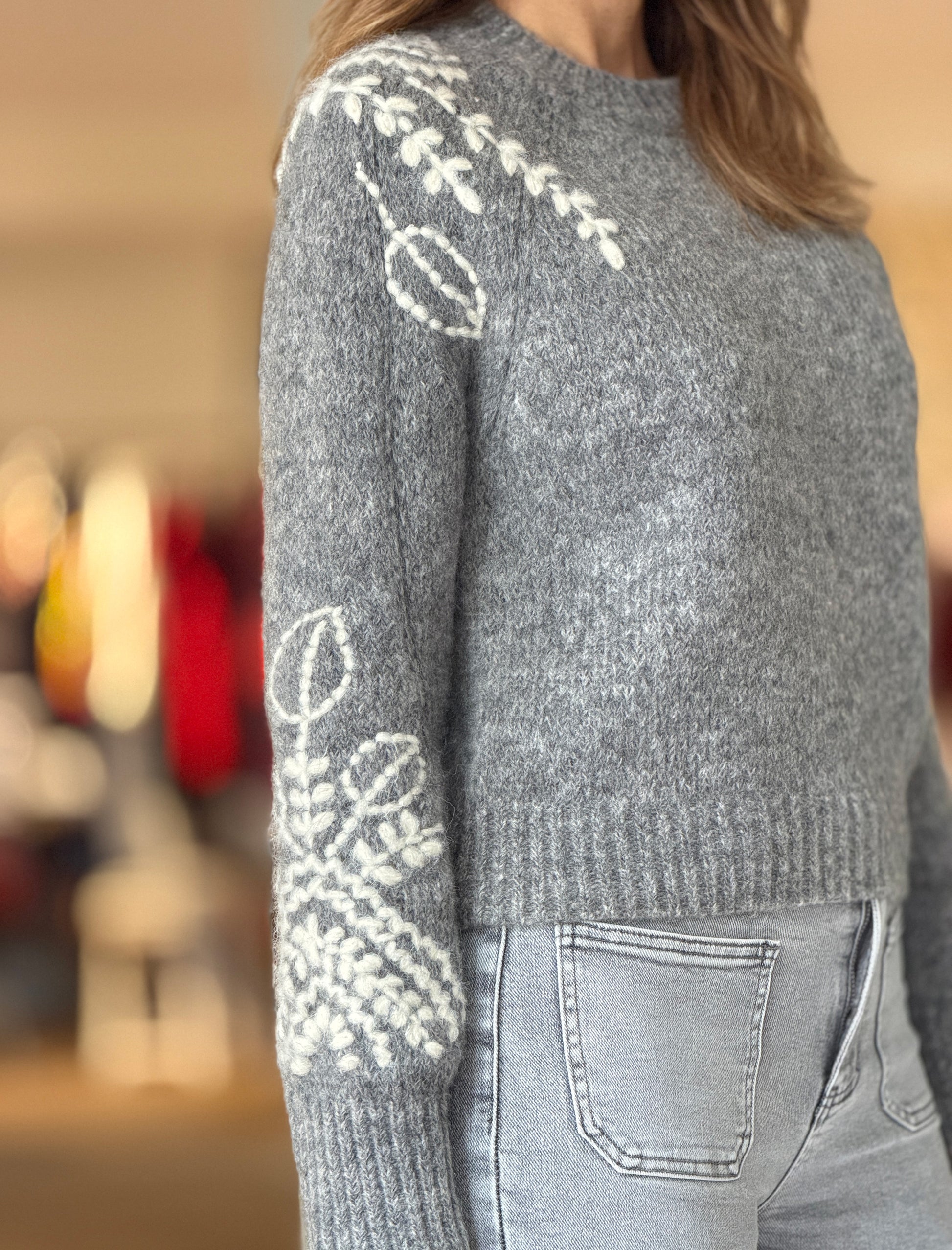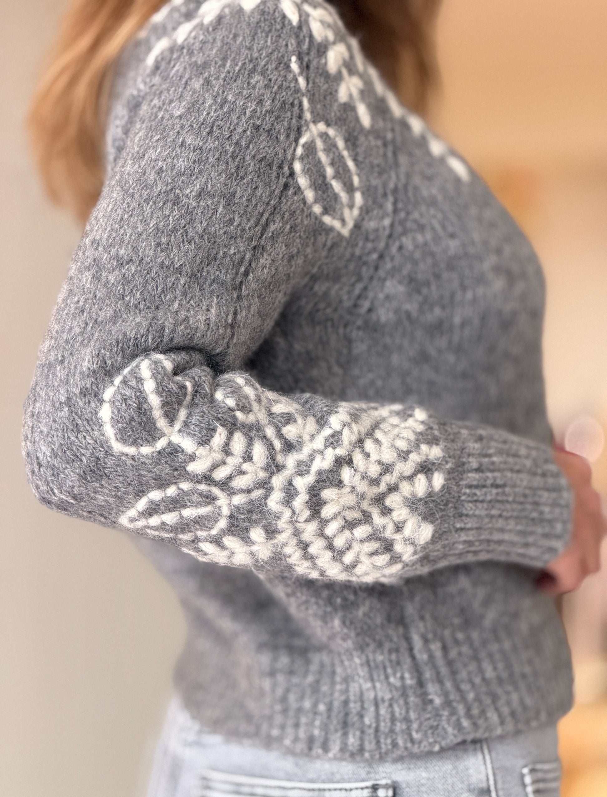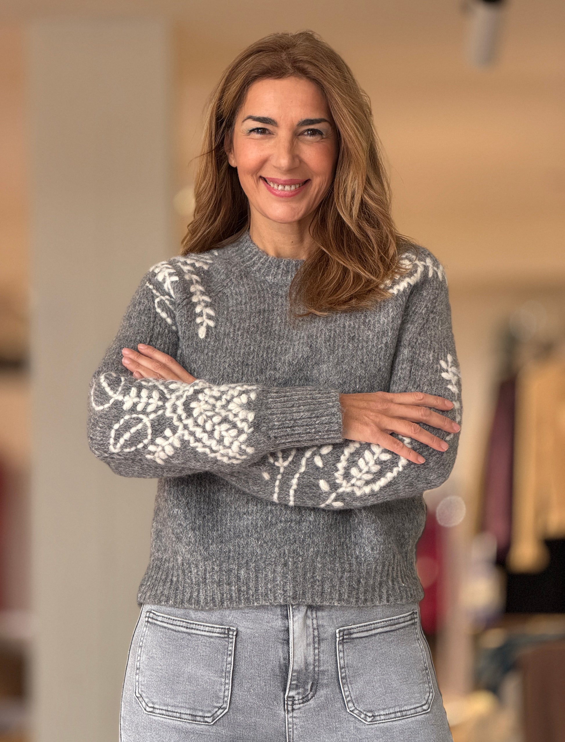 El jersey gris bordado suave con diseño en tono gris con bordados florales decorativos en hombros y mangas, que aporta luminosidad y lo convierten en una pieza ideal para quienes buscan un toque especial en sus looks diarios. Es un jersey que se adapta a estilismos casuales y también a conjuntos más formales.