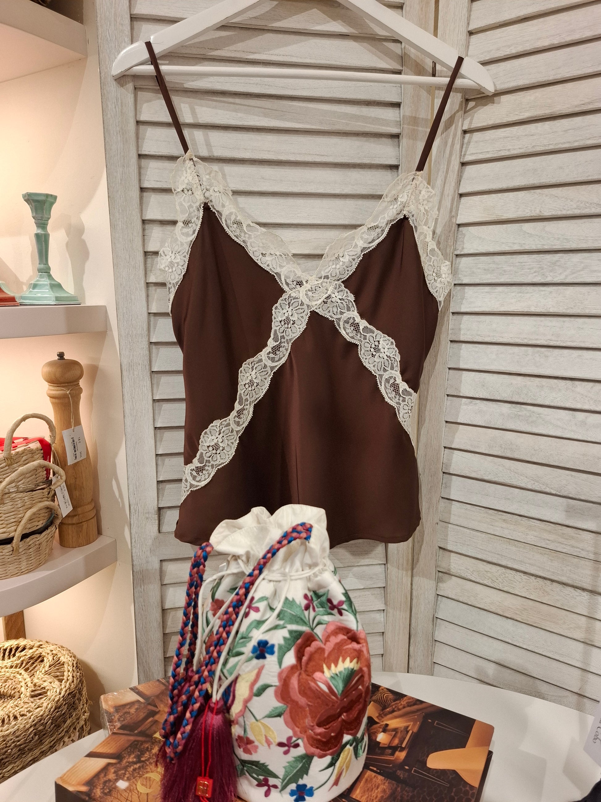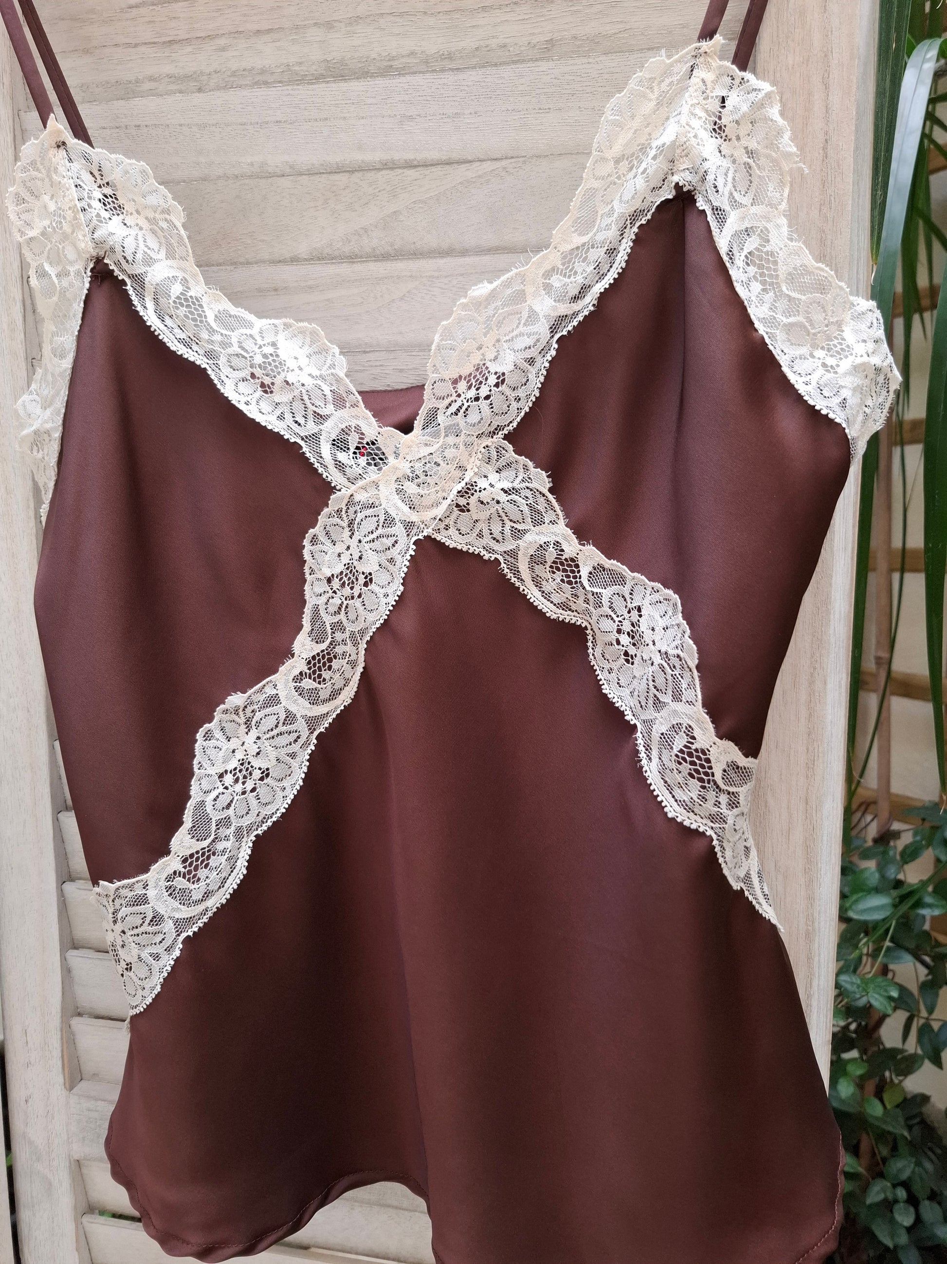 Lencero de encaje marrón es una prenda muy versátil, ideal para elevar cualquier look con un toque sofisticado. Su diseño combina el color marrón con encaje blanco en el escote, creando un contraste elegante y muy favorecedor. Los tirantes finos hacen que sea perfecto tanto para llevar solo en looks más especiales como para combinar bajo chaquetas o blazers.