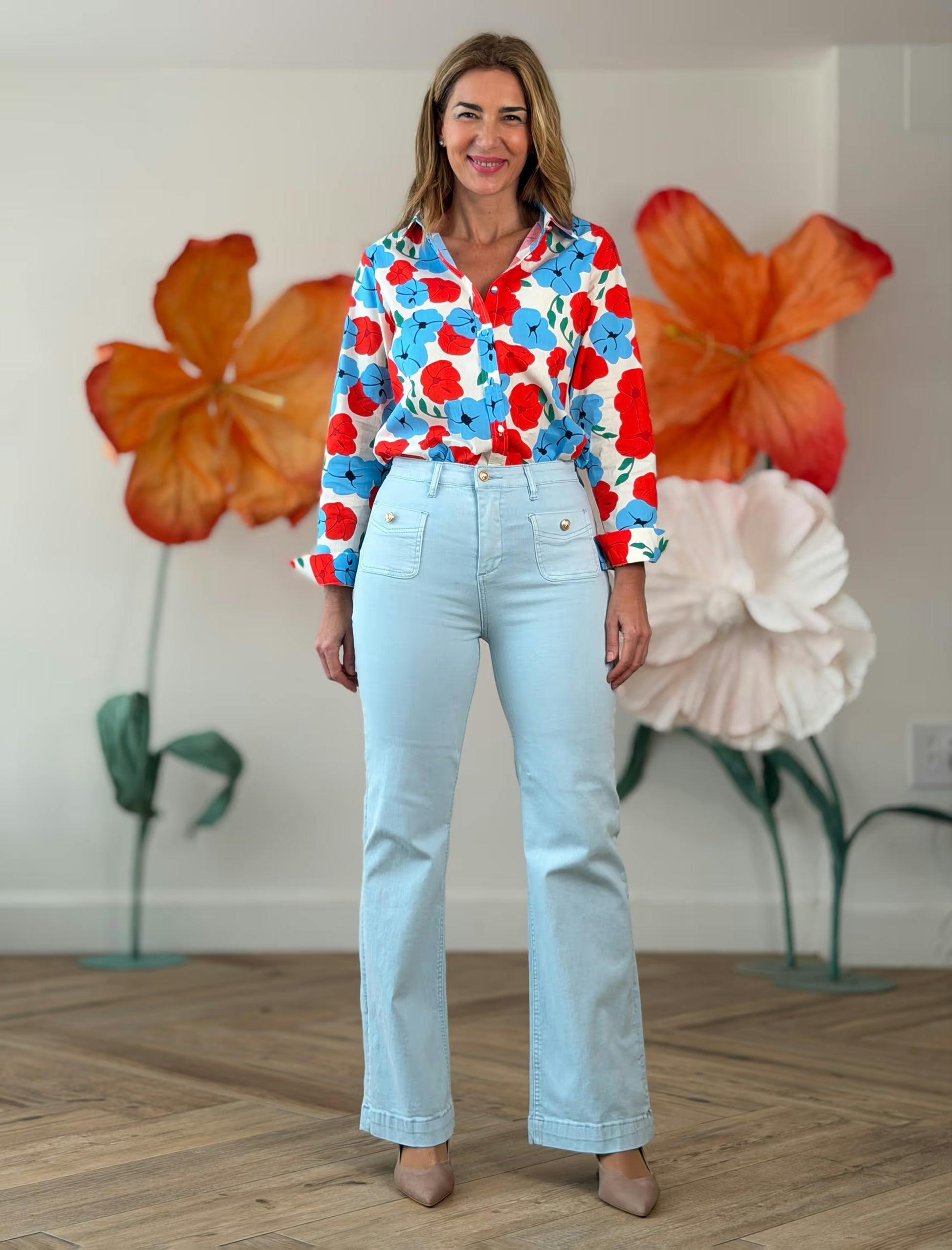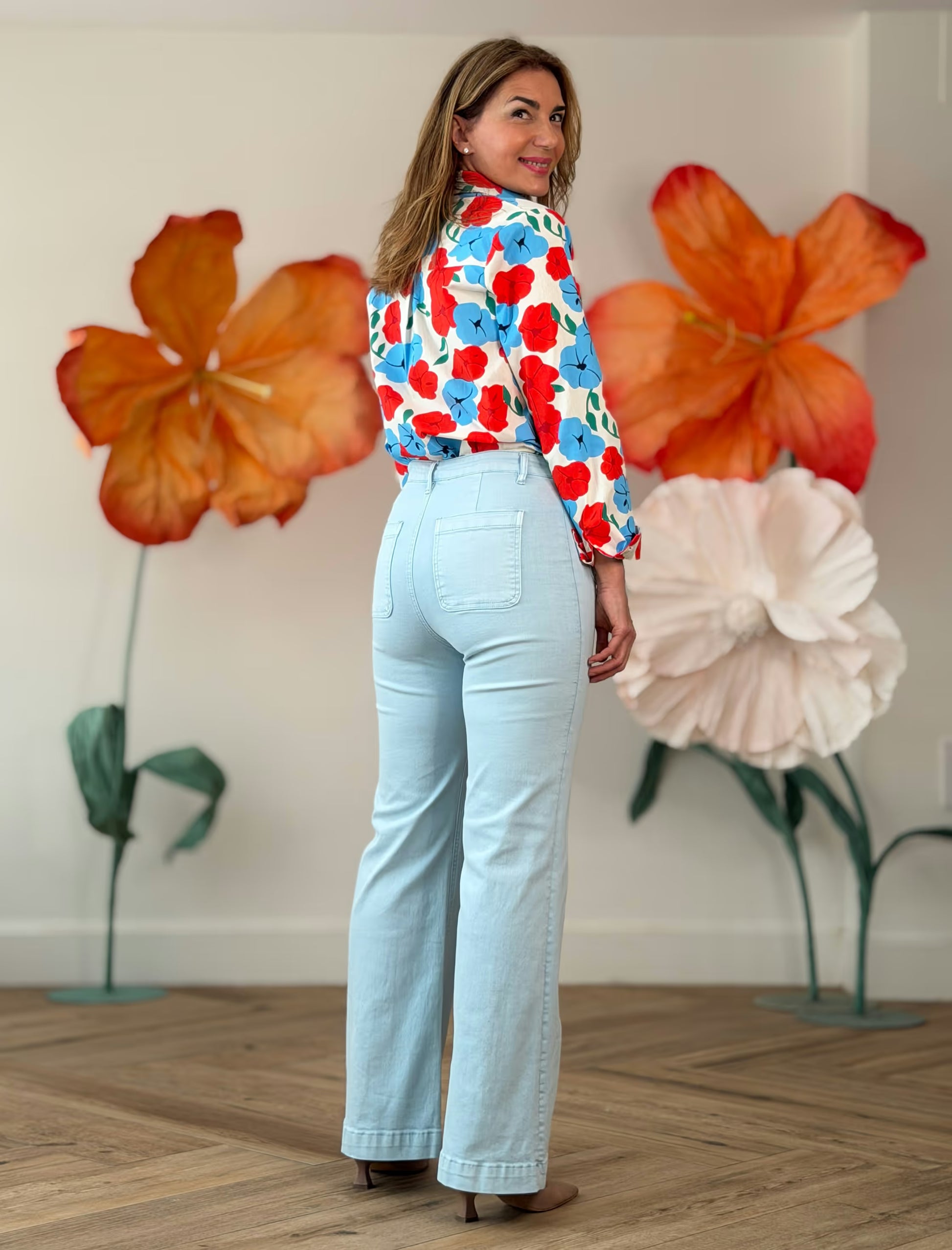 El pantalón celeste flare bolsillos es perfecto si buscas un pantalón que te siente bien de verdad y además te estilice. El tono celeste suaviza el look y aporta luz, mientras que el corte flare alarga visualmente la pierna y crea una silueta muy favorecedora.