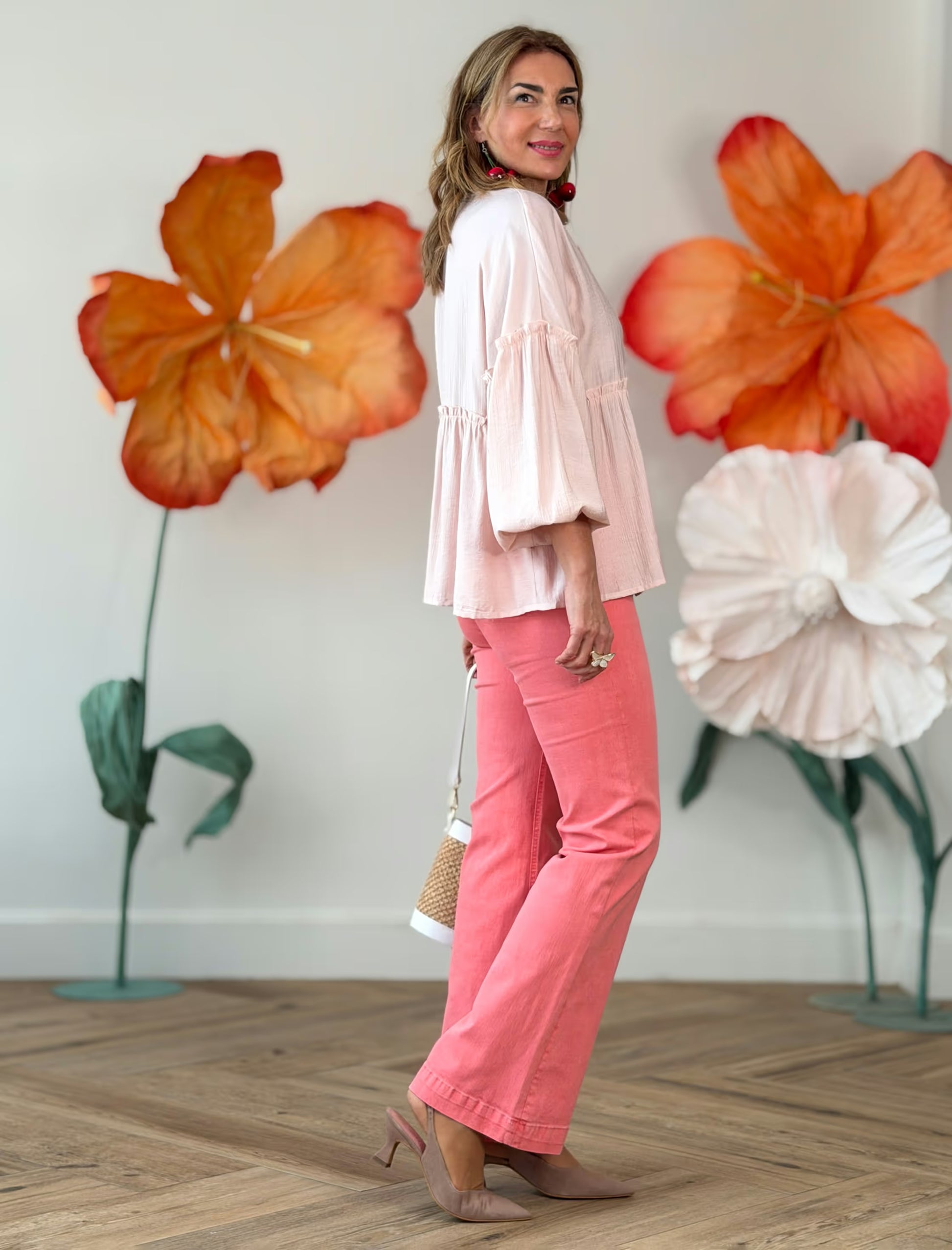 El pantalón coral flare bolsillos es perfecto si buscas un pantalón que te siente bien de verdad y además te estilice. El tono coral suaviza el look y aporta luz, mientras que el corte flare alarga visualmente la pierna y crea una silueta muy favorecedora.
