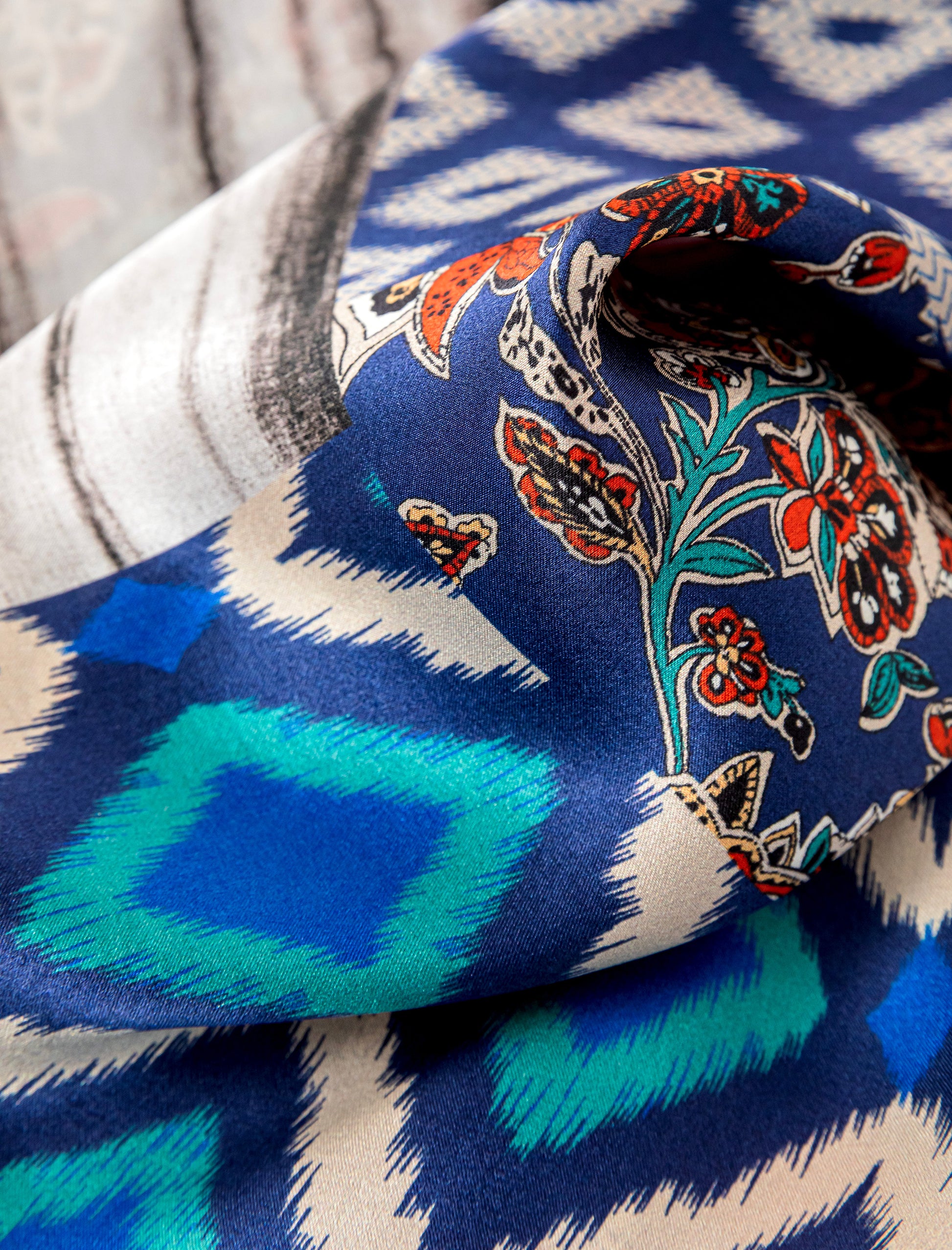 Nuestro pañuelo ikat de seda perfecto para llevar en el cuello, para el pelo o en un asa del bolso, con una seda y un estampado espectacular en tonos azules, rojos y blancos. Su diseño atemporal y sofisticado lo convierte en el complemento ideal para elevar cualquier look, ya sea casual o formal. El regalo perfecto.