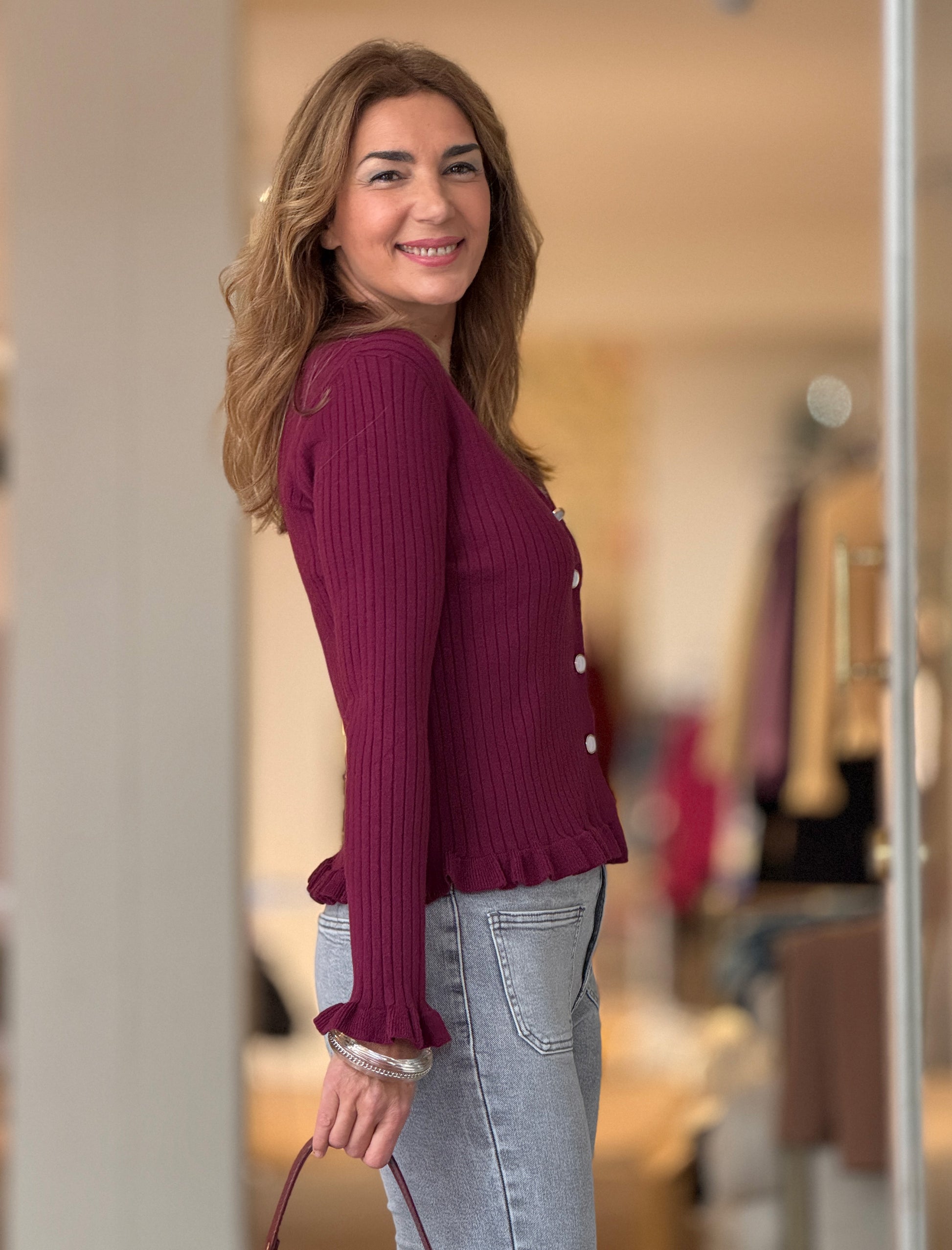 Rebeca burdeos botones chic de tejido de punto fino en color beig combina con pantalones, faldas o vestidos, creando looks equilibrados y femeninos. Los botones frontales y los volantes pequeños fruncidos añaden un detalle chic y sutil que eleva la prenda. El canalé estiliza y aporta un ajuste cómodo.