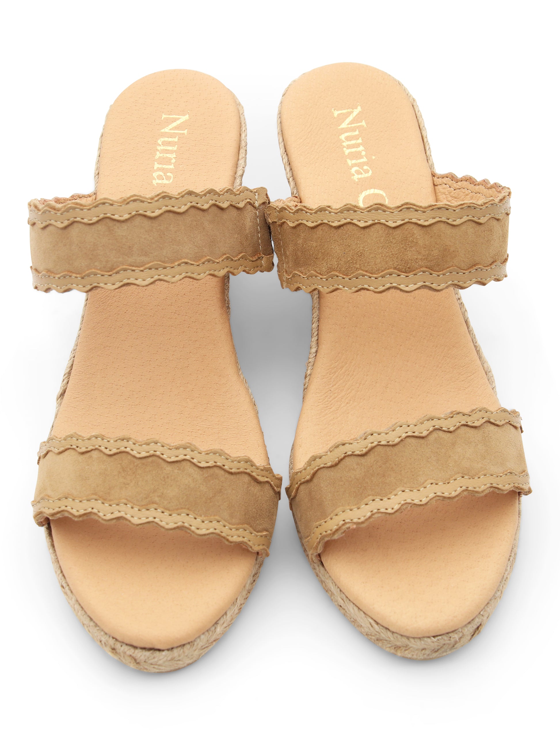 Alpargata de piel ante forrada en piel y con planta piel, fabricada artesanalmente en España. Tiene una cuña de esparto de unos cm. y plataforma delantera de cm. por lo que la inclinación del pie es de sólo cm , teniendo una gran sensación de comodidad.