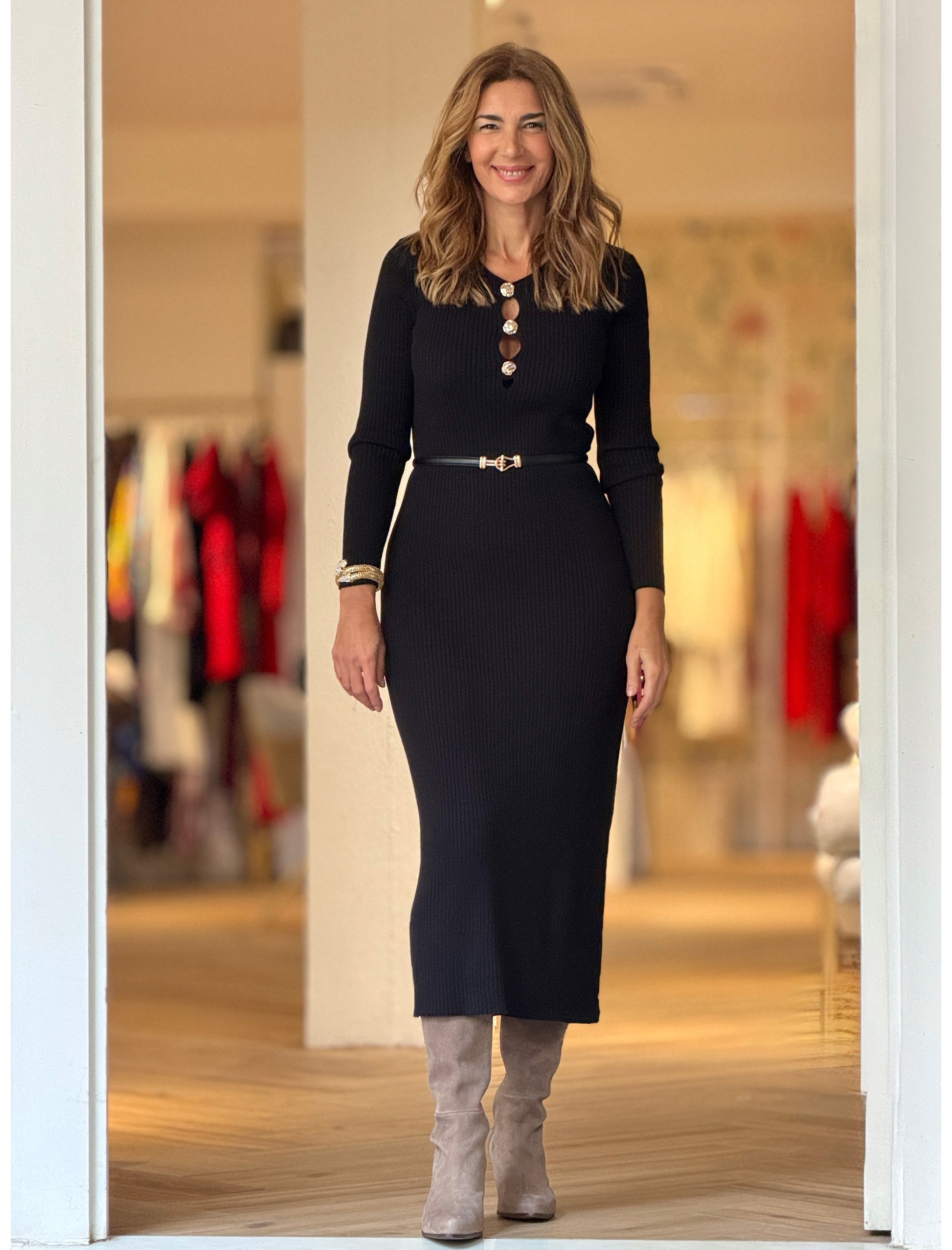 El vestido de punto negro presenta un diseño recto de tejido de punto suave que se adapta al cuerpo sin marcar, favoreciendo la silueta. Destaca su cuello redondo que se une a los tres apliques en oro que decoran el escote. Se trata de un vestido largo que funciona igual de bien para el día a día que para planes más especiales en los que buscas ir cómoda.