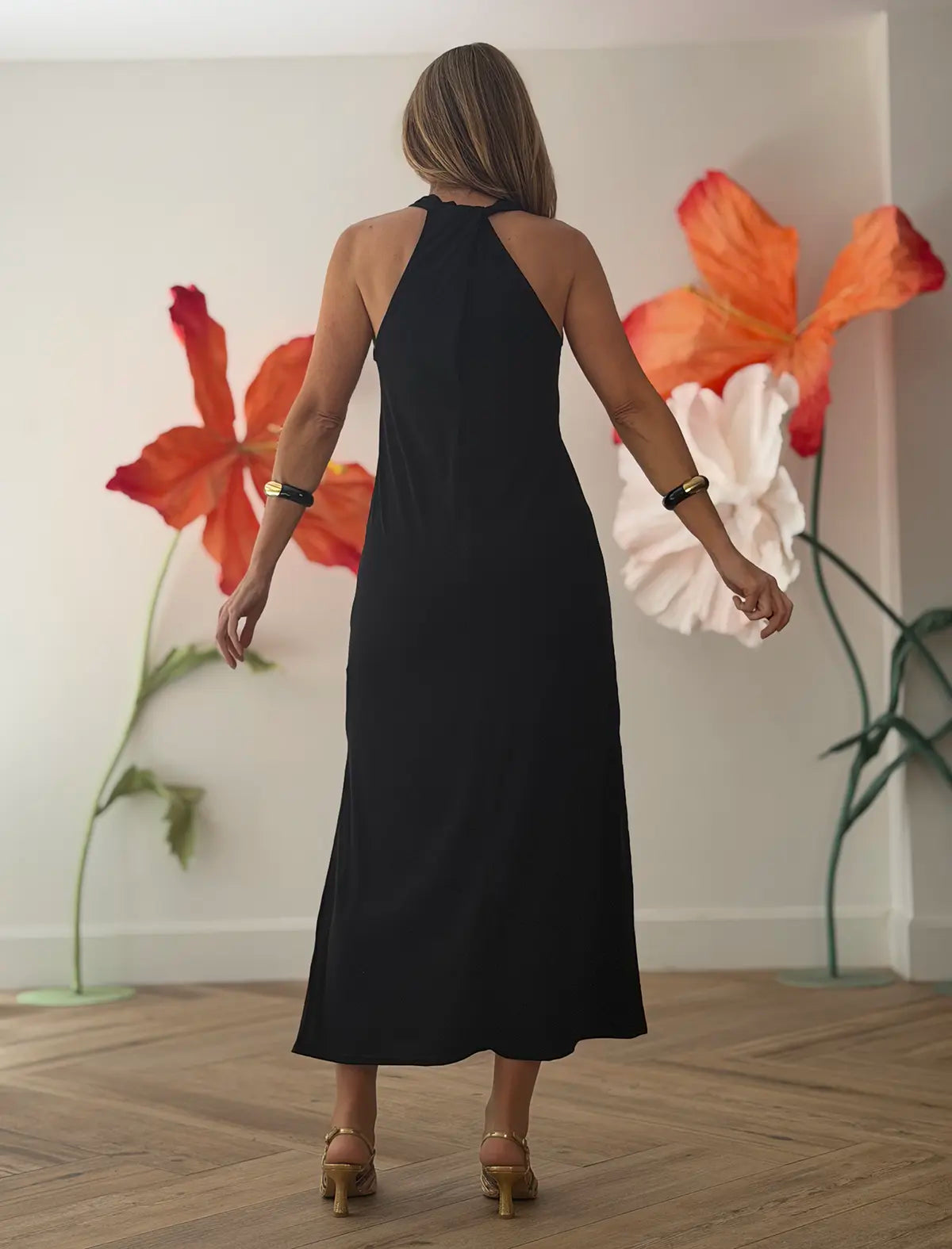 Me encanta porque es minimalista pero con fuerza. Puedes llevarlo con sandalias y hacerlo relajado, o añadir cinturón y accesorios dorados y convertirlo en un look mucho más sofisticado. Es el típico vestido que te salva un evento, una cena o incluso un viaje.