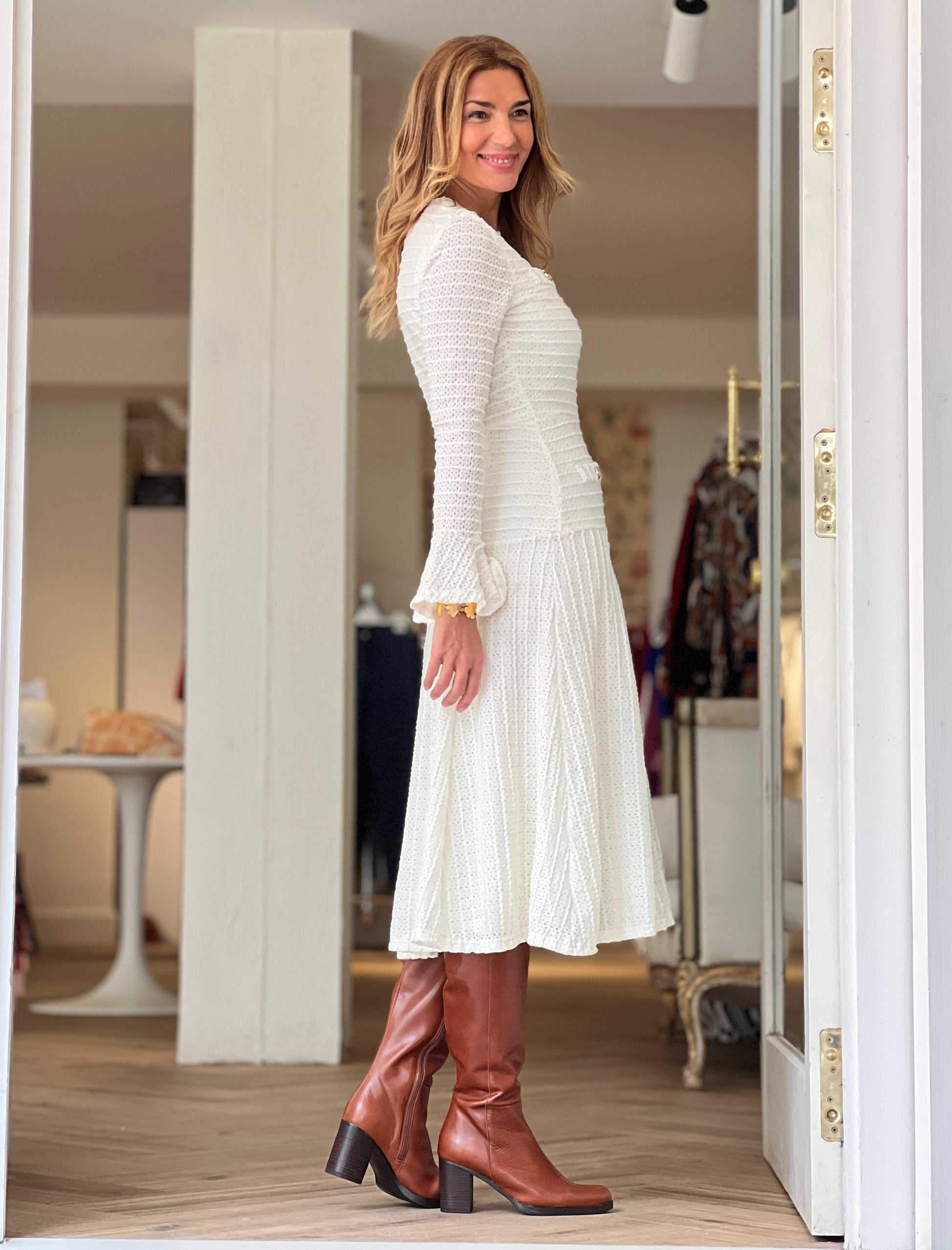 Vestido muy chic coco beige es pura elegancia atemporal. Su corte estiliza la figura, mientras que los botones dorados frontales aportan un aire sofisticado y chic, perfecto para cualquier ocasión. Un diseño inspirado en la moda clásica francesa que no pasa de moda, ideal para llevar con tacones o con botas.