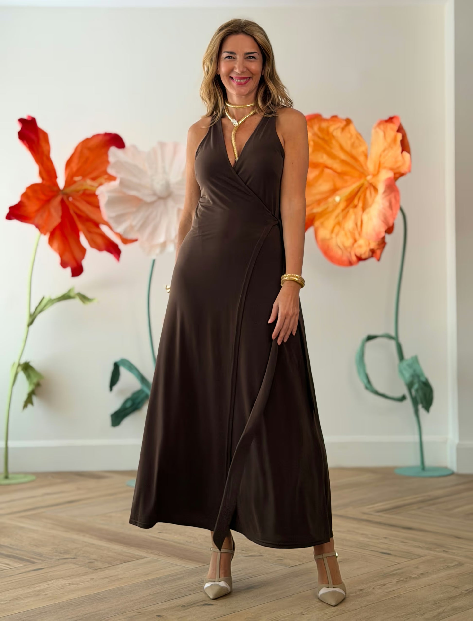 El Vestido muy favorecedor marrón chocolate tiene ese efecto especial de las prendas que sientan increíble nada más ponértelas. Su diseño cruzado realza el escote, marca la silueta de una forma muy bonita y estiliza muchísimo. El color marrón favorece y estiliza, y con este corte de vestido más.