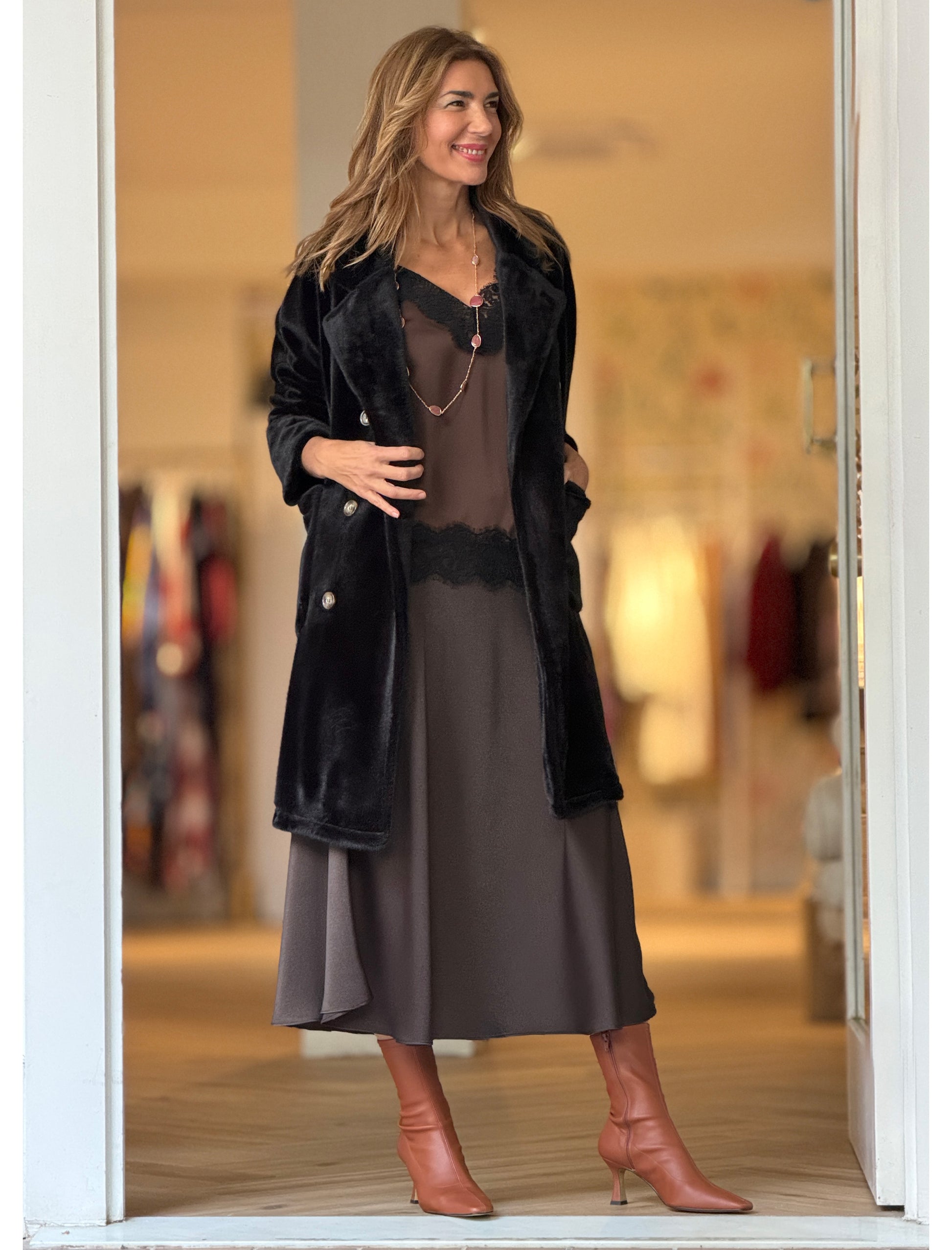 El Abrigo de Pelo Suave presenta un tacto ultrasuave que ofrece una sensación envolvente y muy agradable y combina con absolutamente todo. El diseño recto y ligero lo convierte en un abrigo cómodo para el día a día. Además, cuenta con bolsillos laterales y un acabado de efecto peluche que lo hace irresistible.