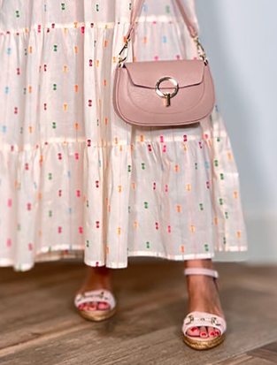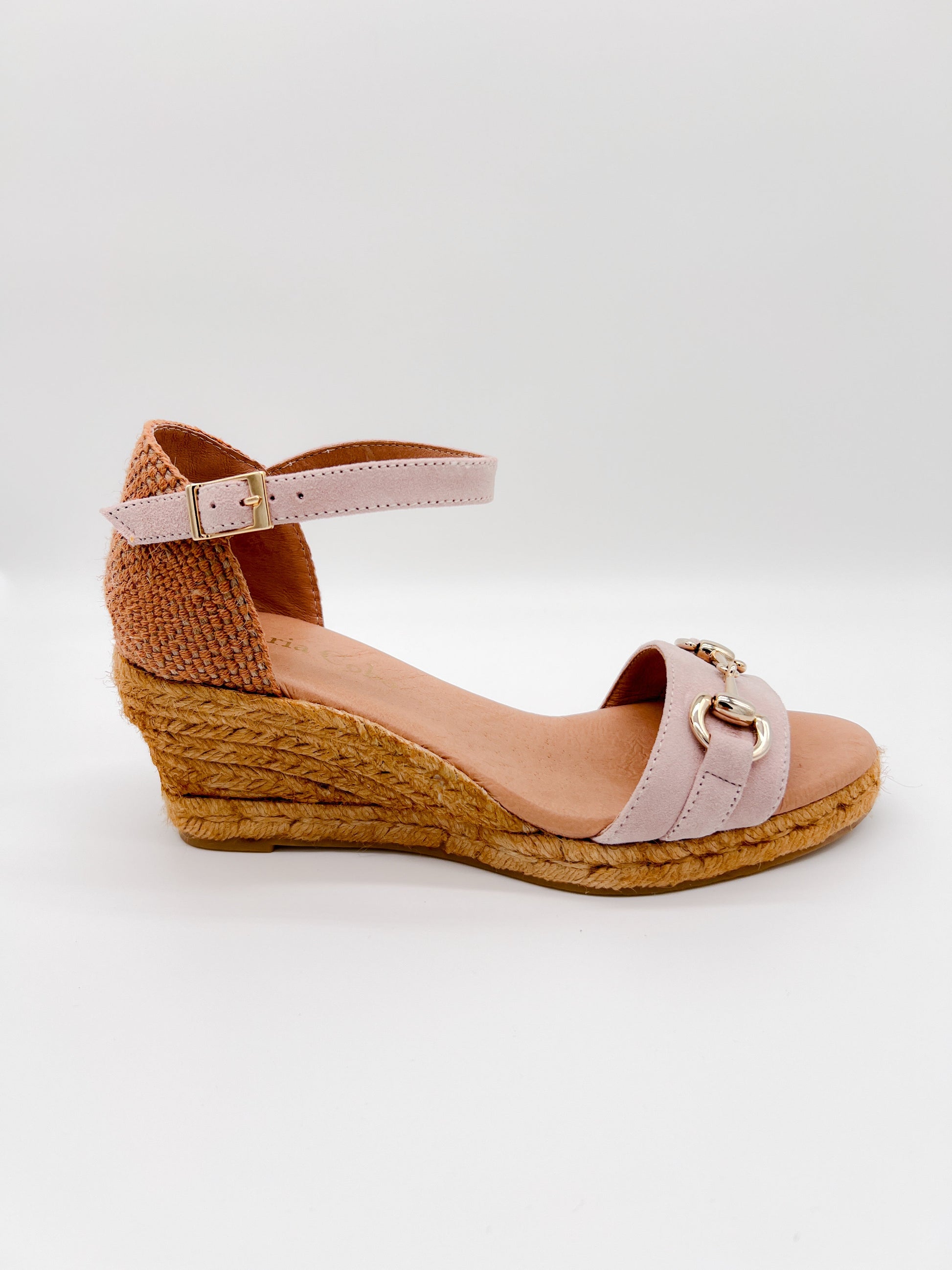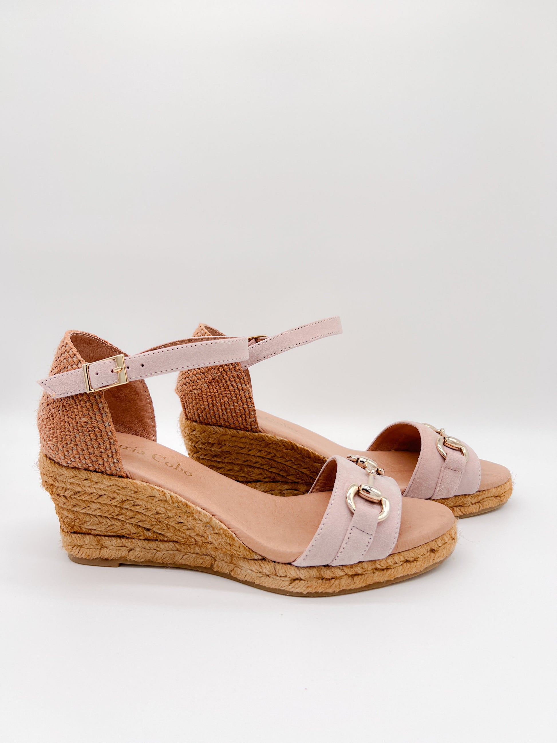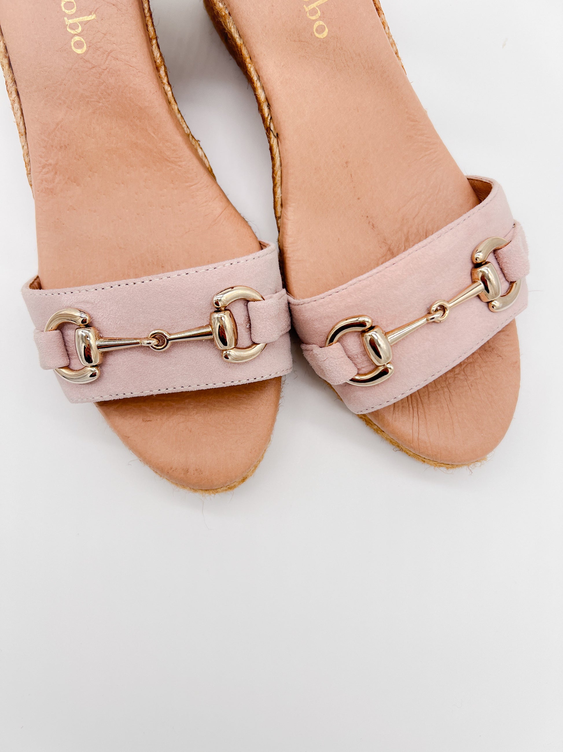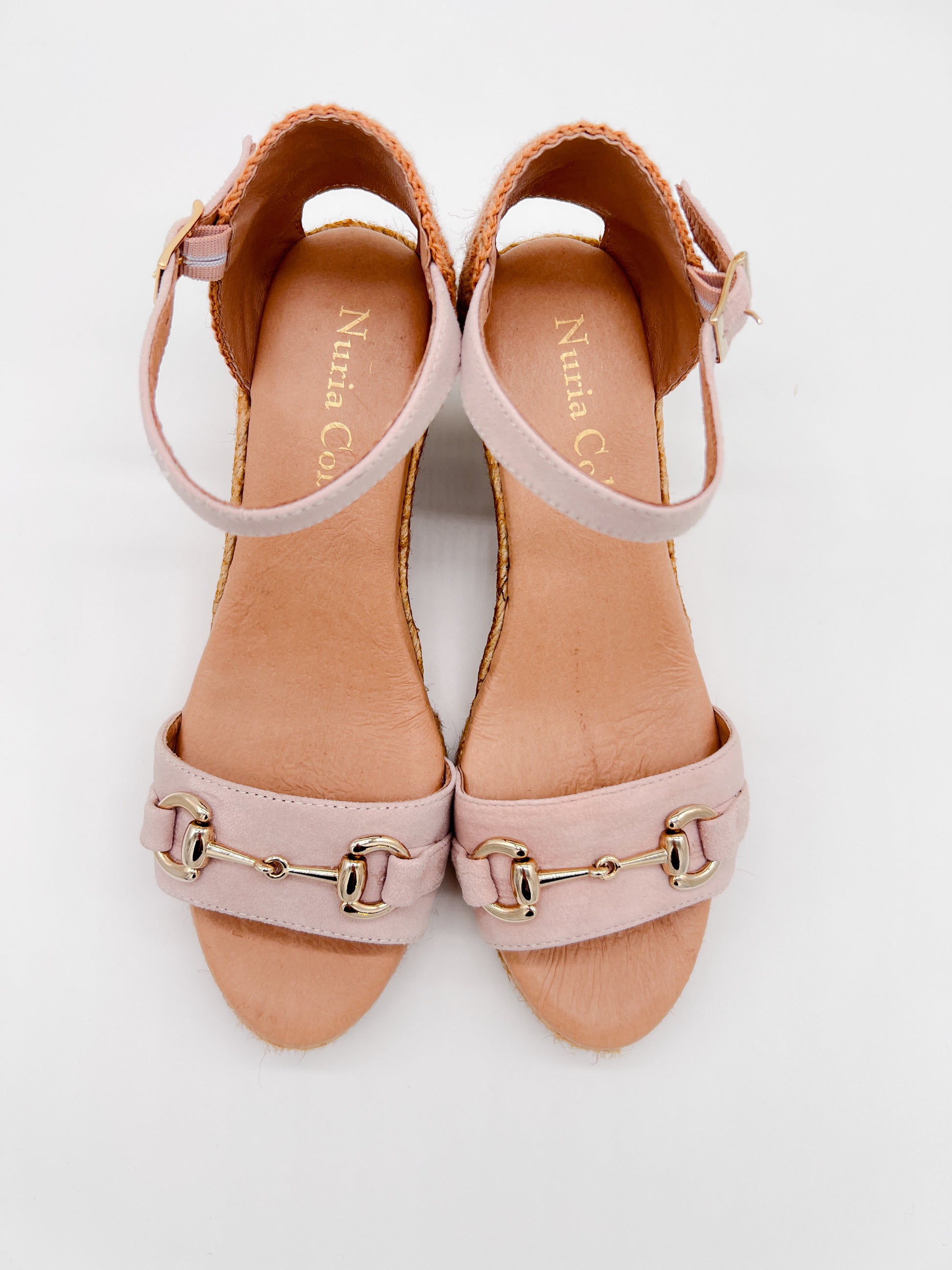 Su color rosa nude o maquillaje es un básico perfecto para combinar con todo. Y como guinda del pastel, su adorno dorado con forma de estribos. ¡Puro estilo!