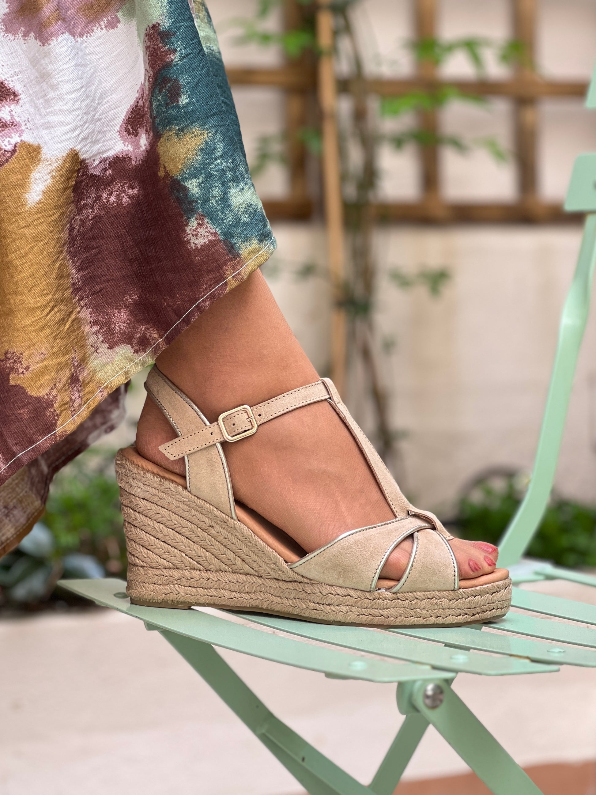 La alpargata de cuña Mallorca en color visón es la mezcla perfecta entre altura, confort y estilo. Su diseño tipo sandalia sujeta el pie con seguridad, mientras que la cuña de esparto estiliza sin renunciar a la comodidad.
