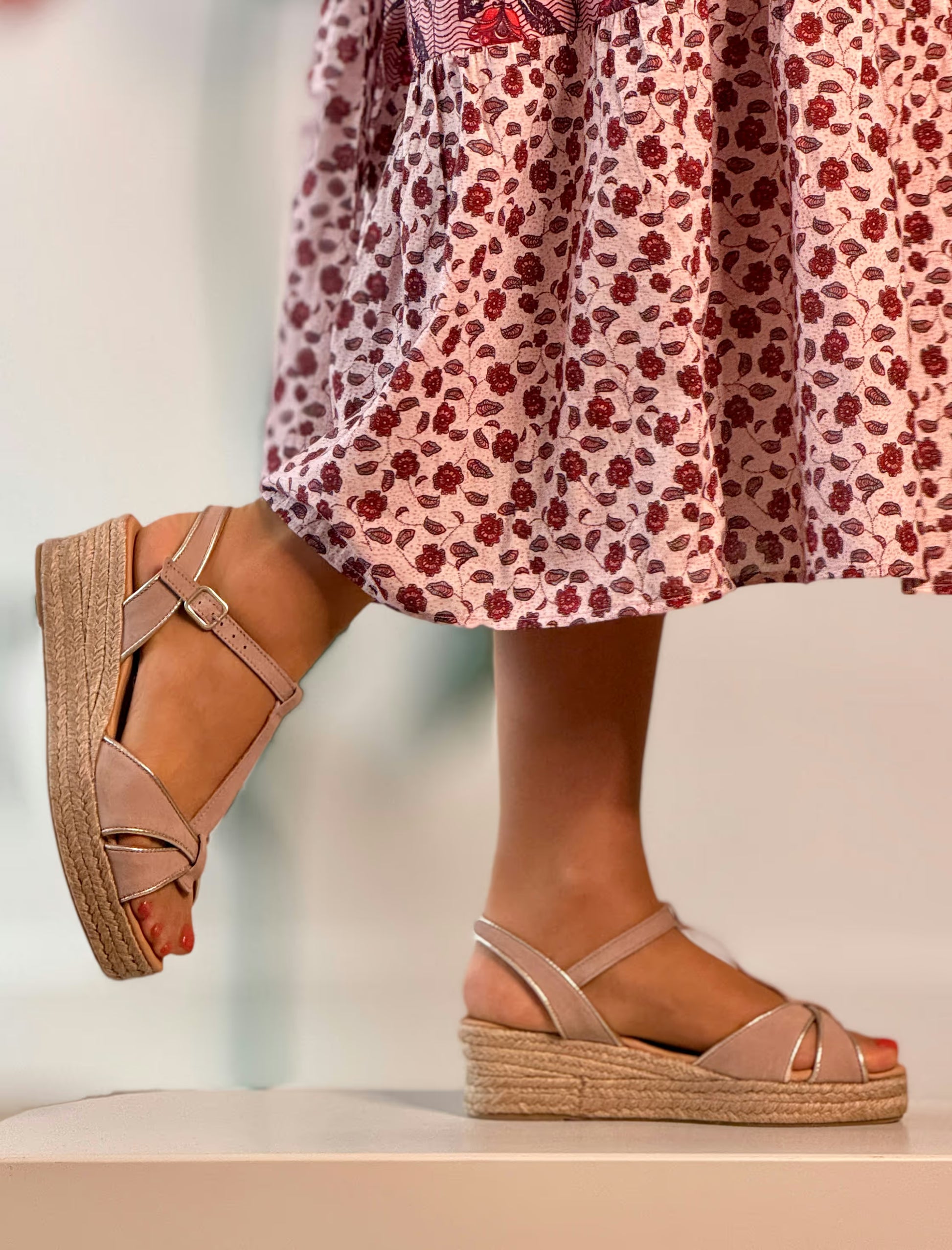 La Alpargata de Cuña Sandalia Palma nude es de esas sandalias que elevan el look, estilizan y combinan prácticamente con todo. El tono nude favorece muchísimo porque alarga visualmente la pierna, y la cuña de esparto le da ese aire natural y femenino que funciona igual de bien con vestidos, pantalones o conjuntos más especiales.