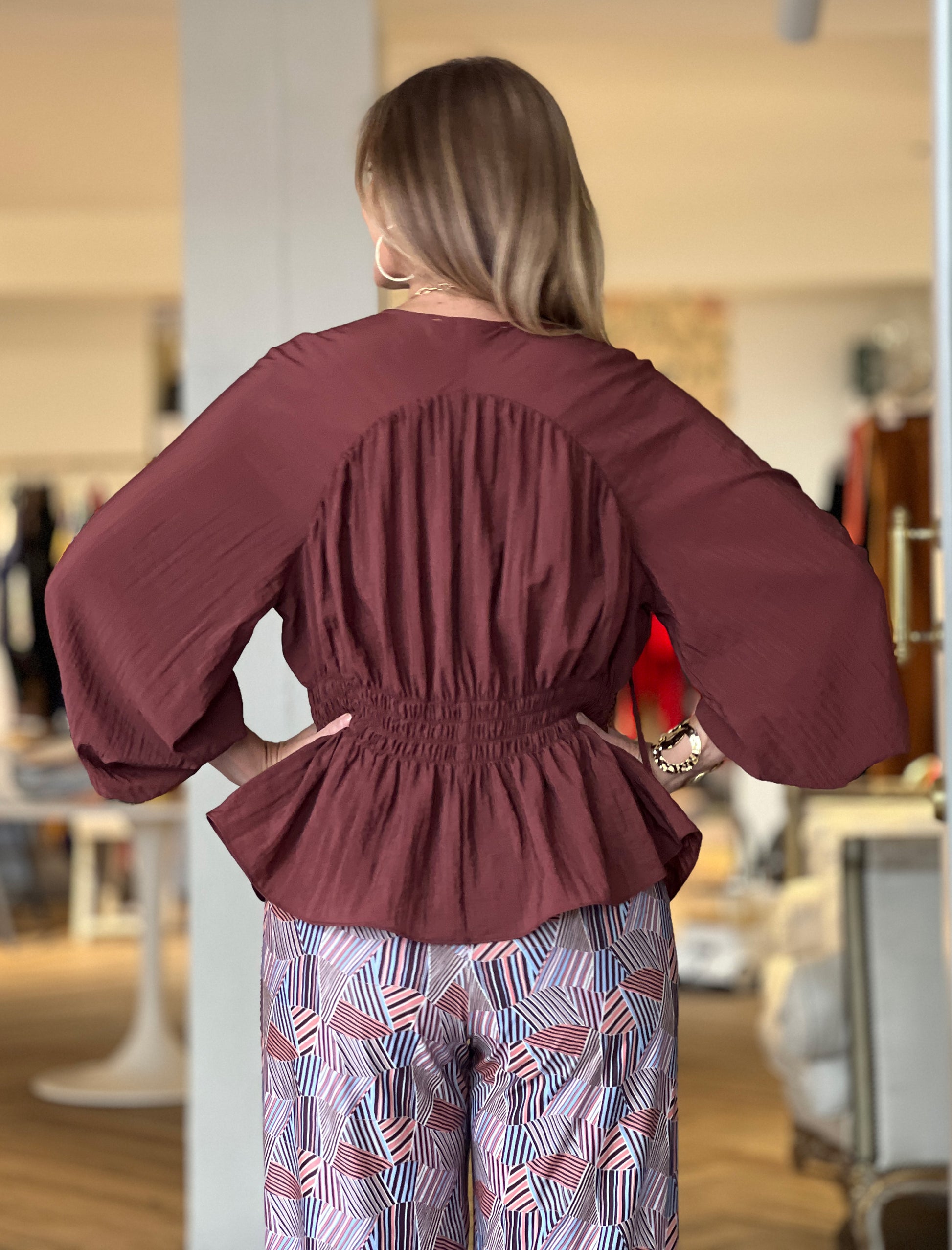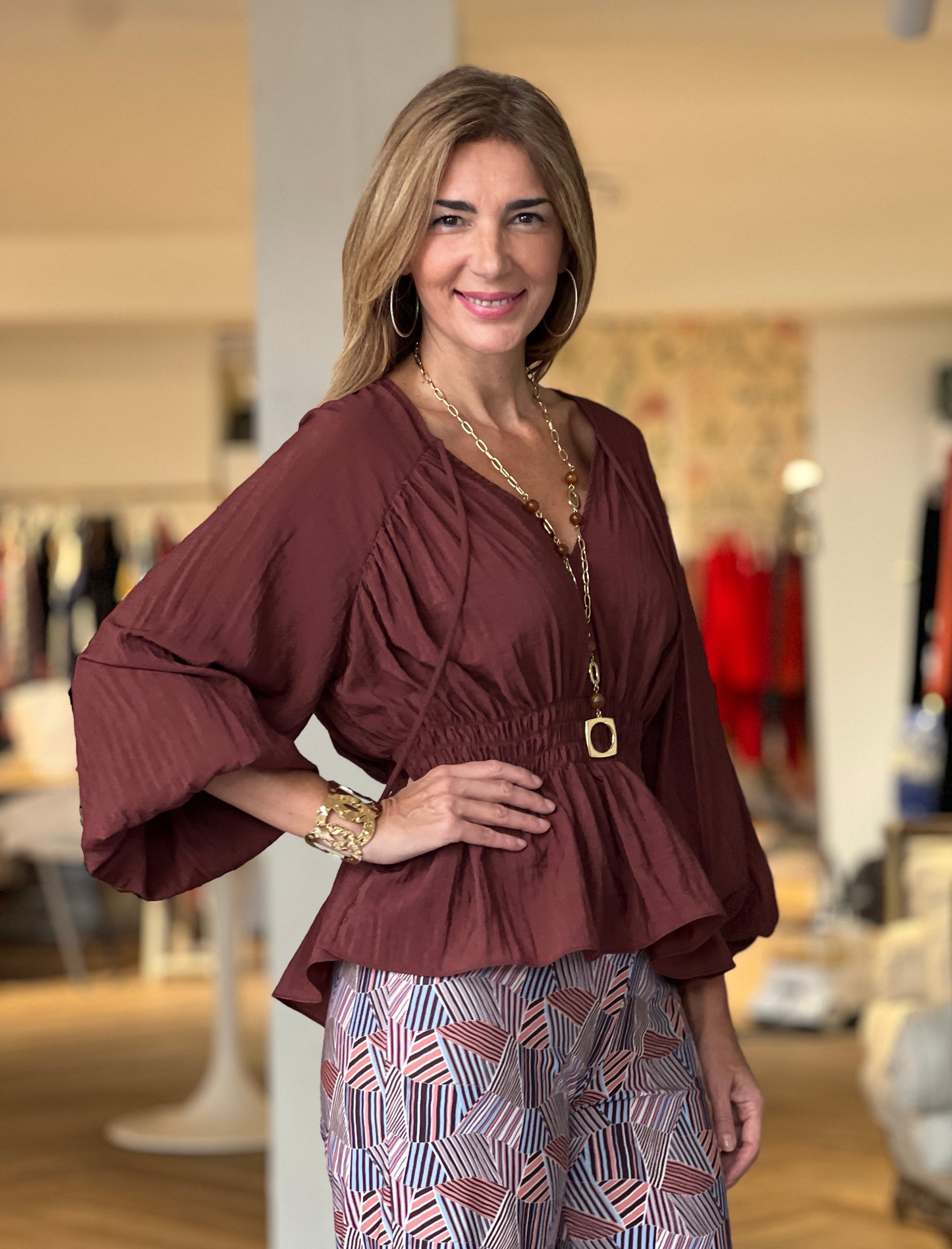 Blusa Burdeos Ideal confeccionada en un tejido fluido que presenta un escote en pico y mangas abullonadas con puño elástico, con un fruncido elástico en la cintura, que estiliza la figura. Es ideal tanto para looks diarios como para looks de noche, combinados con pantalones en colores lisos o estampados.