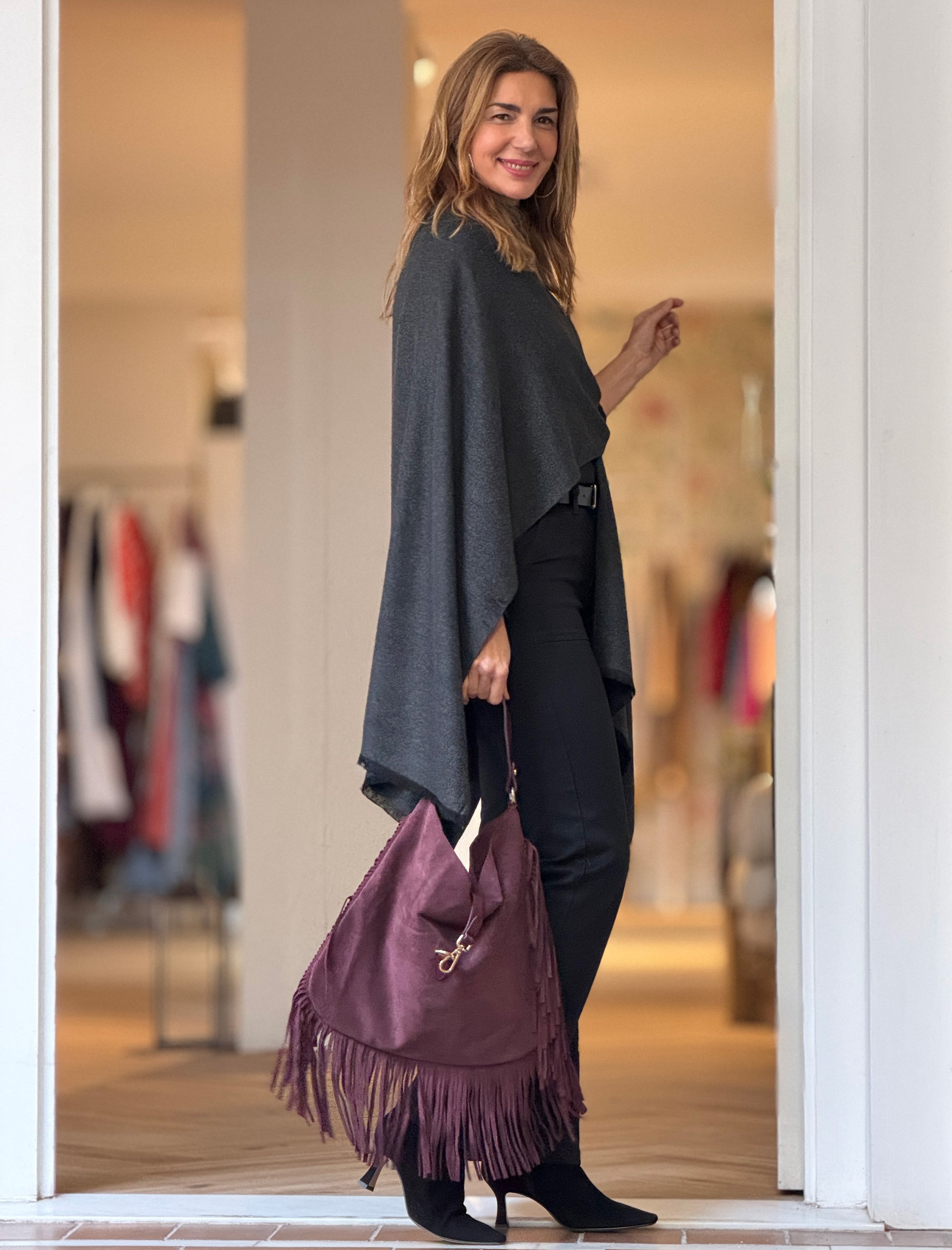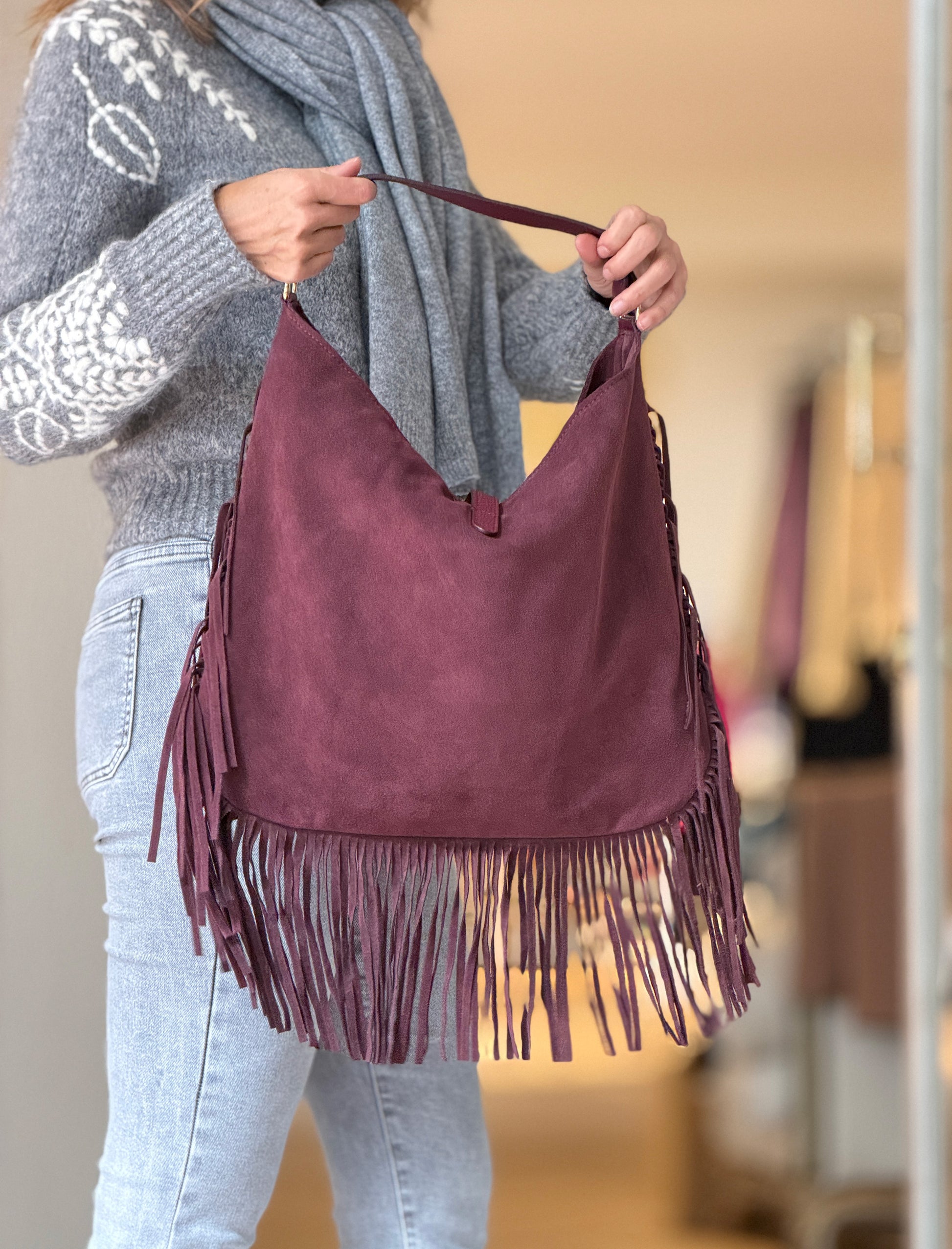 Bolso de flecos boho confeccionado en material de piel de tacto suave, presenta un diseño de inspiración bohemia con flecos decorativos en la parte inferior y detalles metálicos en el cierre. Cuenta con correa para el hombro y un formato amplio que lo convierte en el complemento perfecto para el día a día o para looks casual chic.