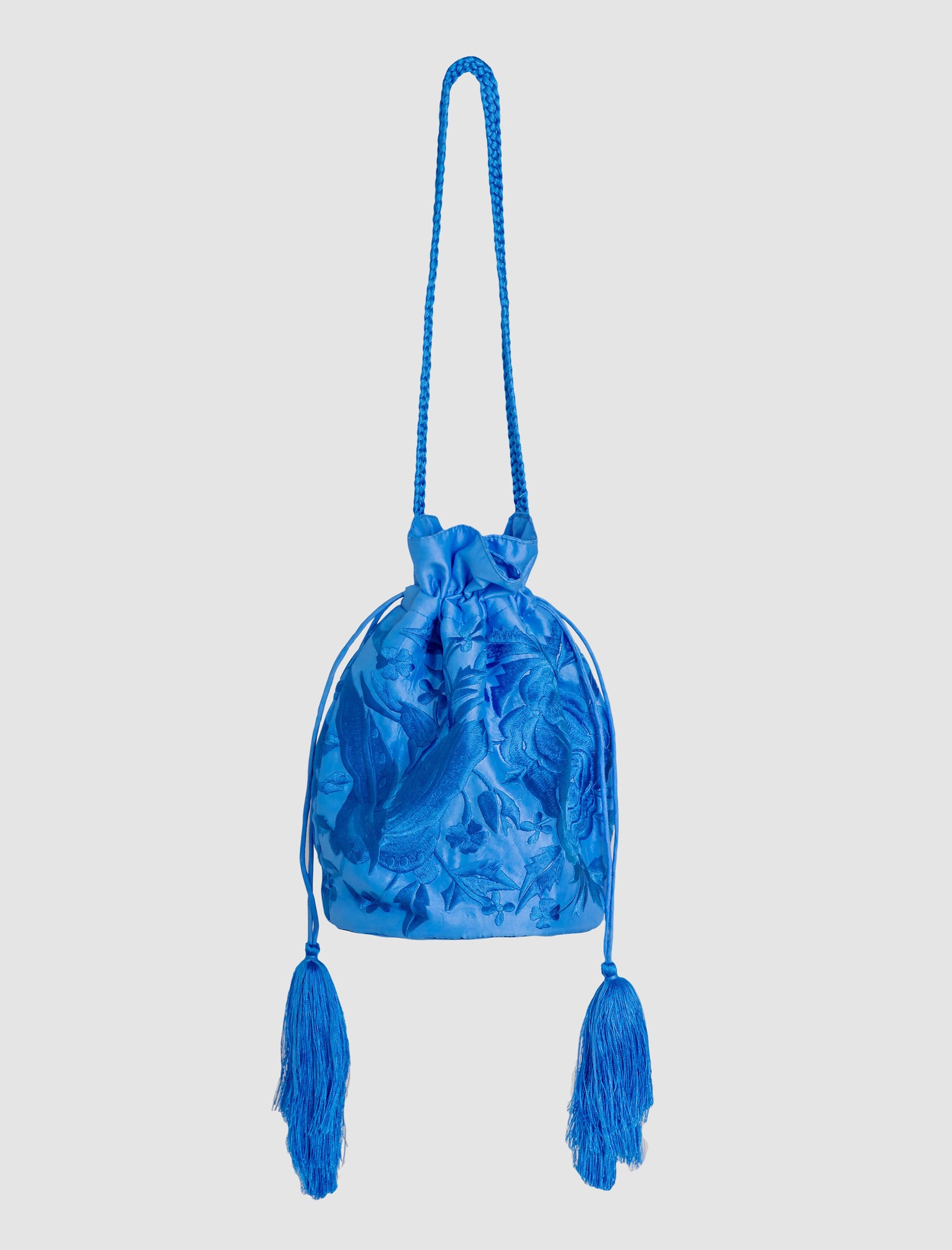 Bolso de seda bordado con diseños florales que se cierra en dos asas con acabado en pompones.