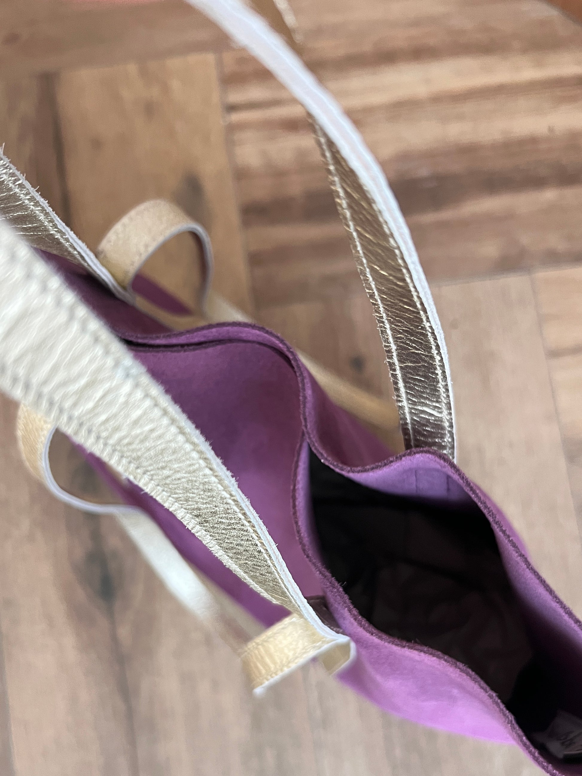 Bolso de piel tipo shopping en serraje con asas en piel oro, no lleva forro , ni broche de cierre, tiene dos tamaños de asas, para llevarlo de mano o colgado.