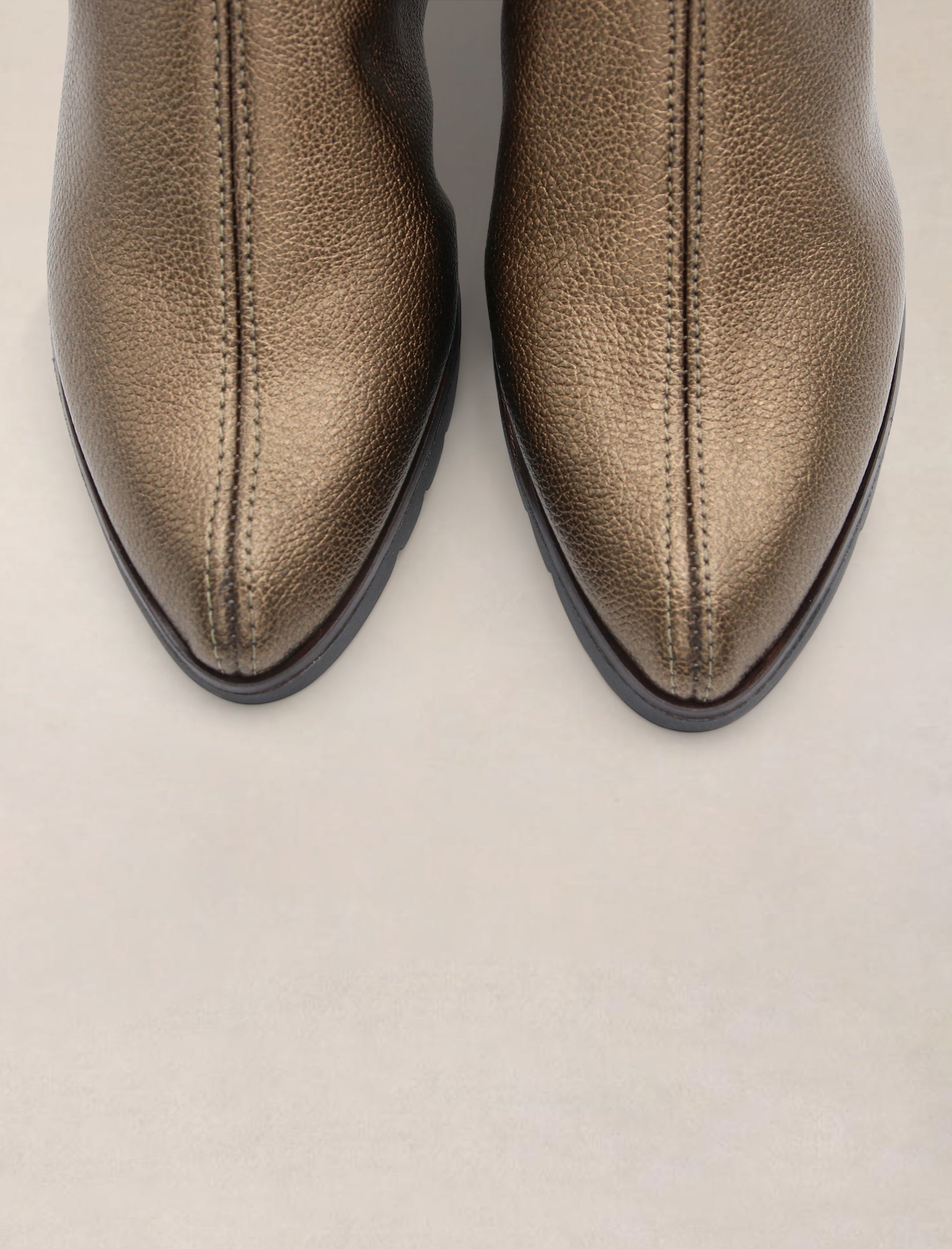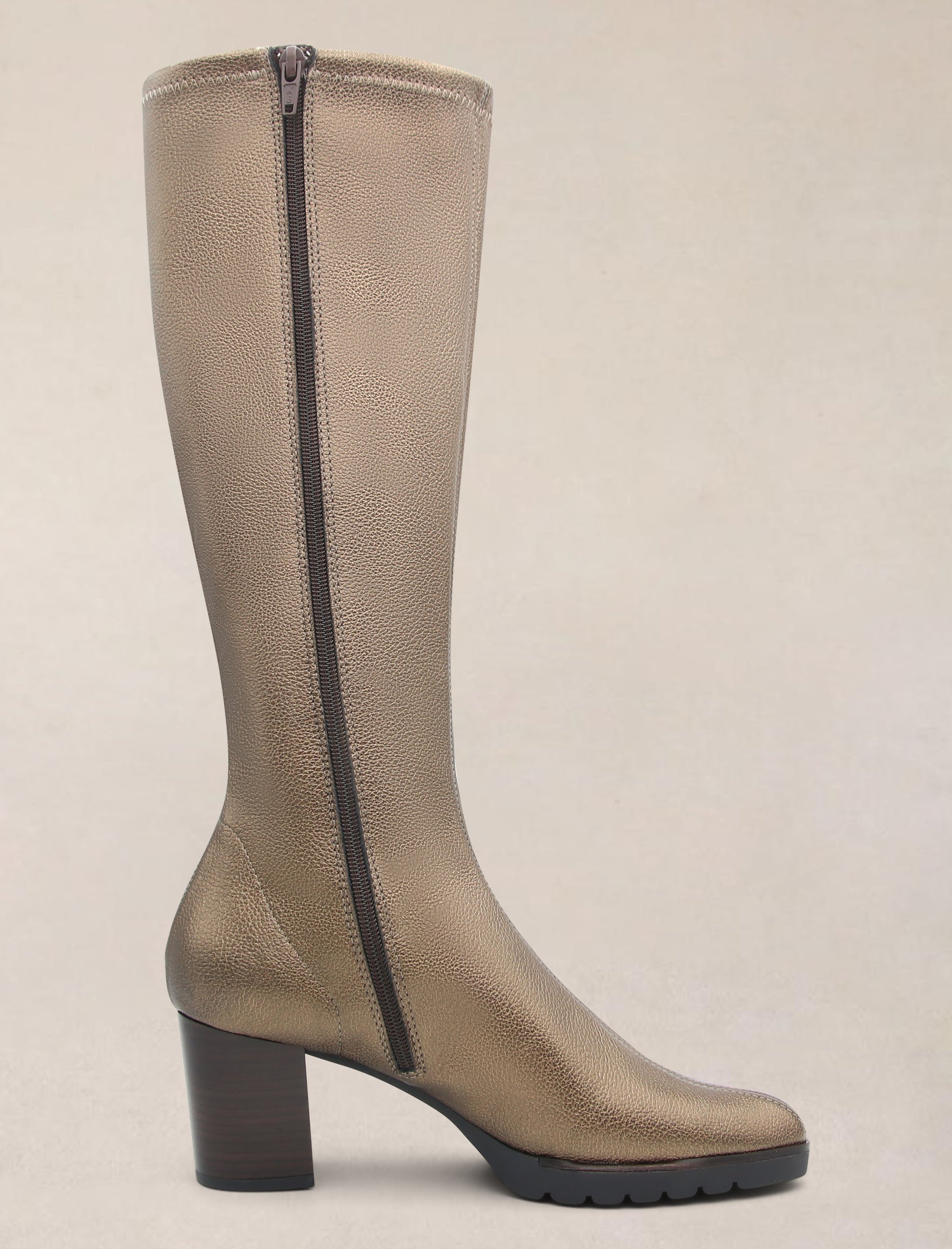 Bota de licra dorada tipo napa con cremallera interior, el piso es de goma y la altura del tacón es de 6,5 cm , el ancho de tacón de 4 cm.