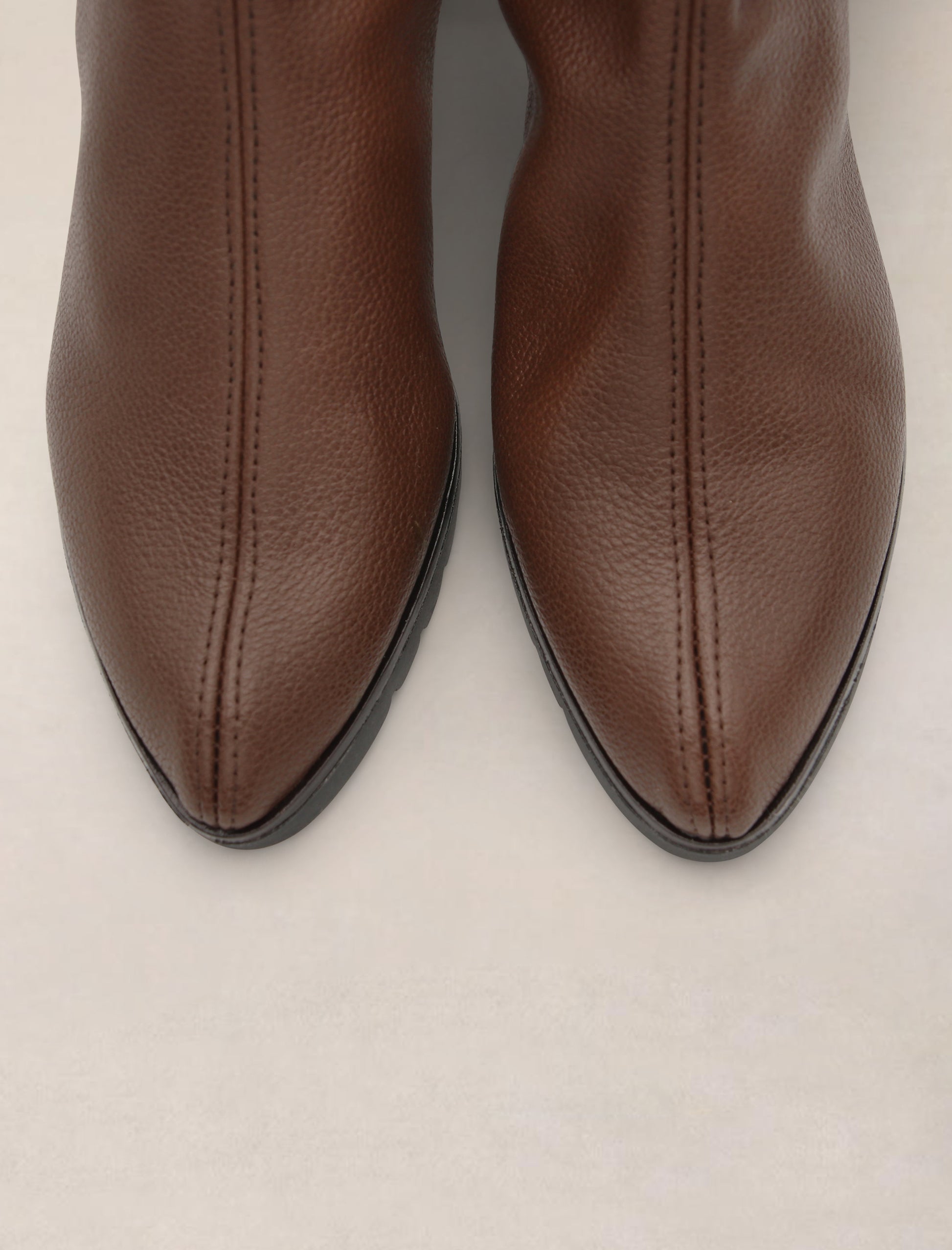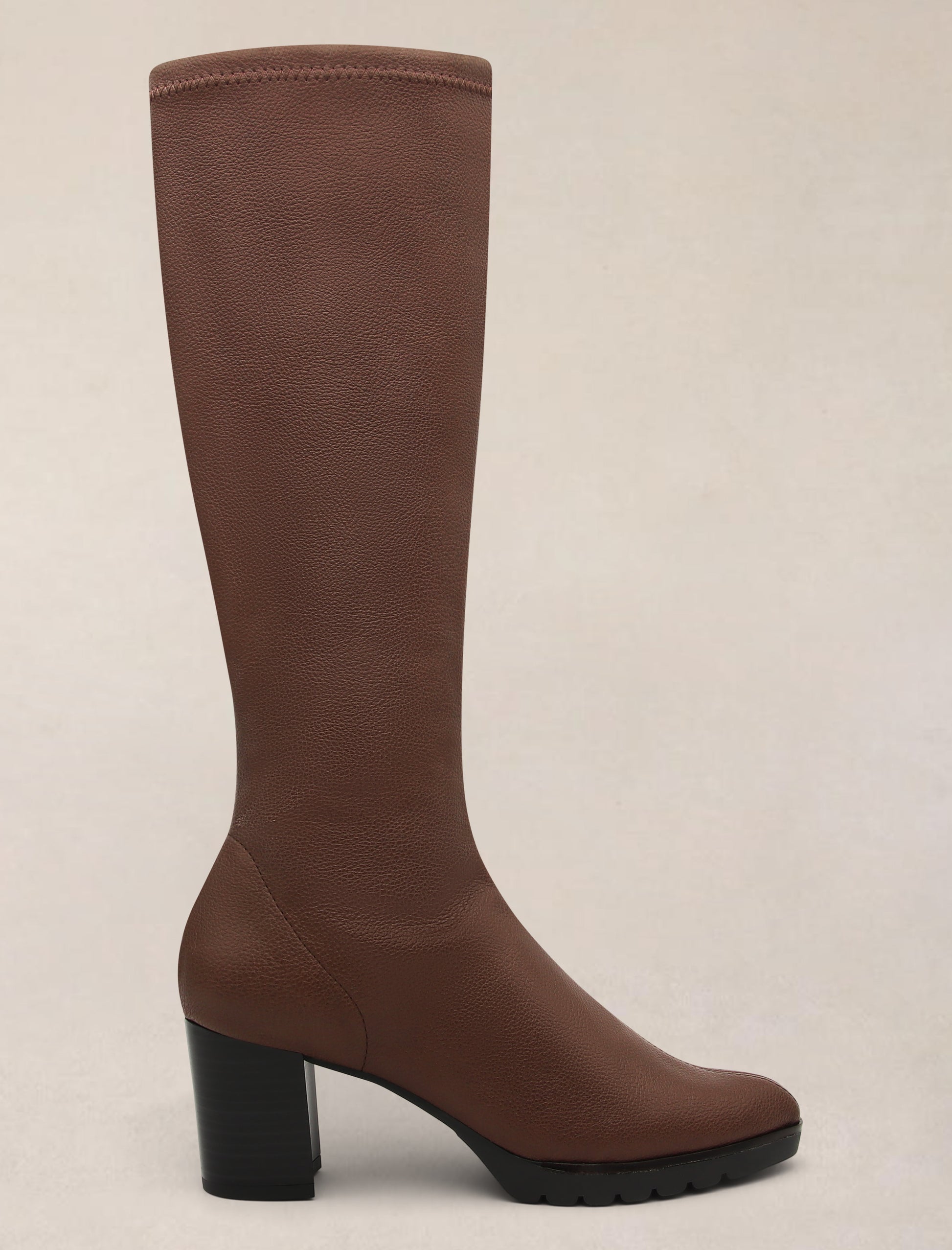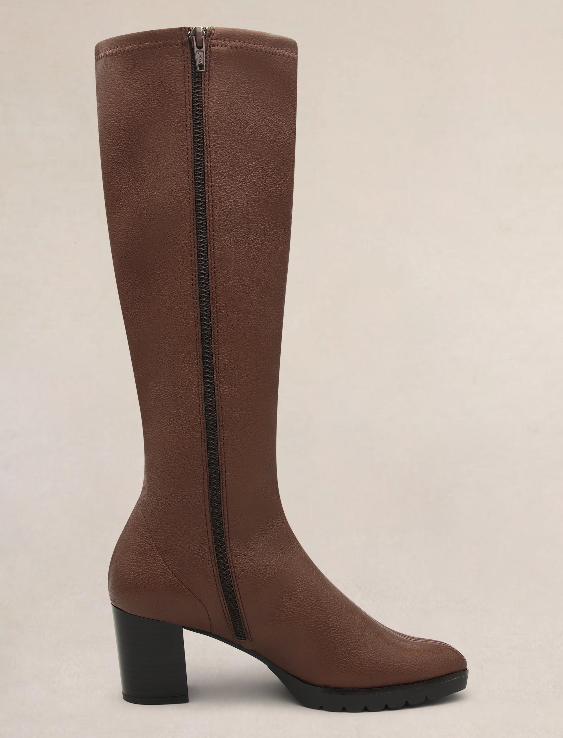 La Bota Fondo de Armario en color marrón chocolate es una de esas piezas que nunca pasan de moda. Su diseño atemporal la convierte en una aliada perfecta temporada tras temporada. Fabricada en licra efecto napa con cremallera interior, se adapta con suavidad a la pierna. Su tacón medio y plataforma logran el equilibrio ideal entre altura, comodidad y estabilidad.