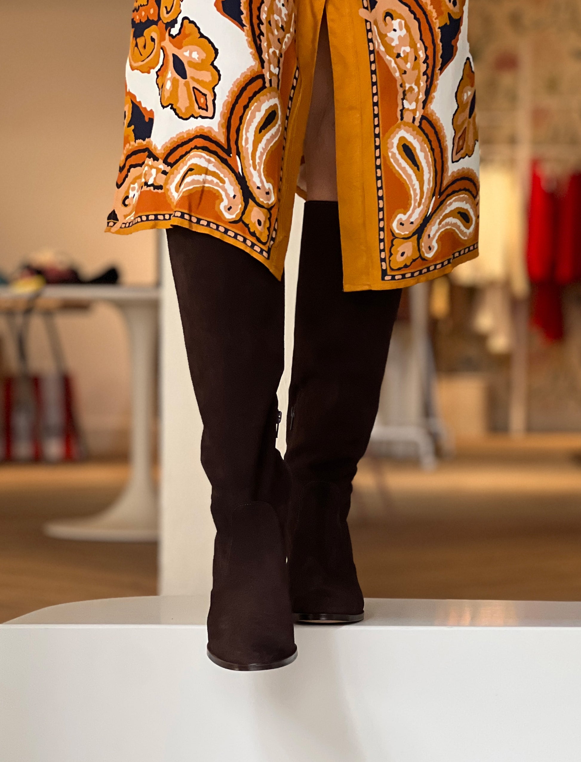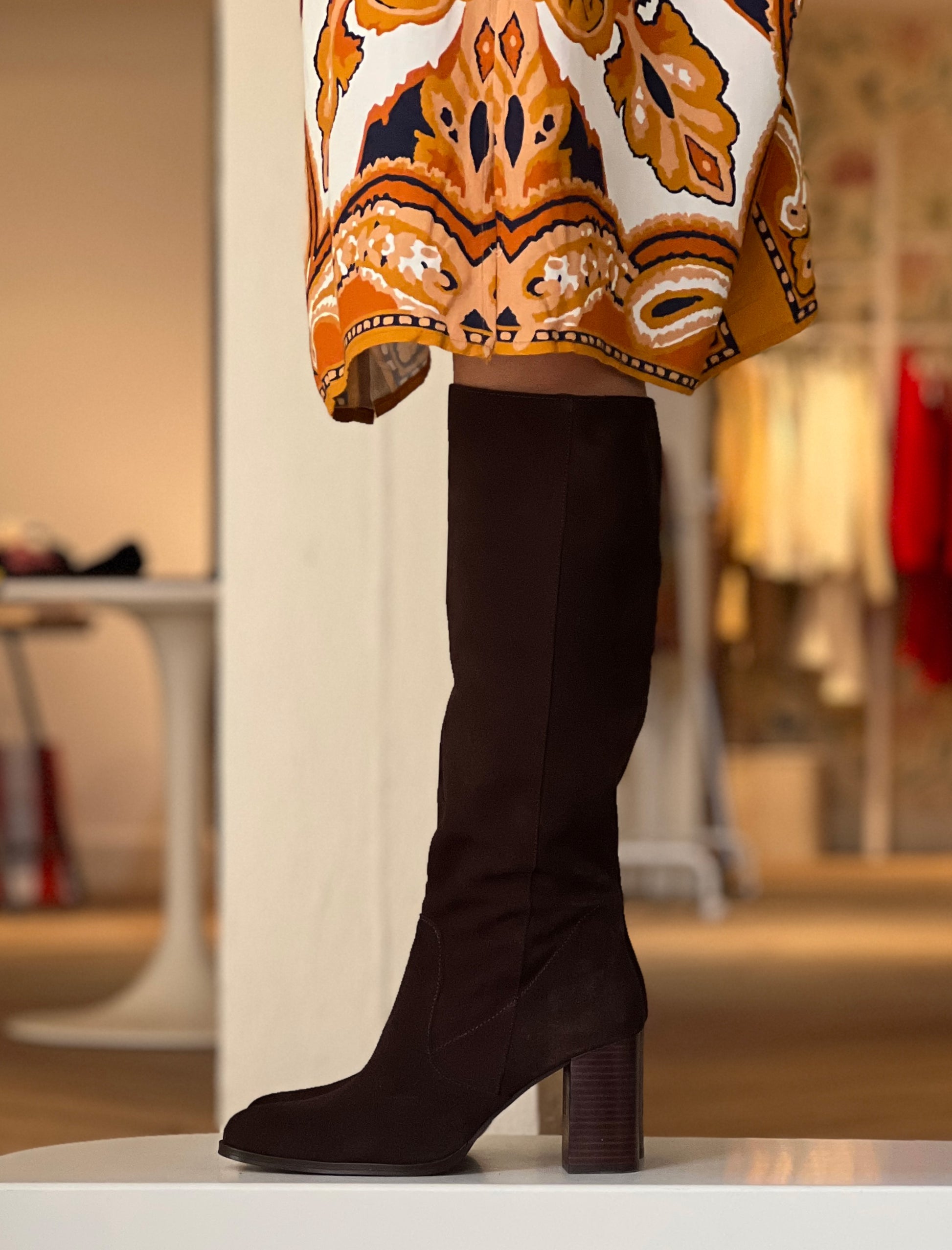 Bota Valeria Chocolate fabricada artesanalmente en España, destaca por su piel de alta calidad, su caña alta y su tacón ancho, que aporta altura con total comodidad. Su forma se ajusta al contorno de la pierna sin oprimir, realzando la silueta con elegancia. Ideal para acompañar los tonos otoñales y los estampados de la temporada, la Bota Valeria camel es una inversión segura: elegante, cómoda y muy favorecedora.