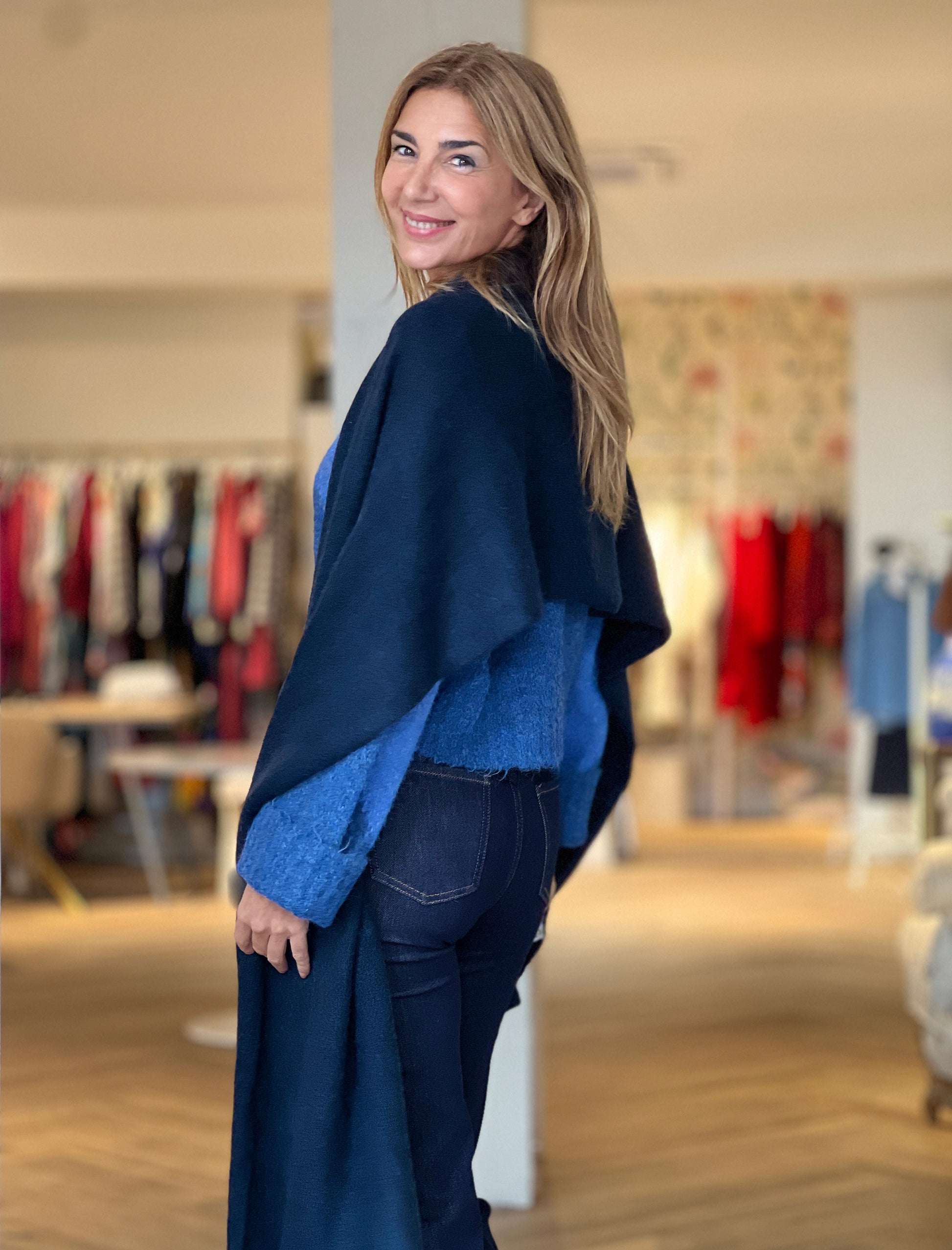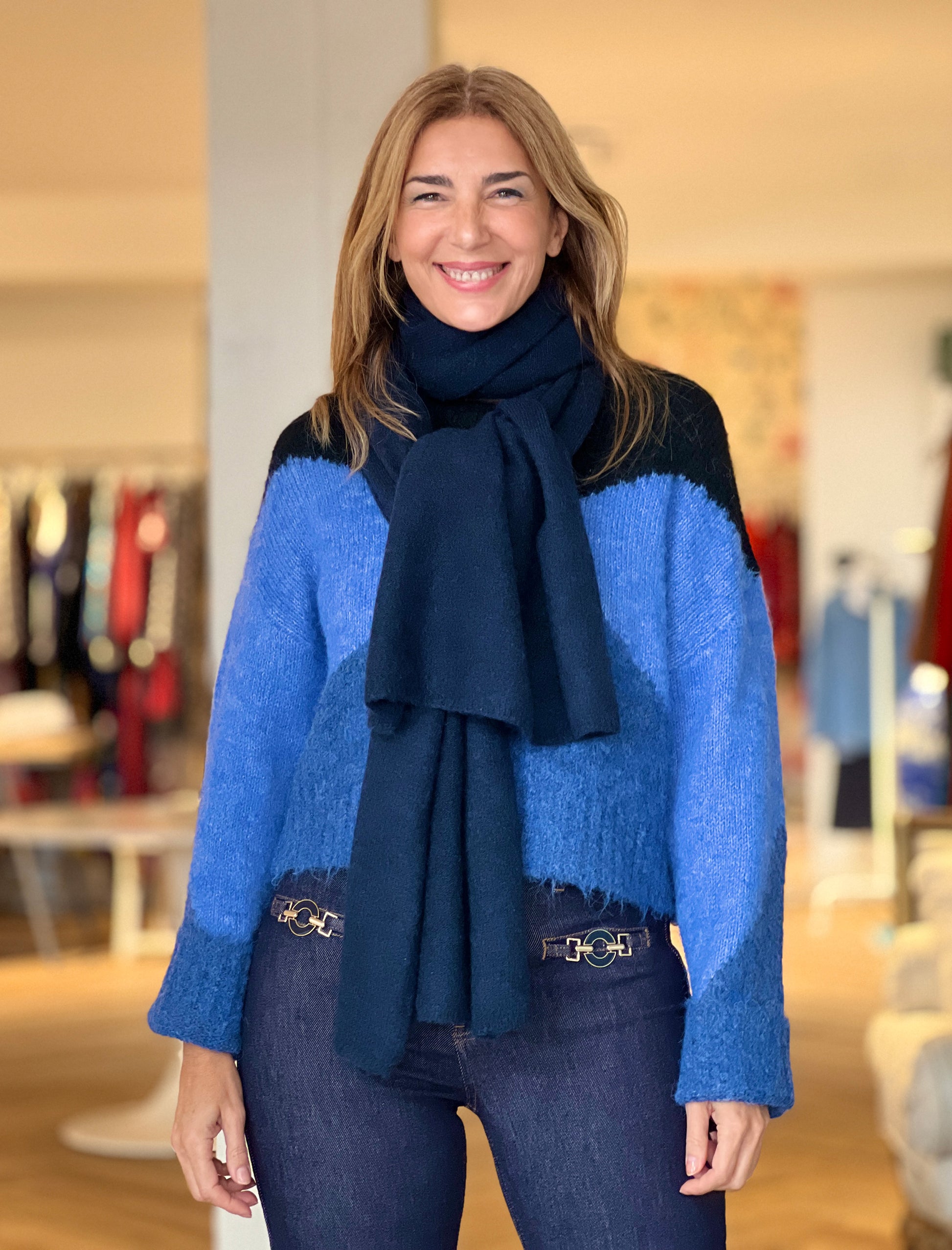 La Bufanda Suave para Todo en tono azul marino es ese complemento que no puede faltar en tu fondo de armario. Su tejido de tacto ultrasuave la convierte en la aliada perfecta para abrigarte con estilo sin renunciar a la elegancia. Su color marino, clásico y atemporal, combina con absolutamente todo. Una pieza sencilla, versátil y favorecedora que eleva cualquier look.