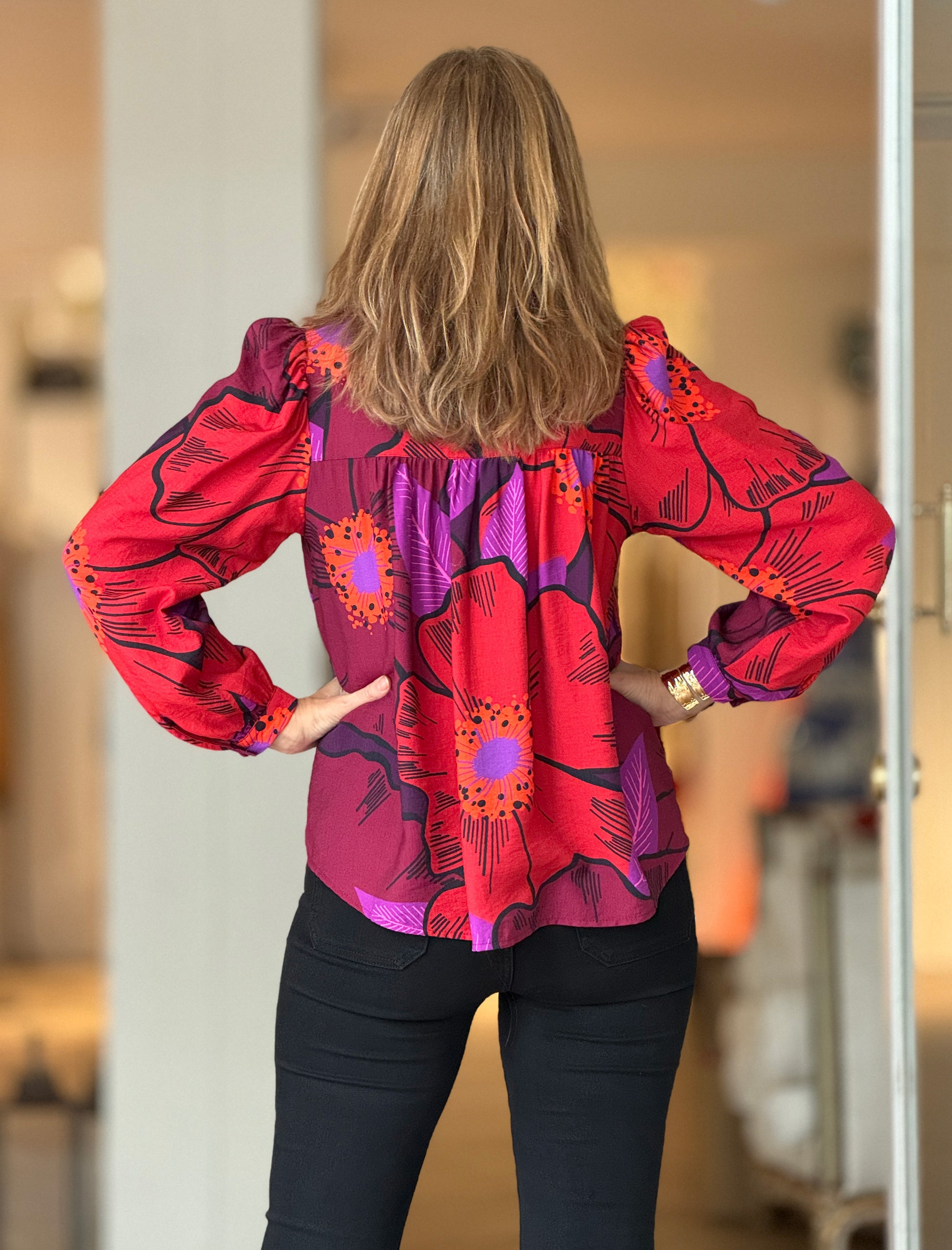 Esta camisa estampada fluida es de esas prendas que alegran cualquier look nada más verla. El contraste en tonos rojo, fucsia y morado con el dibujo floral grande la hace súper especial y muy favorecedora. La manga es larga, ligeramente abullonada y terminada en puño, lo que le da ese aire femenino y elegante que tanto me gusta. El tejido es ligero y con caída, así que no marca y sienta fenomenal.