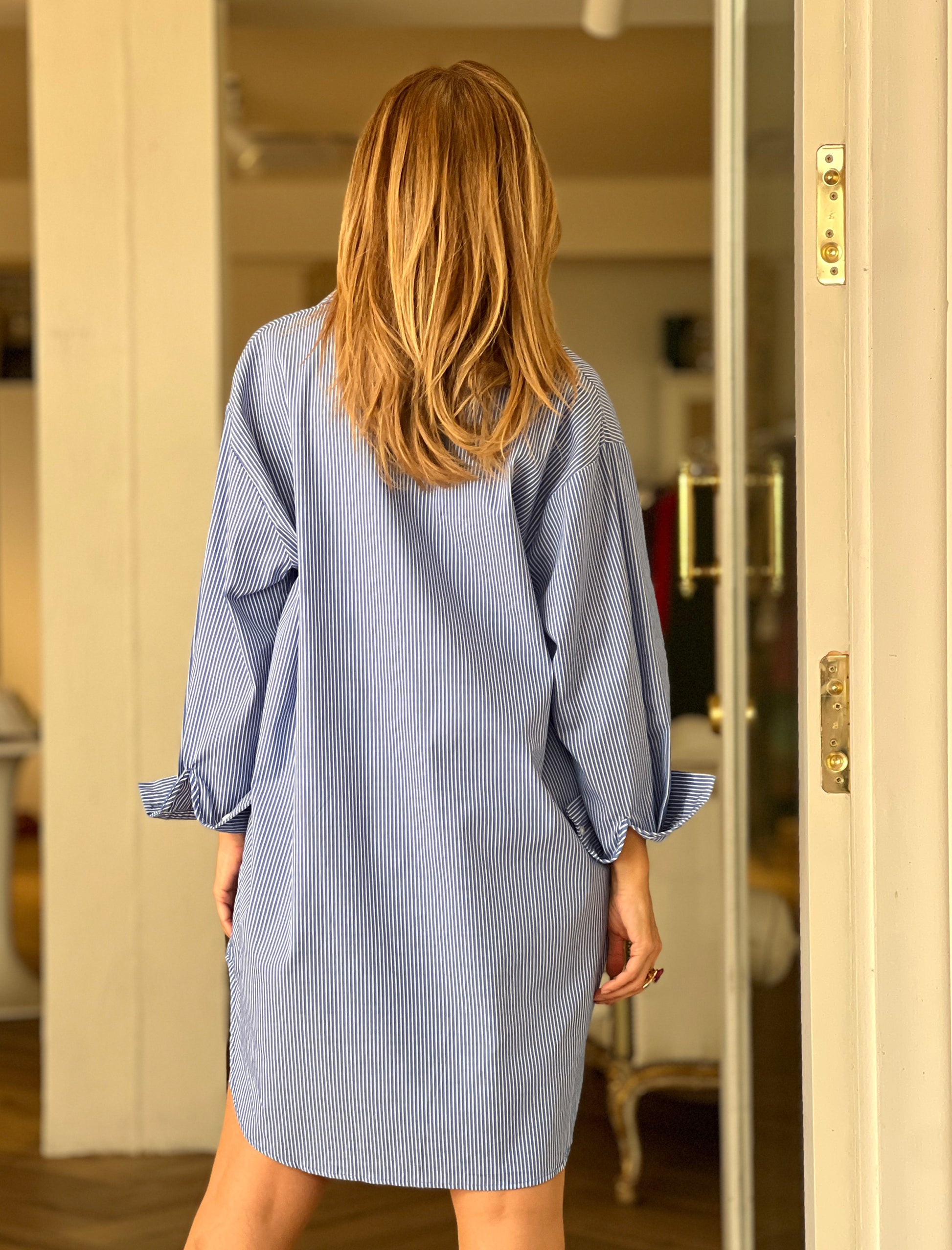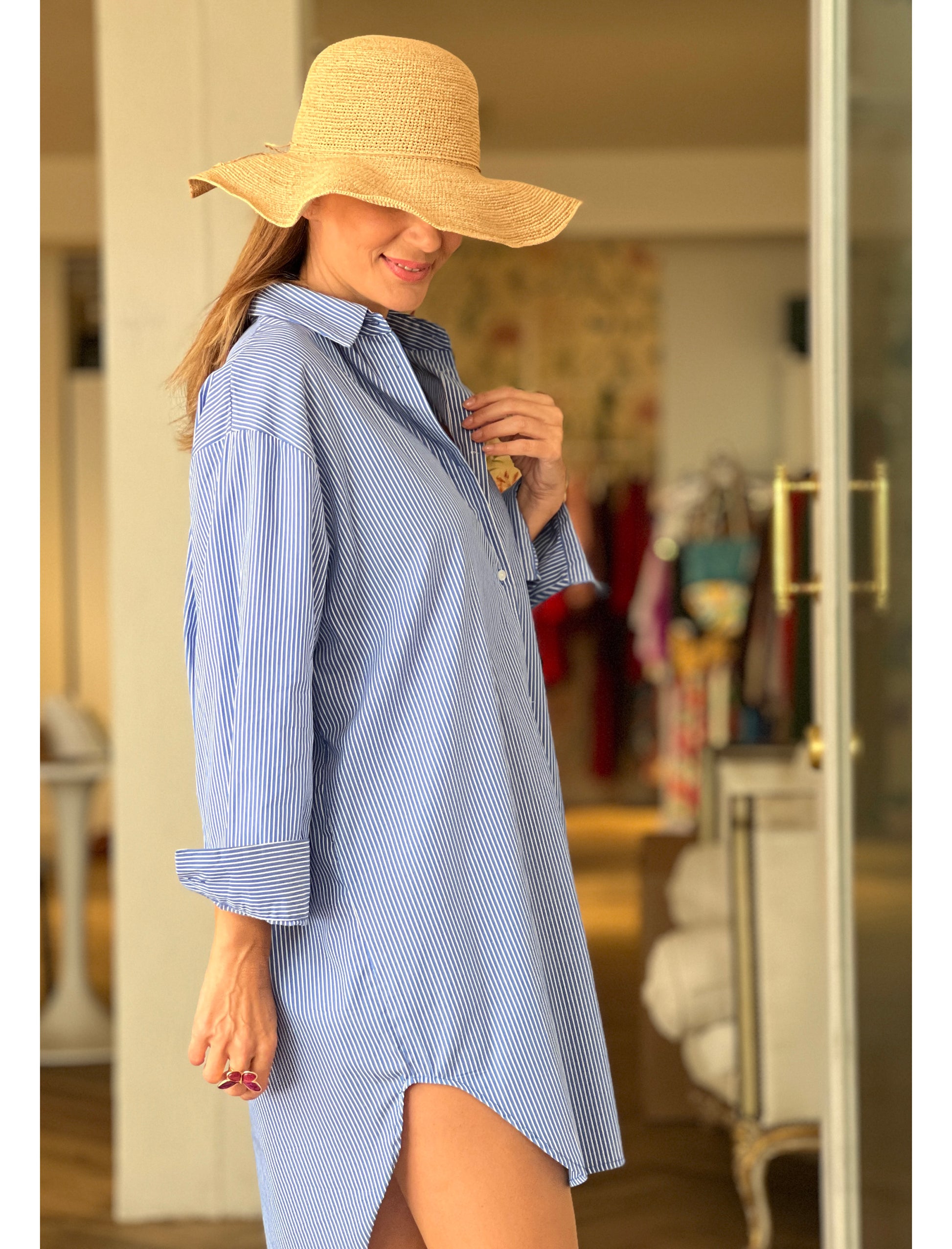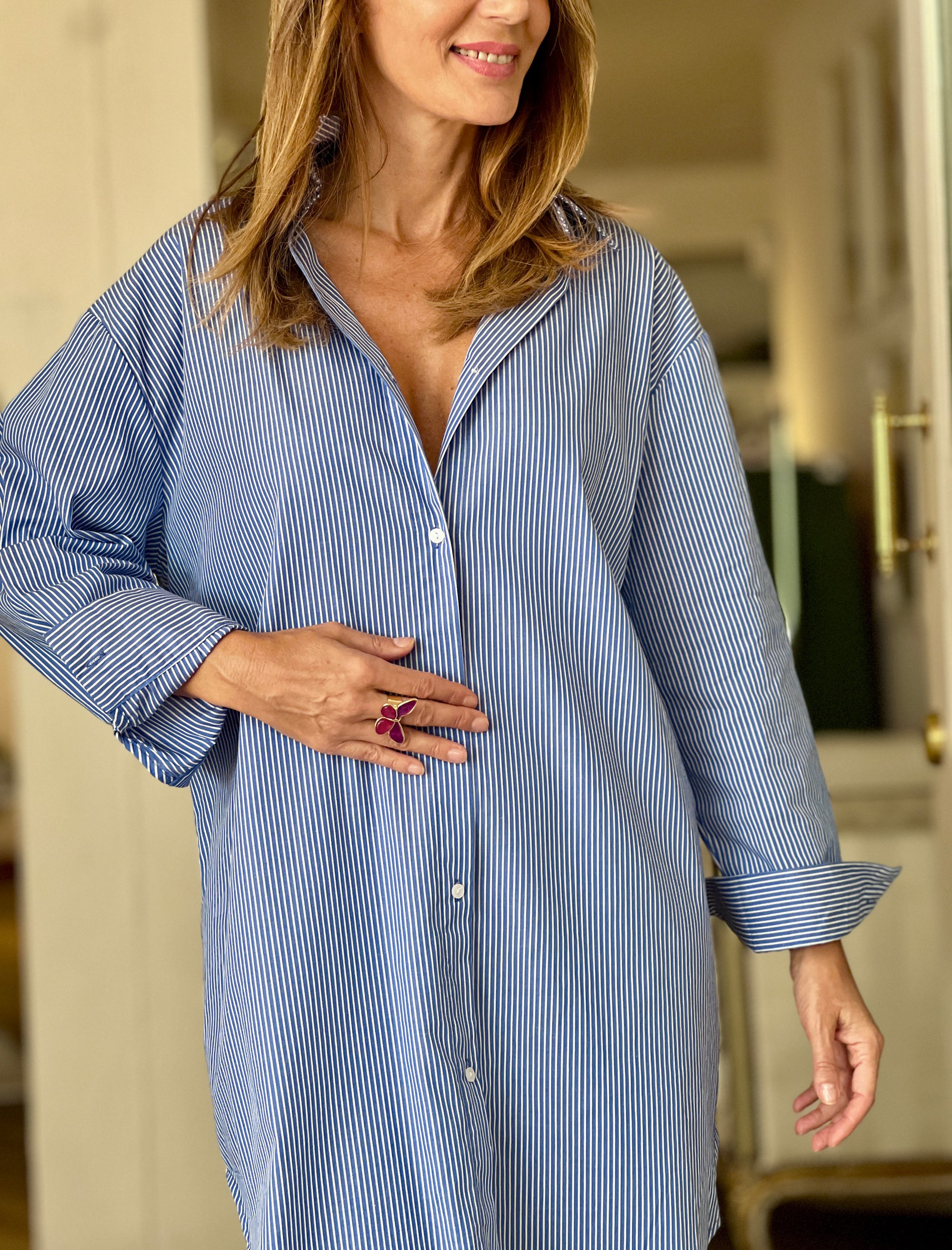 Camisa mil rayas azul celeste que aporta un aire fresco y favorecedor, perfecto para looks relajados pero con estilo. Corte amplio, cuello camisero y botonadura parcial en el escote.