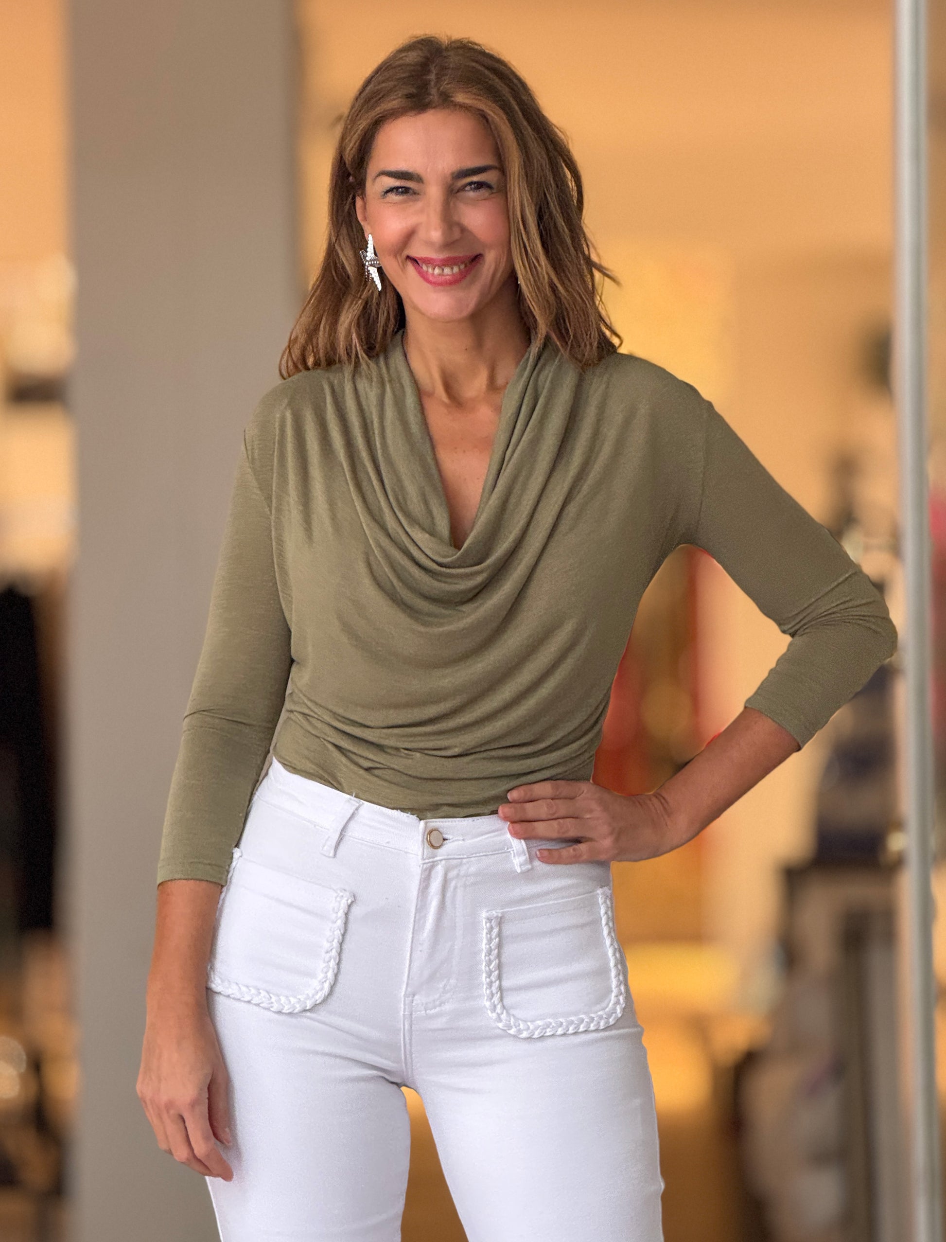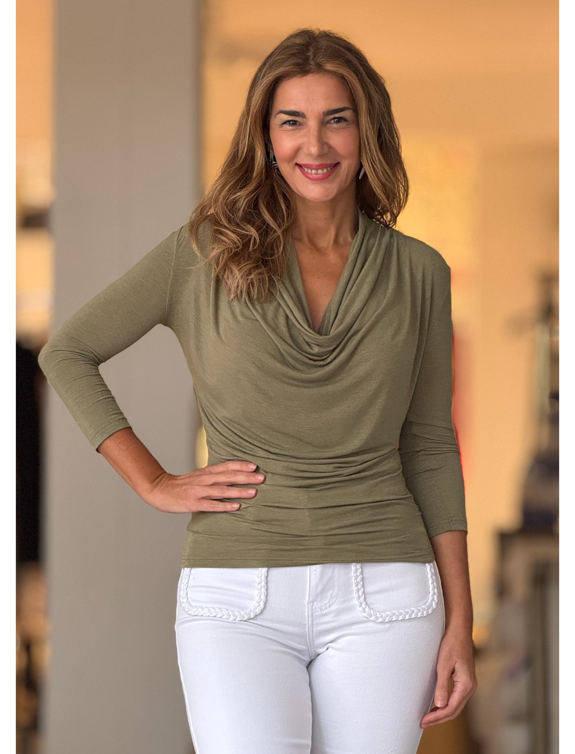Camiseta drapeada de viscosa caqui