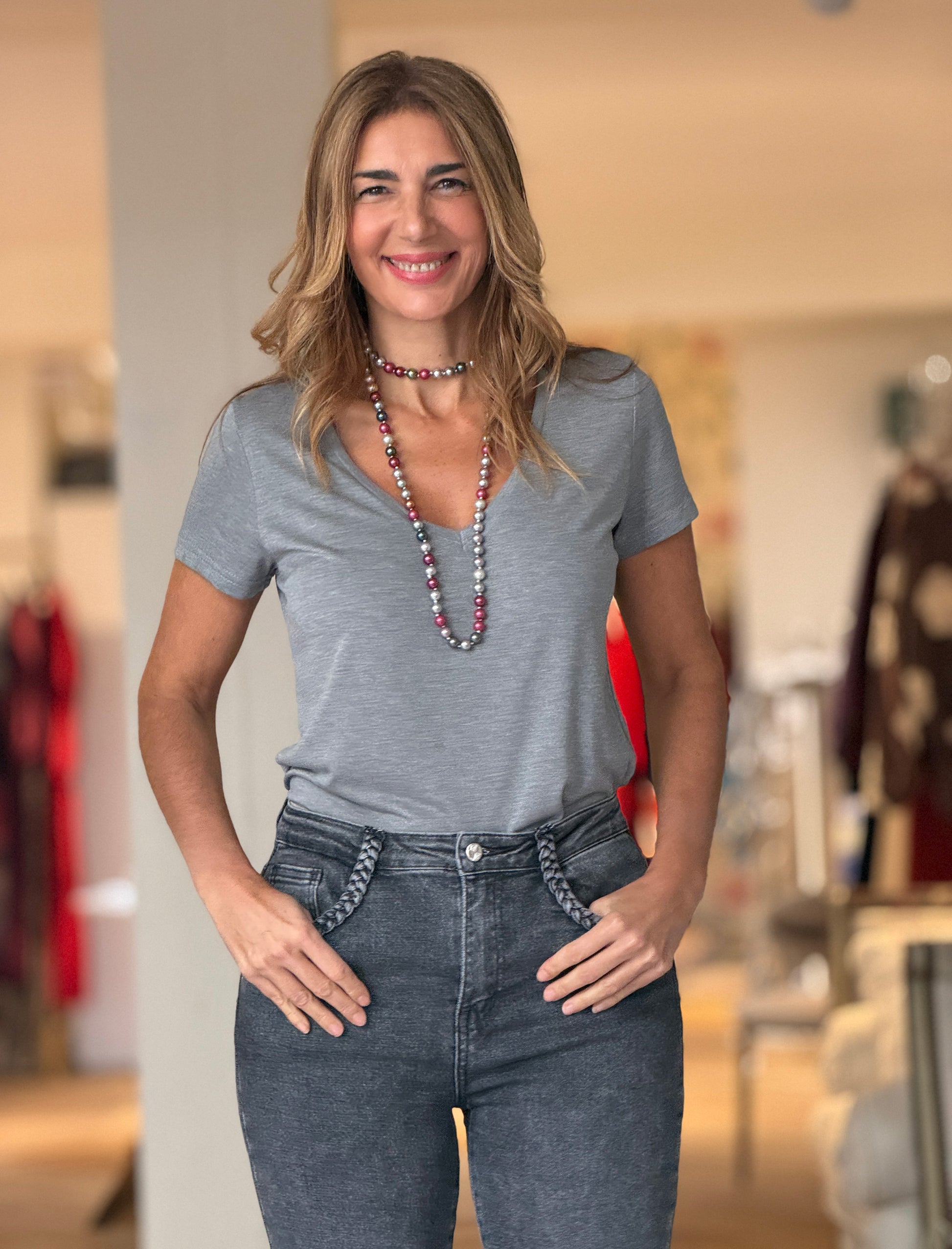 La Camiseta Fondo Chic Gris es la prenda básica y versátil que no puede faltar en tu armario. Garantiza comodidad y una caída perfecta. Su diseño atemporal la hacen ideal para combinar con infinidad de looks, desde casuales hasta más sofisticados.