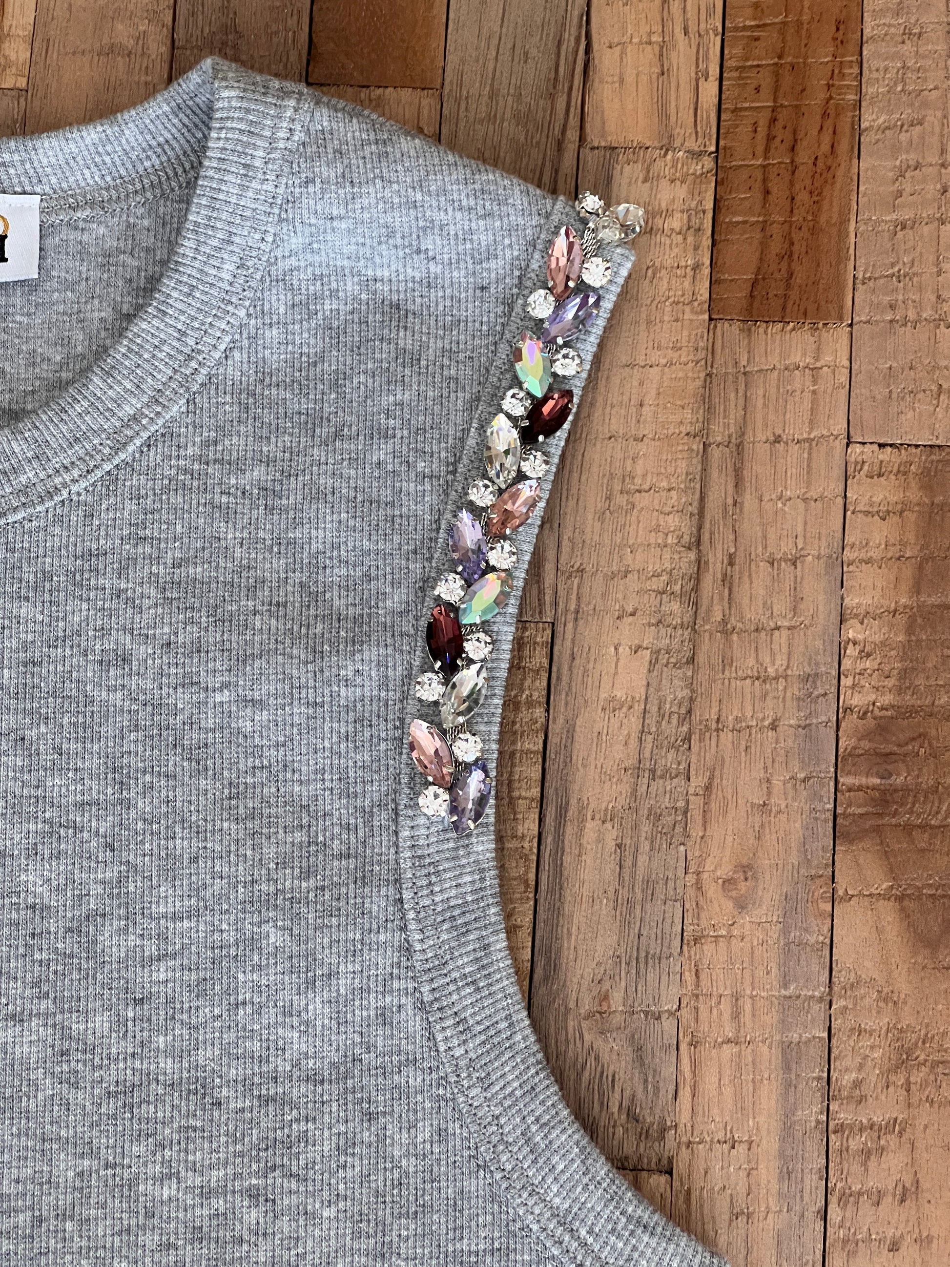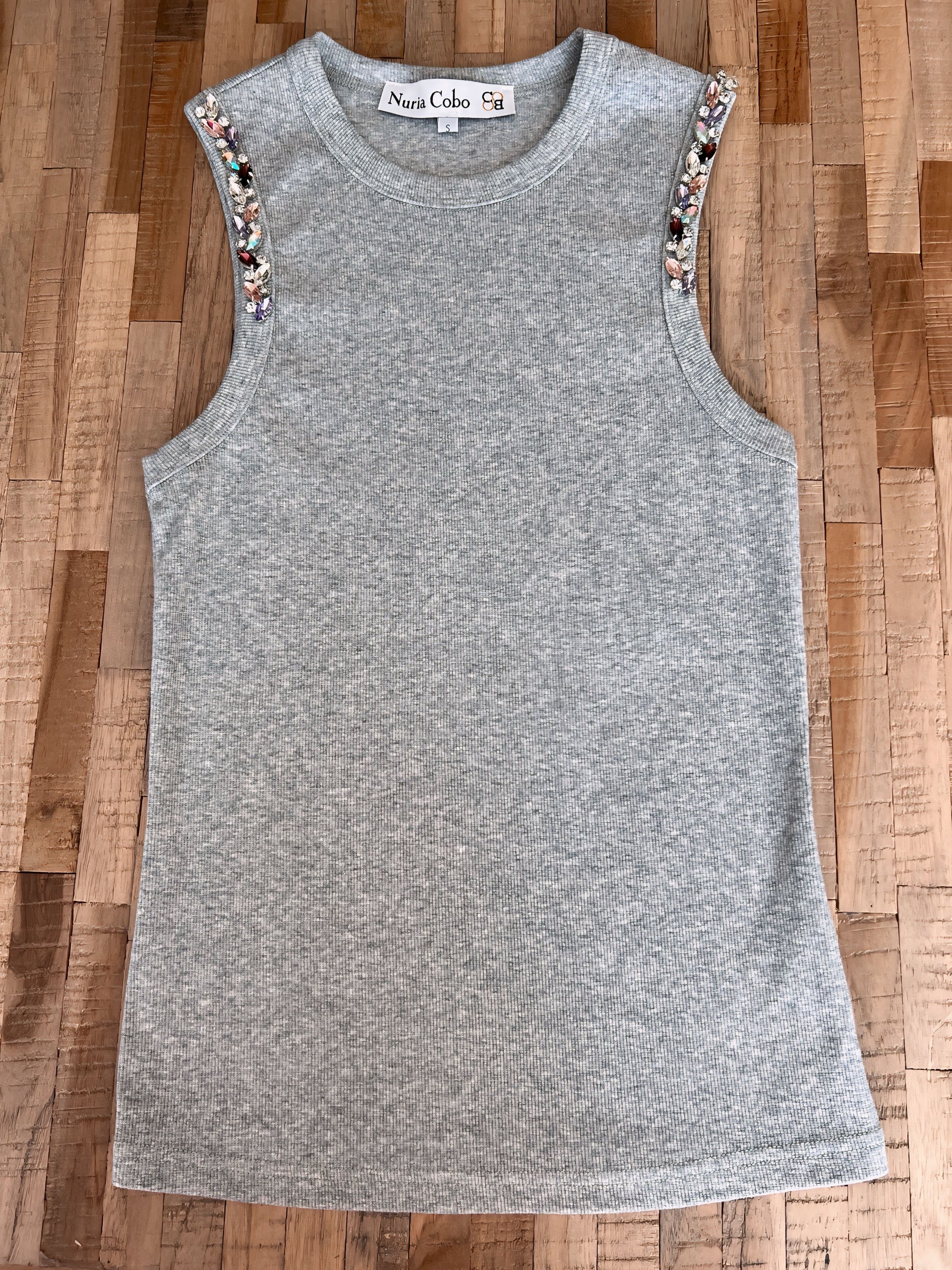 Camiseta sin mangas con cuello redondo clásico. Los hombros están adornados con circonitas de diferentes tonos, aportando un efecto joya luminoso. Ideal para combinar con jeans, pantalones palazzo o faldas fluidas.