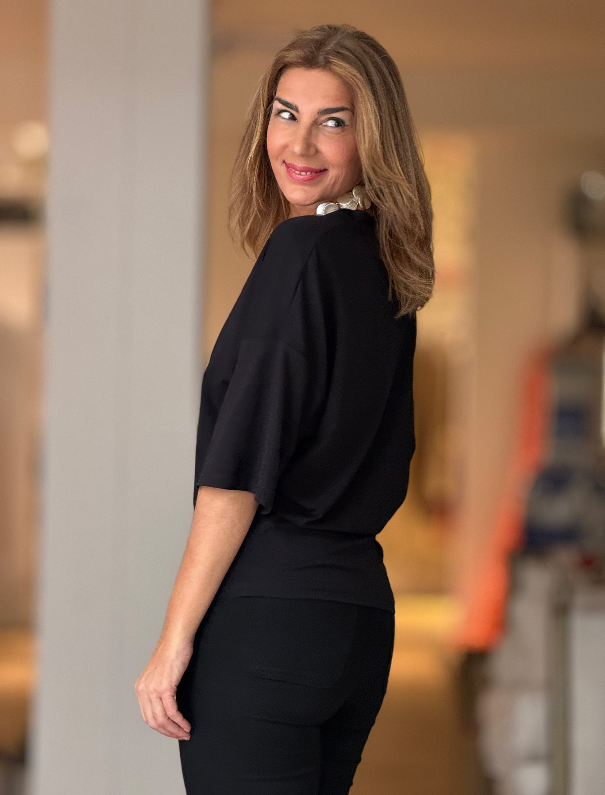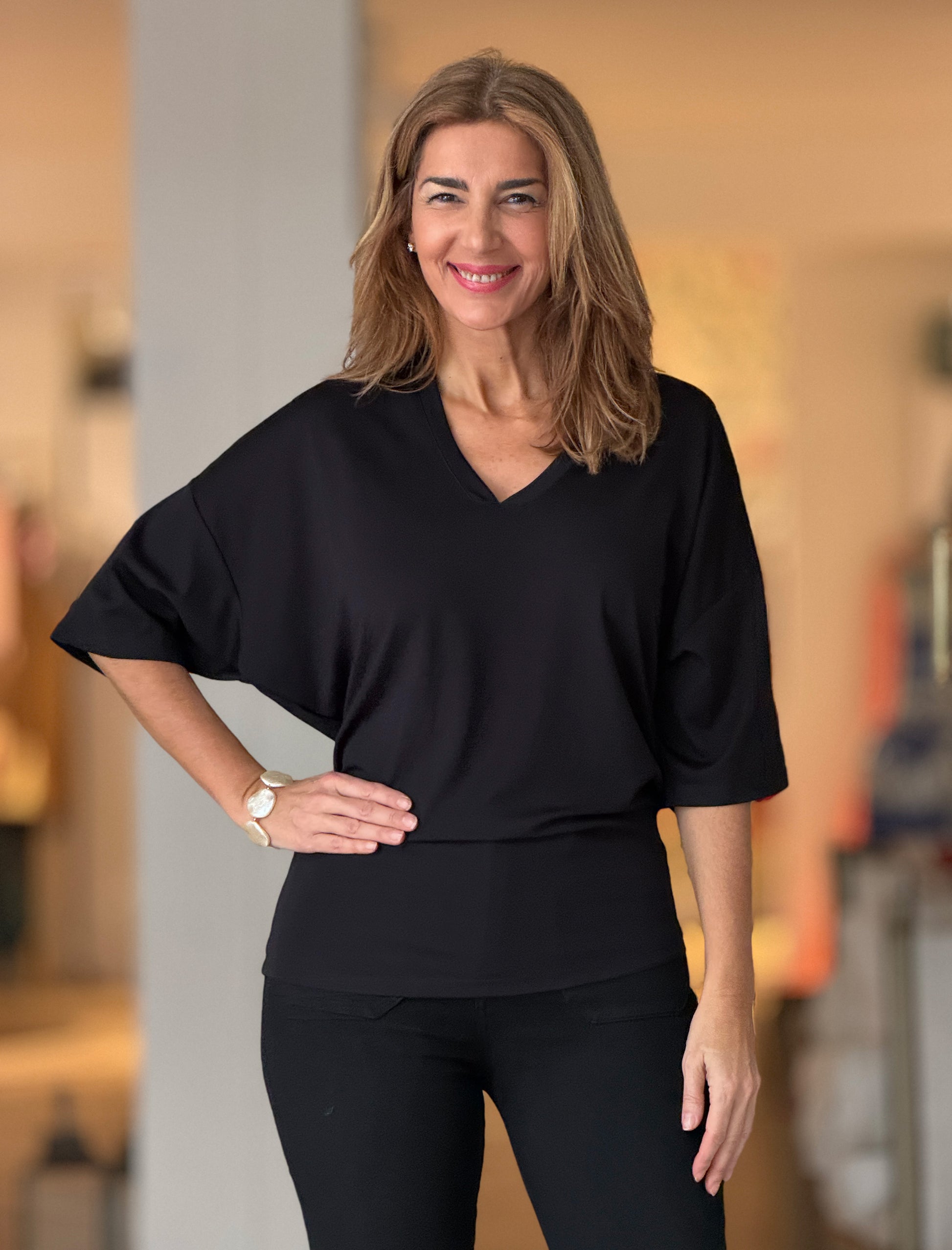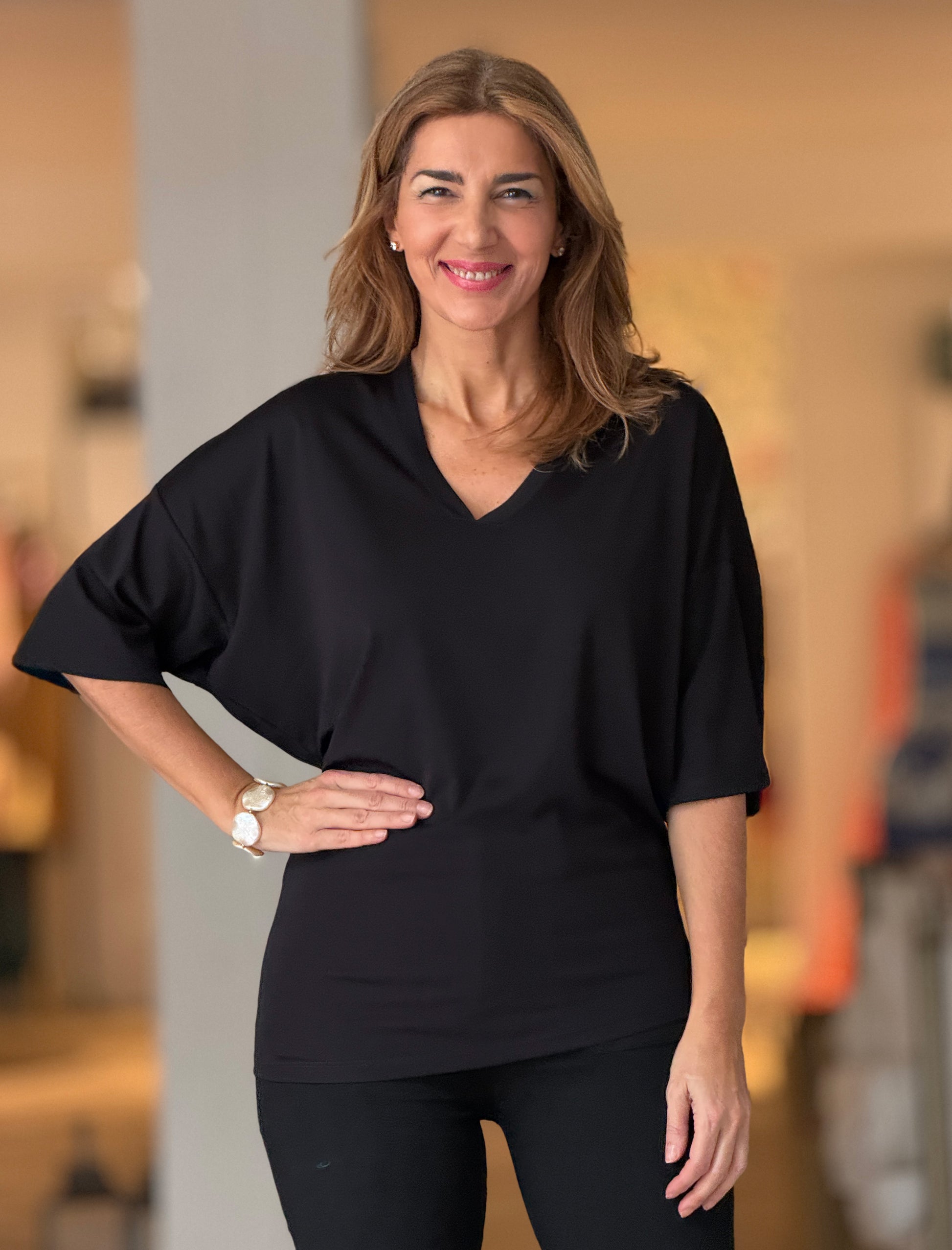 Esta camiseta negra de pico para mujer es un básico que te arregla cualquier look. Su escote en pico favorecedor alarga visualmente el cuello y su bajo ajustado permite que quede perfecta tanto por dentro como por fuera, marcando ligeramente la cintura sin apretar. Es perfecta si buscas una camiseta negra elegante, cómoda y versátil para el día a día, la oficina o incluso para una ocasión más arreglada.