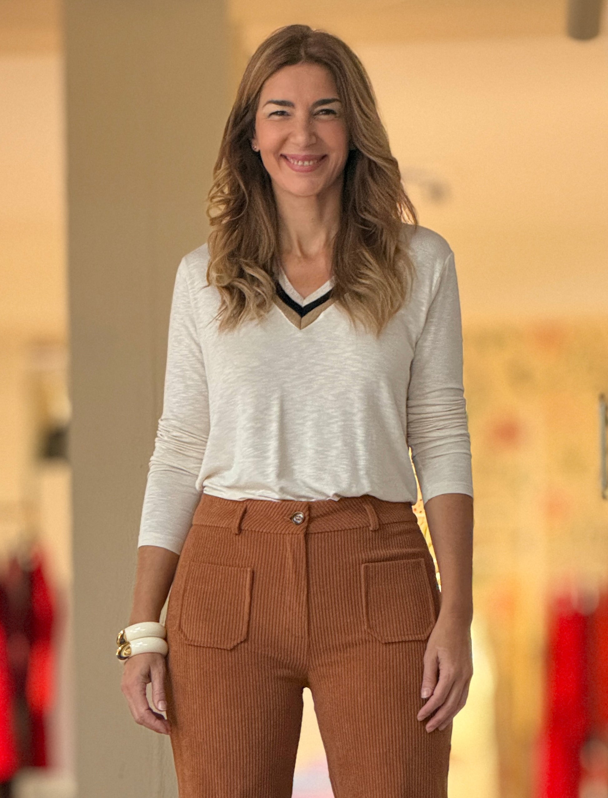 Camiseta Soy Cool beige de mujer está confeccionada en punto elástico de tacto suave, presenta un escote en V con ribete a contraste en dorado y beige aportando un aire moderno y luminoso, mientras que el corte recto y el largo medio la hacen perfecta tanto para llevar por dentro de pantalones como suelta.