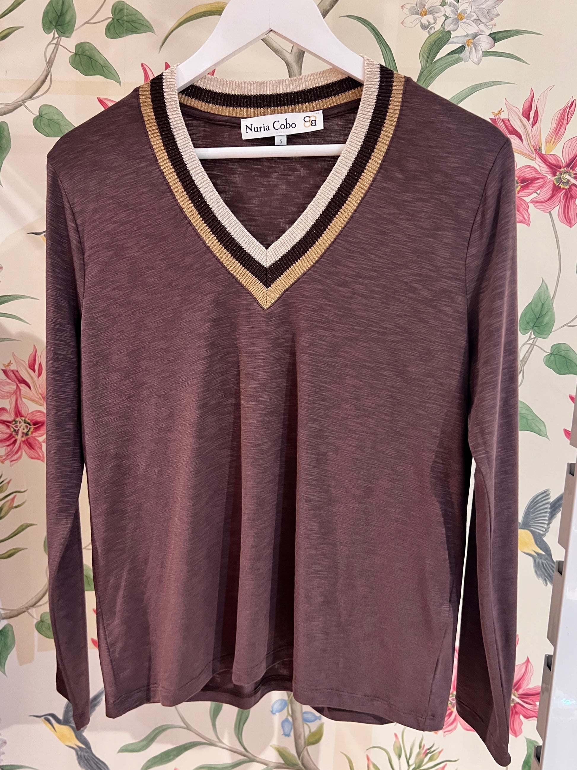 Camiseta Soy Cool marrón de mujer está confeccionada en punto elástico de tacto suave, presenta un escote en V con ribete a contraste en dorado y beige aportando un aire moderno y luminoso, mientras que el corte recto y el largo medio la hacen perfecta tanto para llevar por dentro de pantalones como suelta.