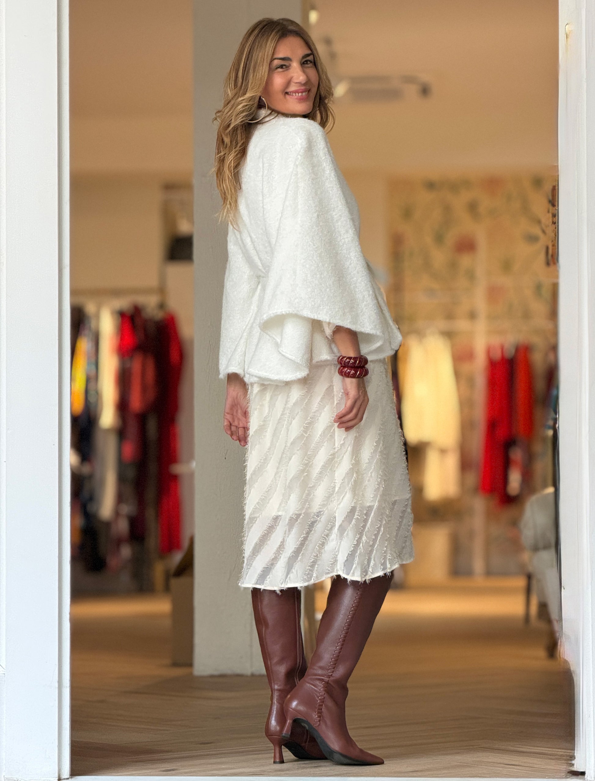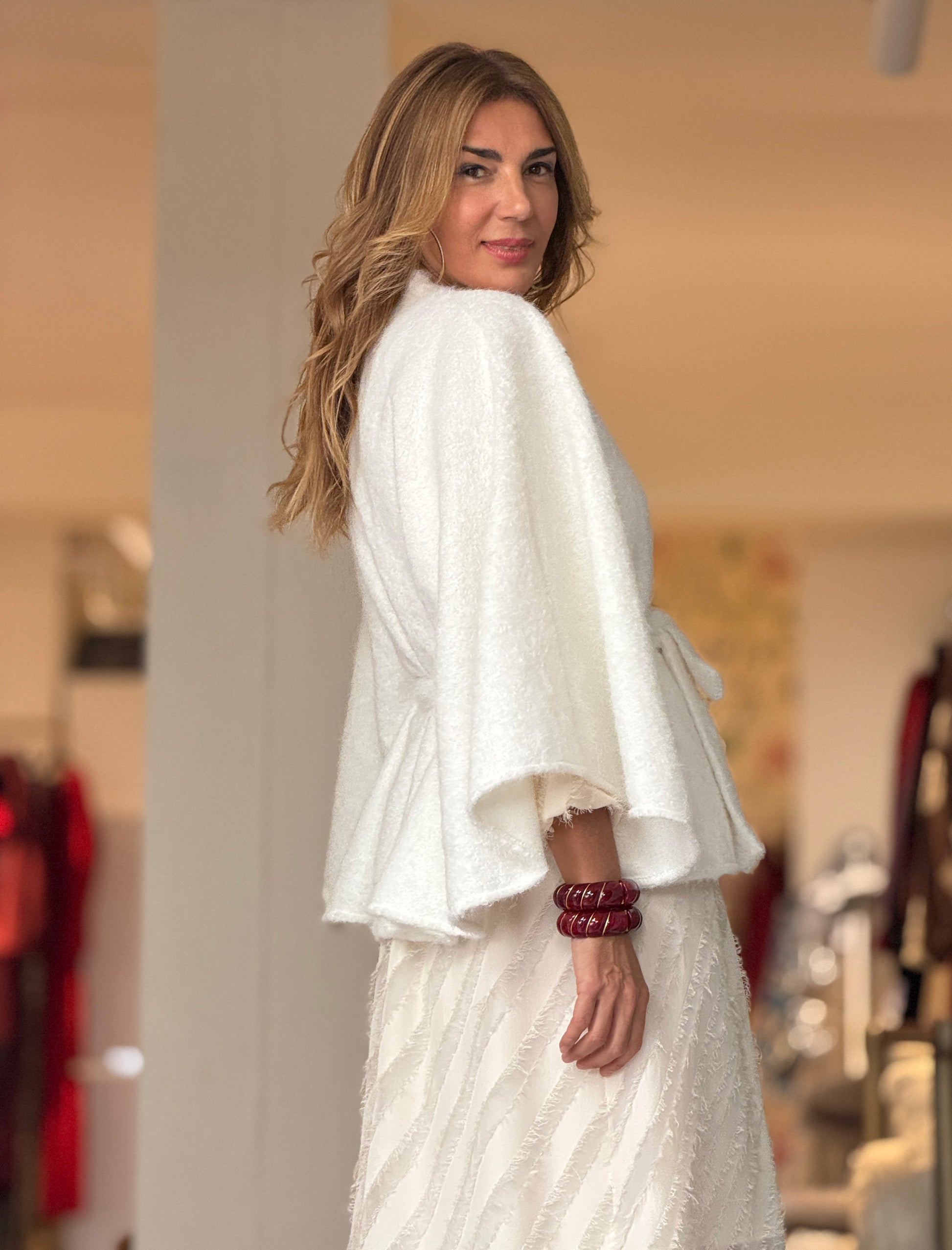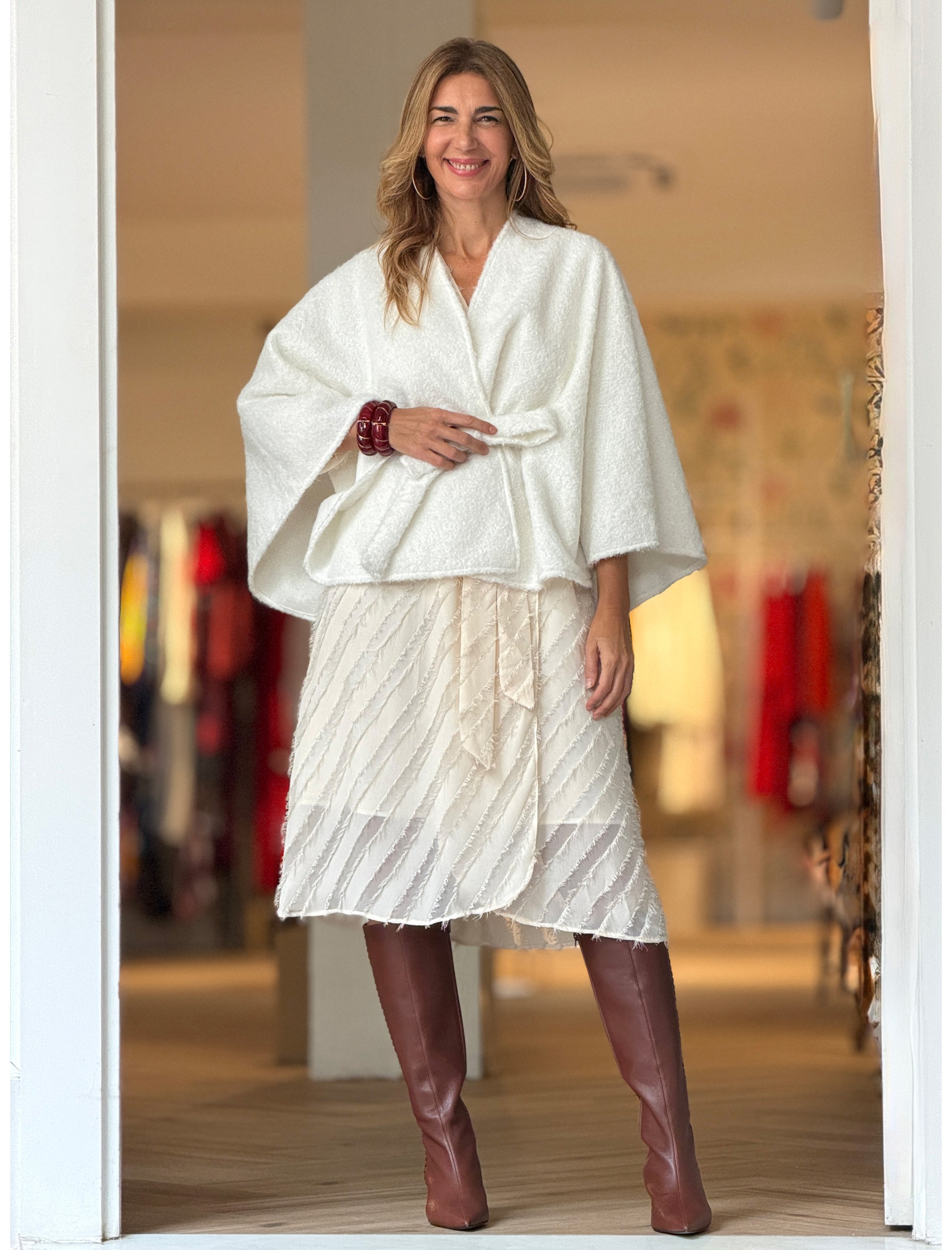 La Capa con cinturón suave blanca es la prenda perfecta para elevar tus looks con estilo y comodidad. Su diseño de corte amplio y mangas tipo capa aporta un movimiento fluido y elegante, mientras que el cinturón ajustable permite definir la cintura y crear una silueta favorecedora. El tejido es muy suave al tacto, cálido y ligero, ideal para el entretiempo o para combinar sobre tus básicos favoritos.