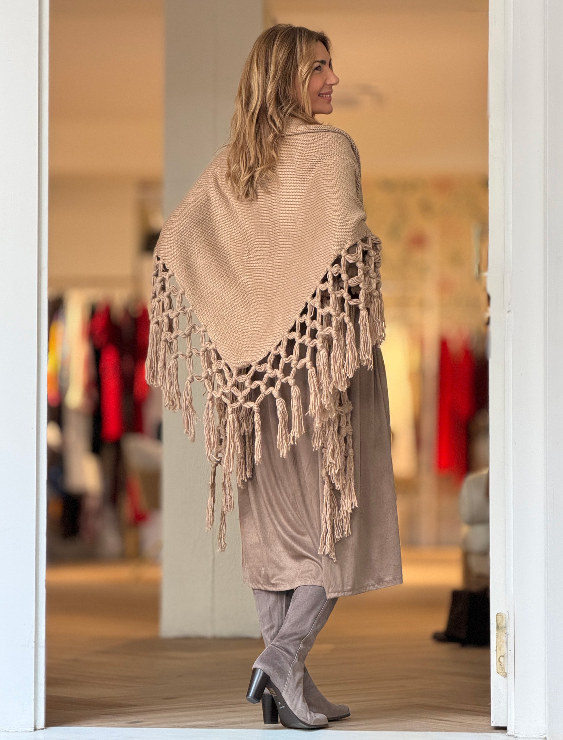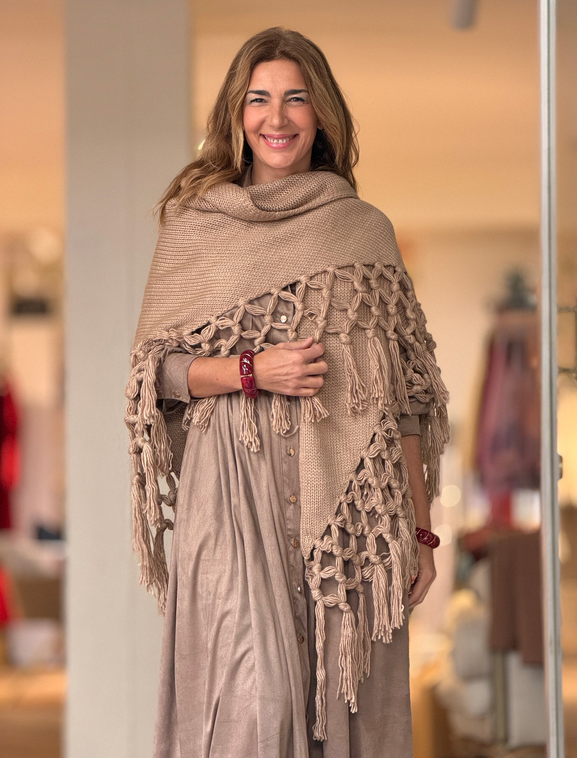 Capa ideal Elsita camel es el accesorio perfecto para elevar cualquier look con un aire sofisticado y bohemio. Ideal para combinar tanto con vestidos como con pantalones. Los flecos le dan un toque actual y desenfadado, mientras que la mezcla de lana y acrílico garantiza suavidad y comodidad.