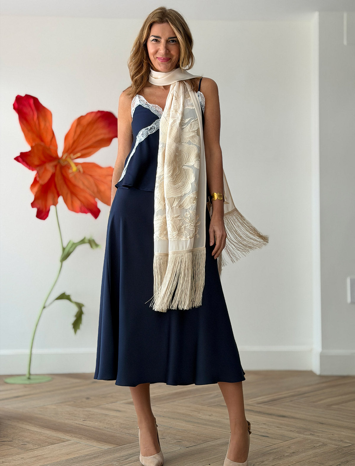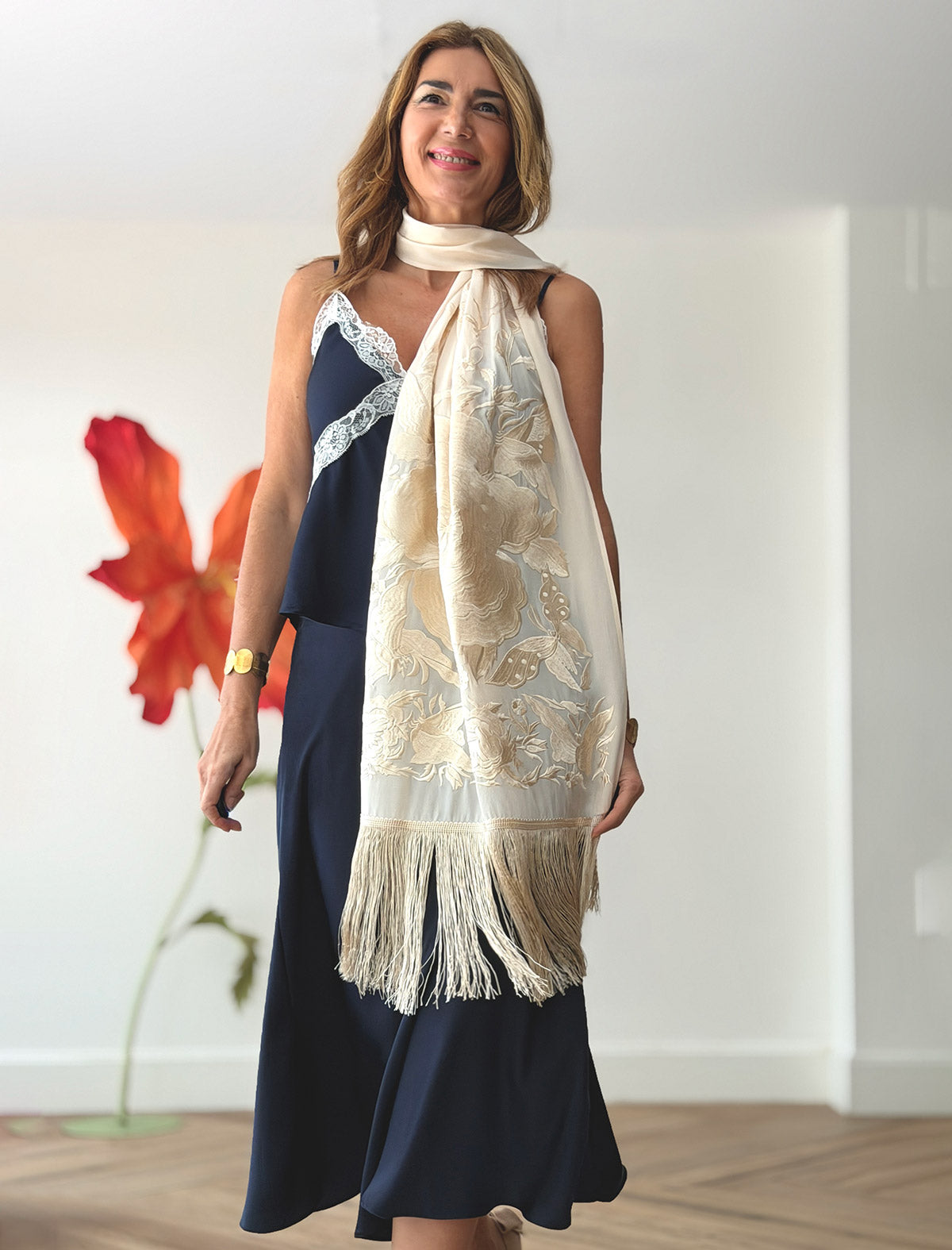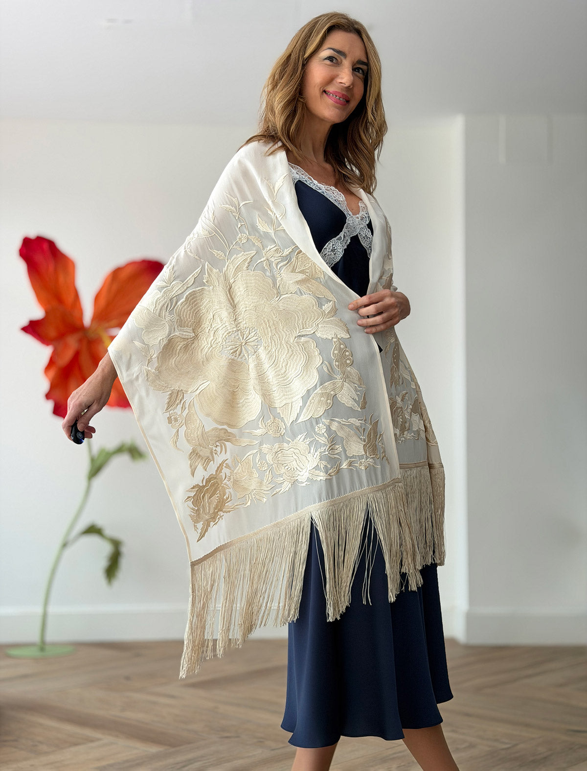 El Chal Bordado Maravilloso en color crema de la colección "Made in Nuria" es una pieza llena de luz, delicadeza y belleza. Su tejido vaporoso con bordados florales aporta un toque sofisticado, ideal para completar looks de invitada, vestidos lisos o conjuntos de ceremonia.