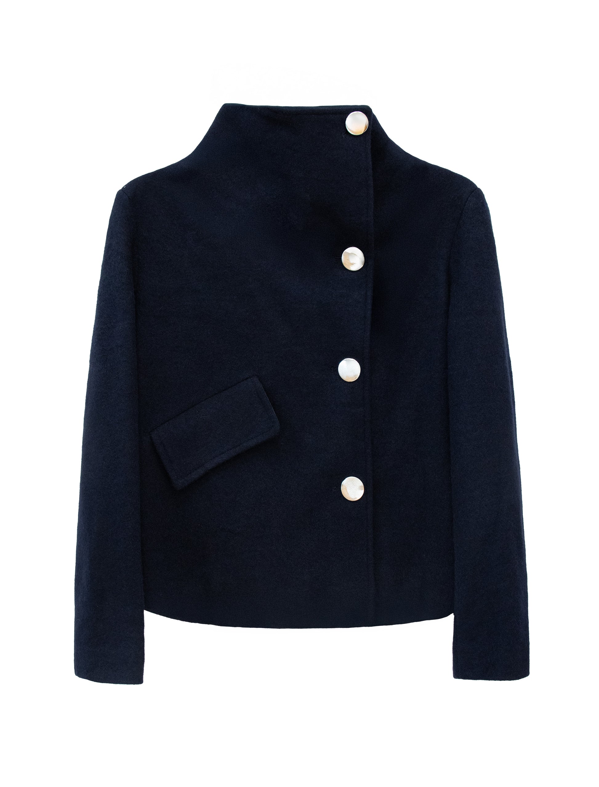 Chaqueta supersuave de botones negro con cierre frontal de botones metálicos plateados y cuello tipo chimenea. Diseño recto con manga larga. Es una de nuestras prendas icónicas por su versatilidad y estilo. Puedes llevarla abierta para un look relajado o cerrarla hasta el cuello chimenea para un aire más favorecedor y sofisticado. Ideal para combinar con pantalones, faldas o vestidos, perfecta para elevar tus looks del día a día.